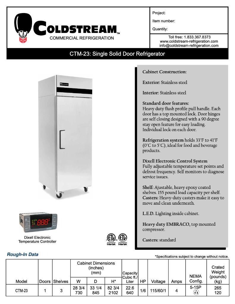 Coldstream Single Door Reach-in Vertical Cooler - Model: CTM-23 (BRAND NEW IN CRATE)
