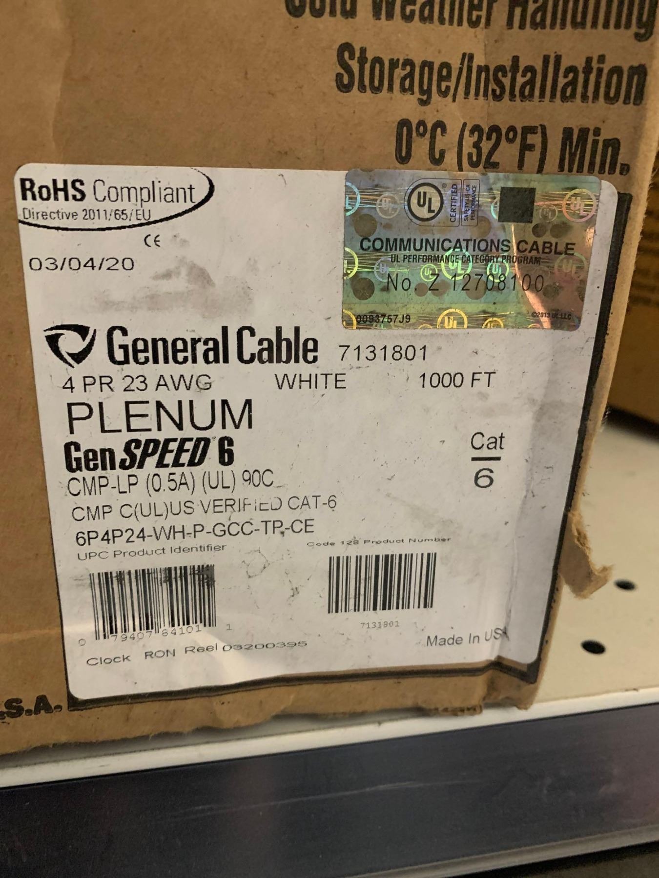 Communications Cable 4 PR 23 AWG White 1000' Plenum GenSpeed 6