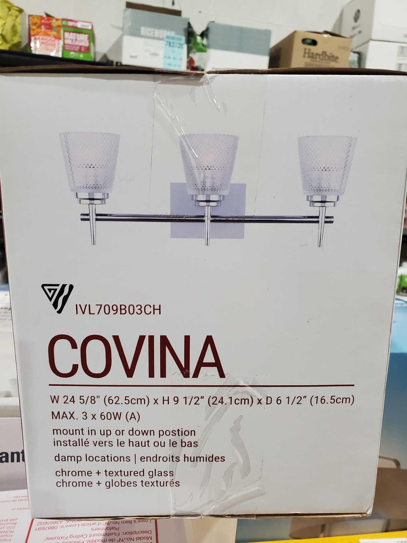 Covina Vanity Fixture mount in up or down position 24 5/8"w x 9 1/2"h x 6 1/2"d Chrome & textured Glass