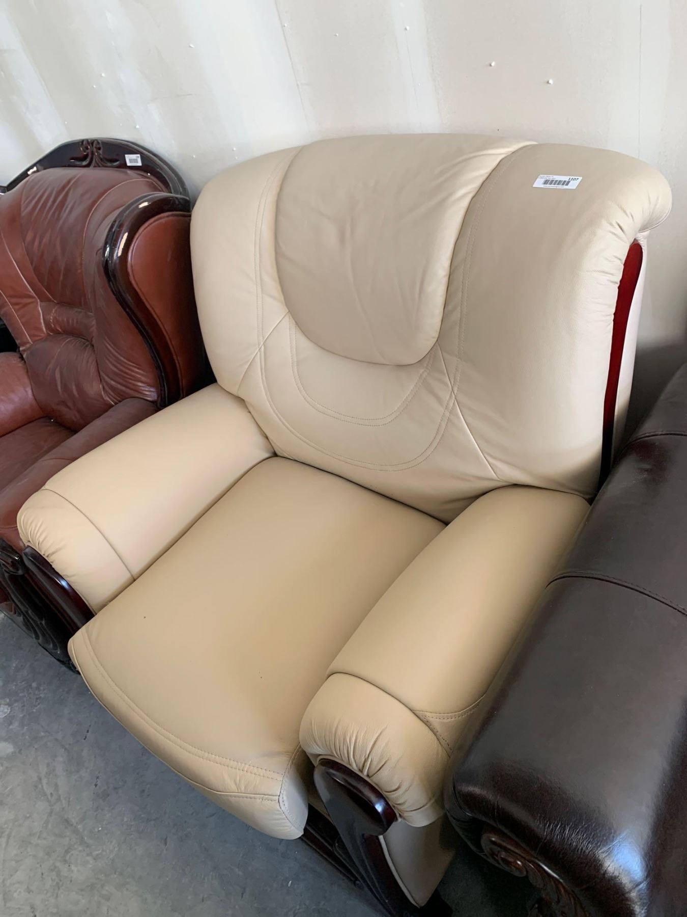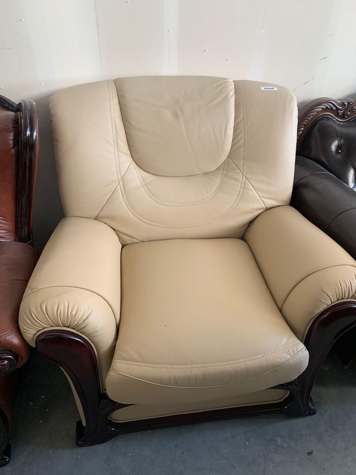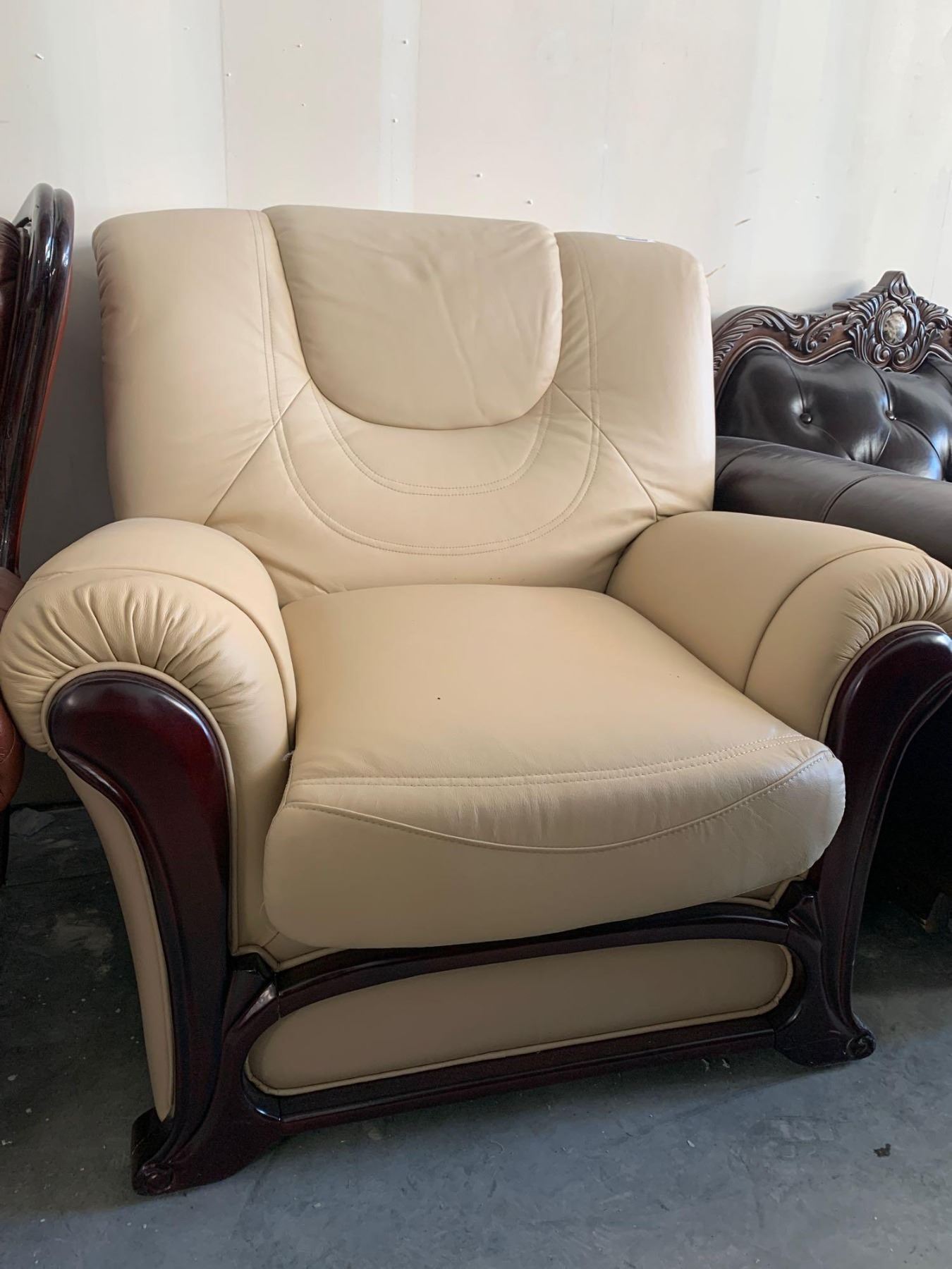Cream Bonded Leather wood trimmed arm chair FLOOR DISPLAY MODEL- pick up Dec. 30 from 9-3, off site location 4231-109 AVE NE