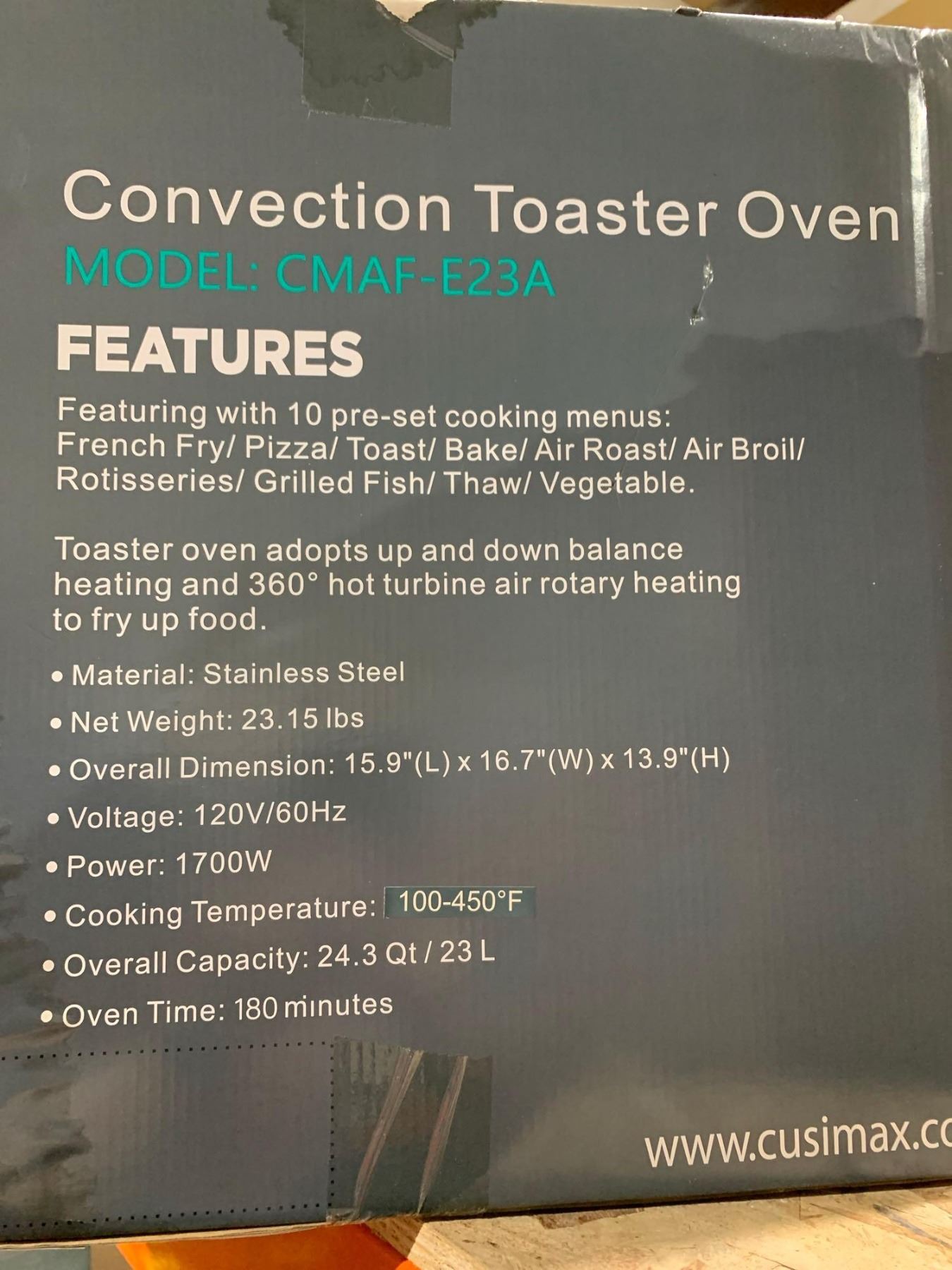 Cusimax Air Fryer Oven Model CMAF-E23A Convection Toaster Oven