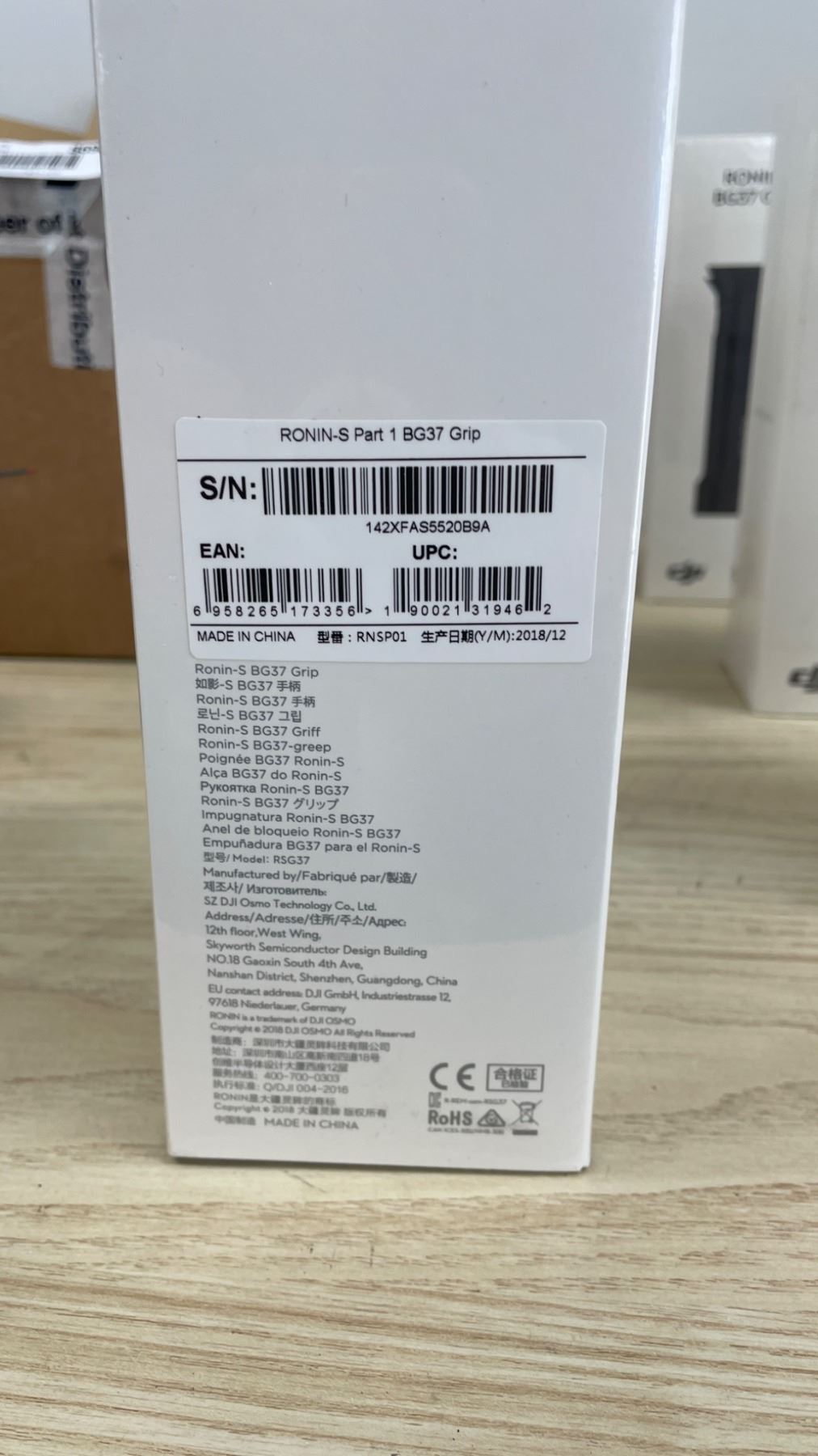 The DJI Ronin-S BG37 grip is a battery grip designed for the DJI Ronin-S gimbal. Compatible with various DJI setups, the BG37 model provides power for extended use, enhancing stabilization performance. Item includes details like S/N: 12FFAAXX0208AA and EAN: 6958265176594. Please refer to technical markings for additional specifications.