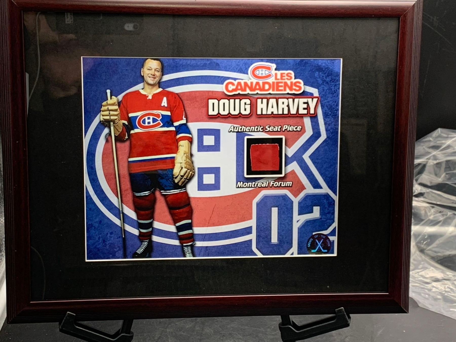 DOUG HARVEY #2 - COLLECTOR FRAMED PICTURE WITH FORUM SEAT PIECE: issued by: GREATS OF THE GAME, ITEM SIZE IS 12.5" X 15", PROFESSIONALLY FRAMED AND MATTED, WITH CERTIFICATE OF AUTHENTICITY