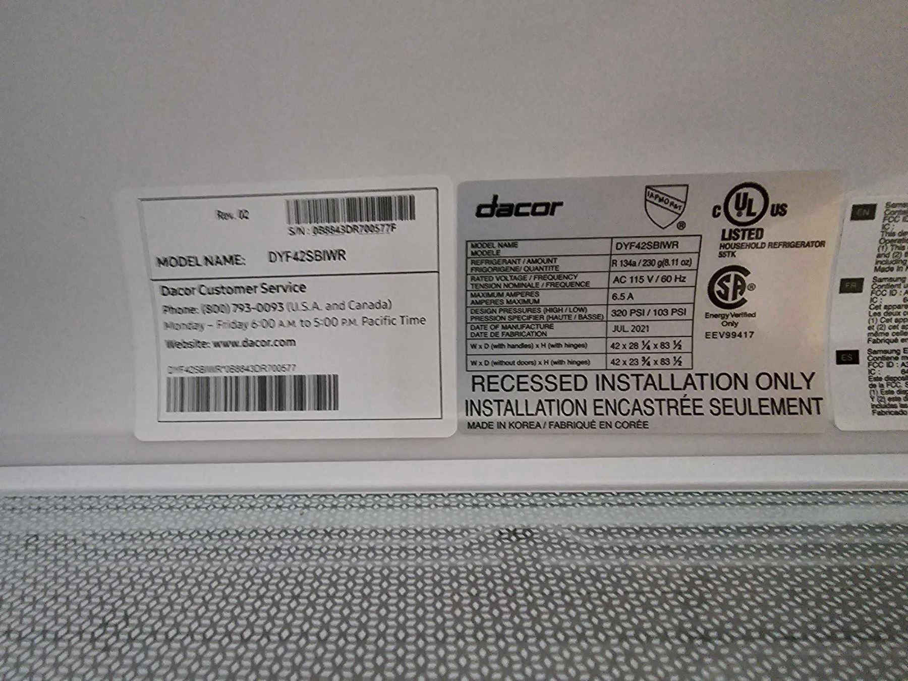 Dacor DRF427500AP Built In Refrigerator, 42 inch Width, ENERGY STAR Certified, Counter Depth, 23.5 c