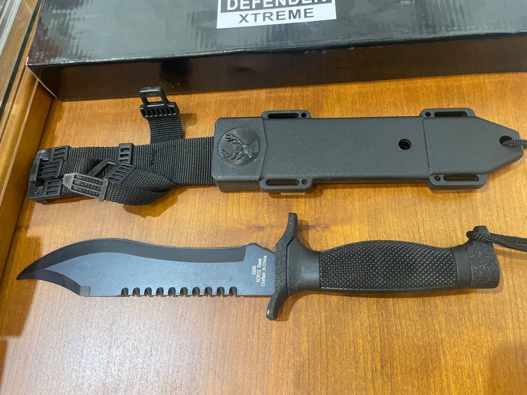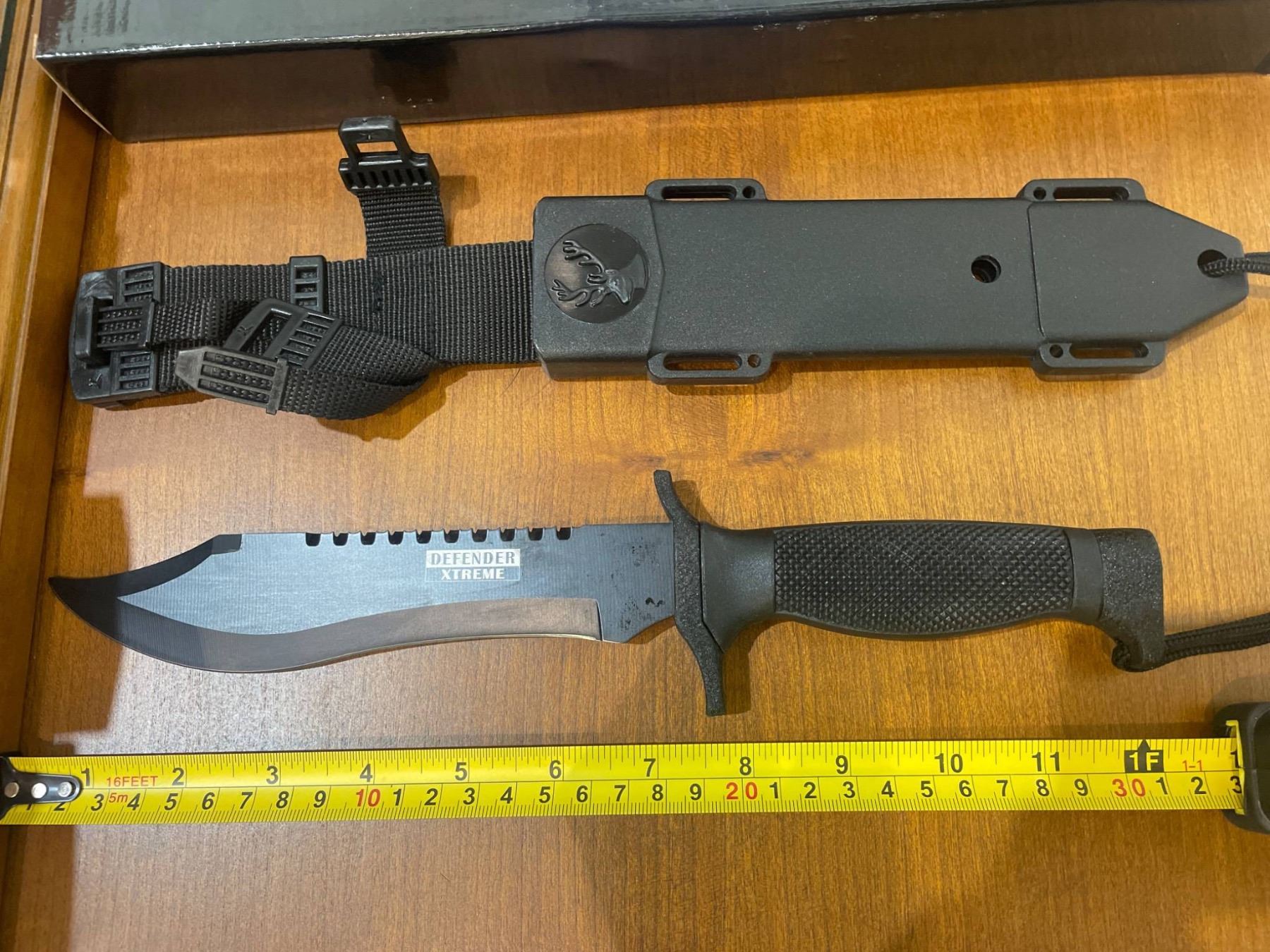 This listing features a Defender Xtreme tactical survival knife. Blade length is approximately 8 inches and overall knife length measures approximately 12 inches. Includes a heavy-duty plastic sheath with a nylon belt strap. The blade is crafted from stainless steel featuring partial serration and a clip point design.
