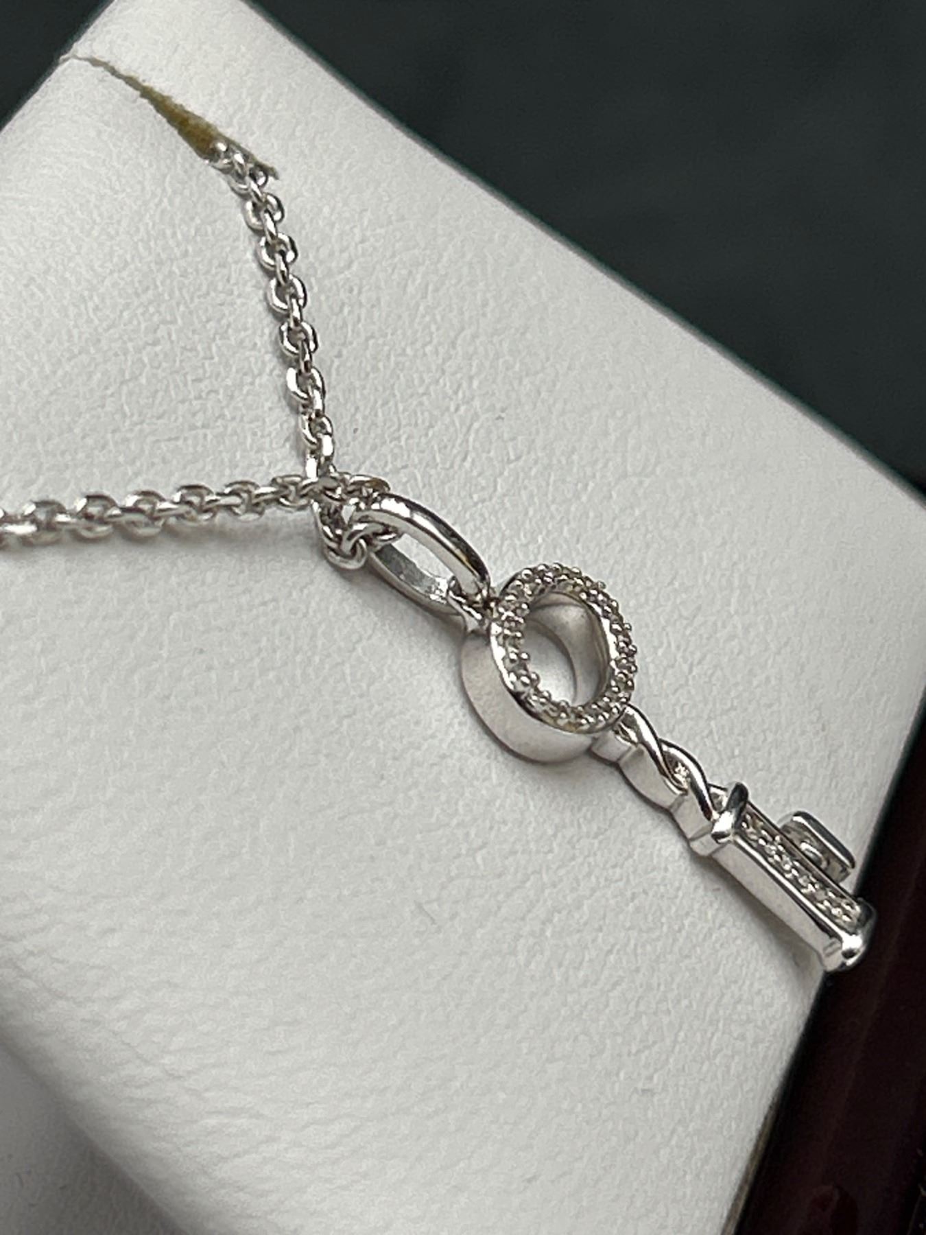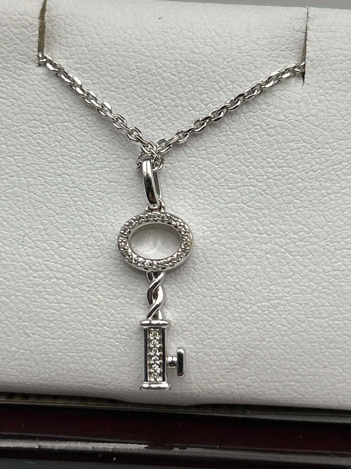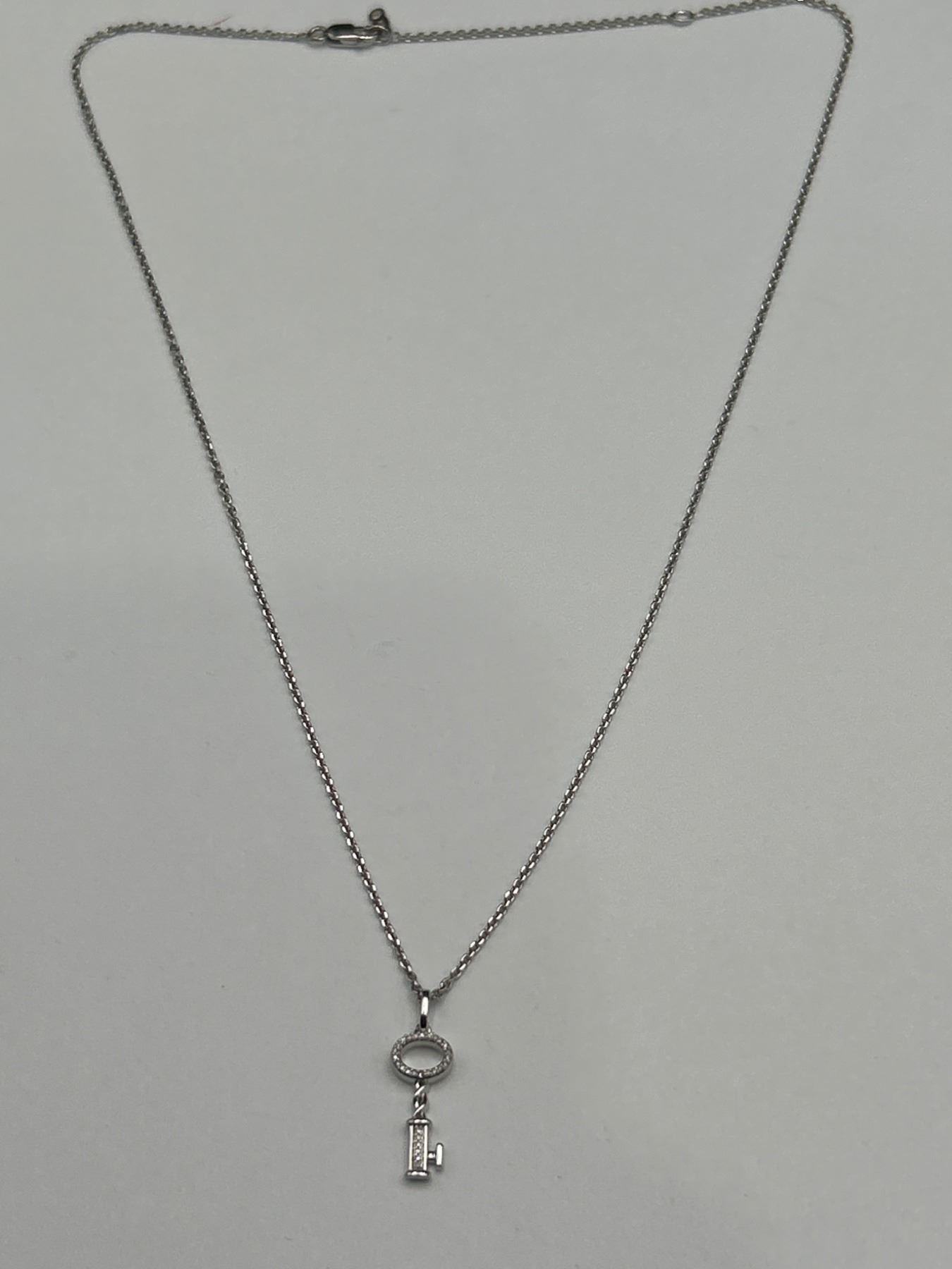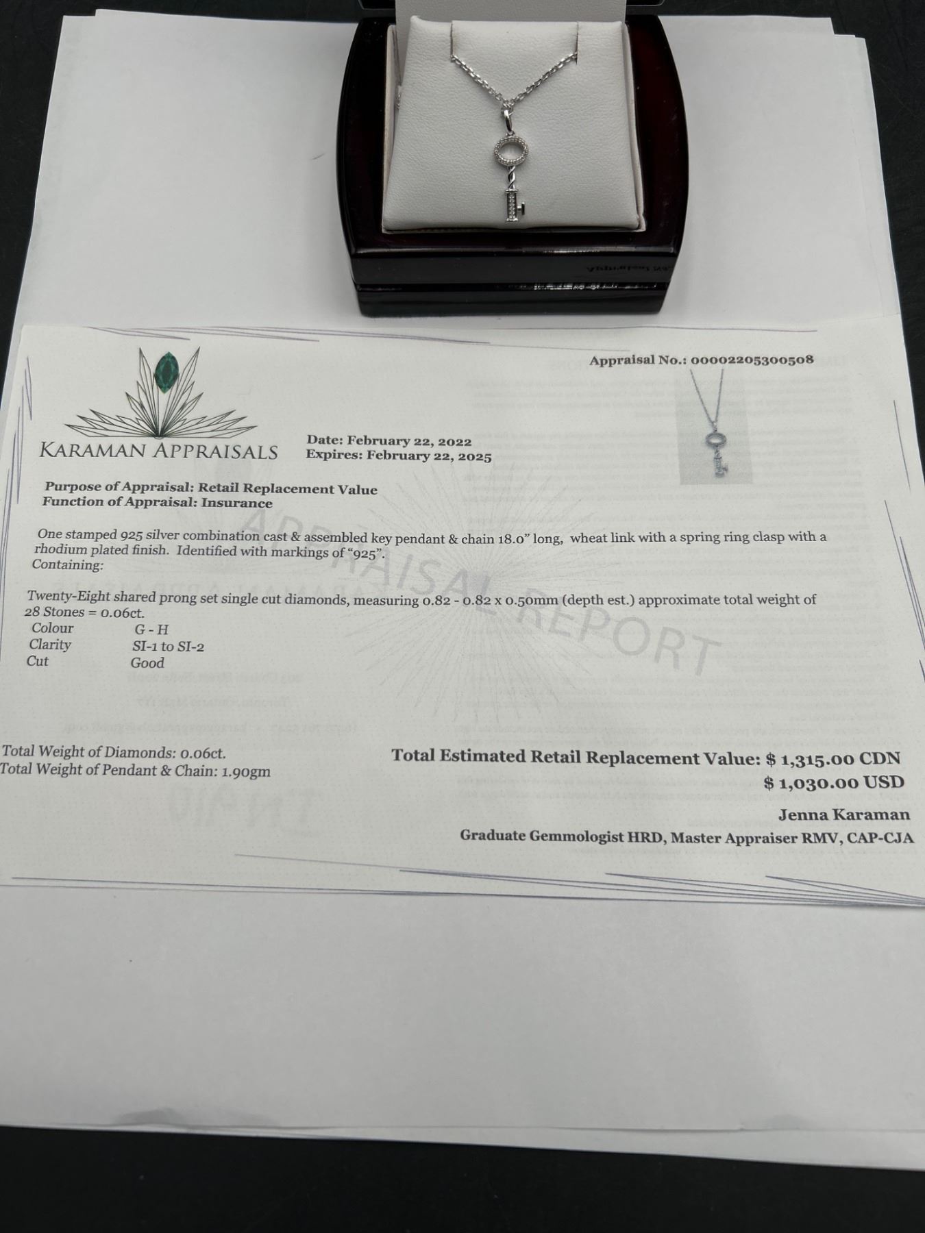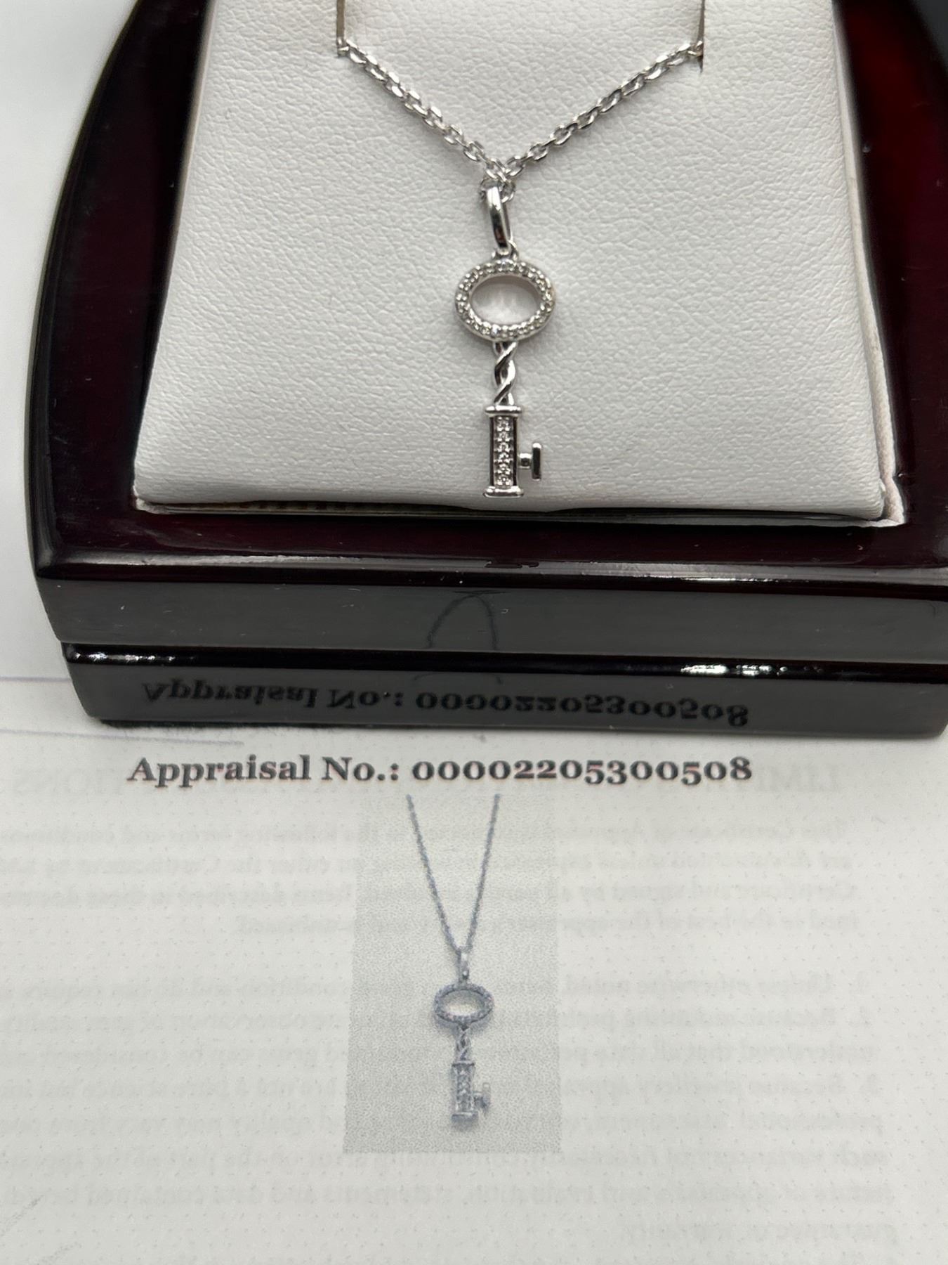 This listing is for a .925 Silver necklace featuring a key-shaped pendant adorned with 28 diamonds. The total estimated weight of diamonds is 0.06ct, and the pendant is attached to an elegant .925 Silver Chain. The necklace comes with an appraisal by a certified gemologist, indicating an estimated retail value of $1,335 CAD. Rhodium Plated