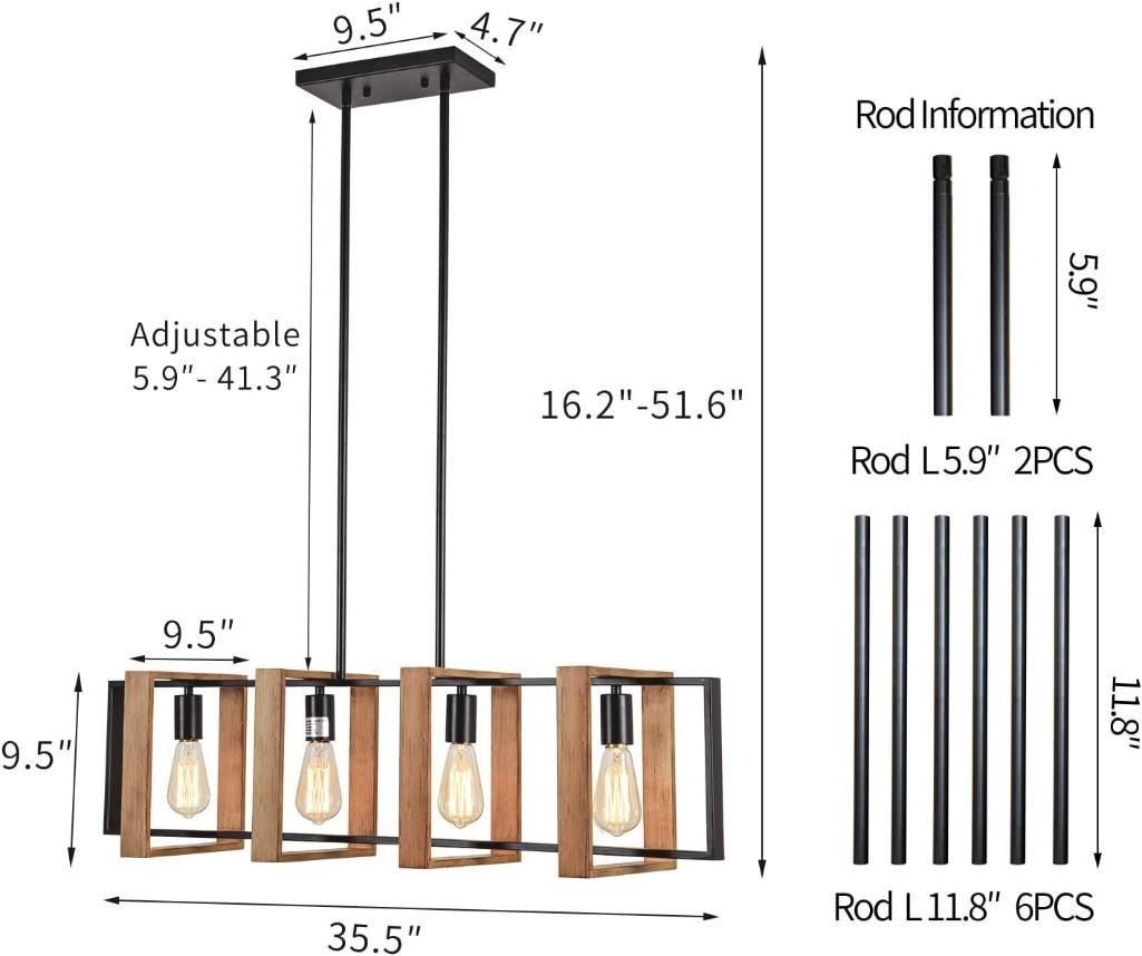 Dining Room Light Fixture Farmhouse Pendant Lights Kitchen Island Rustic Kitchen Light Fixtures 4 Lights Wood and Black Metal Rectangular Chandelier Ceiling Hanging Lighting 35.4"