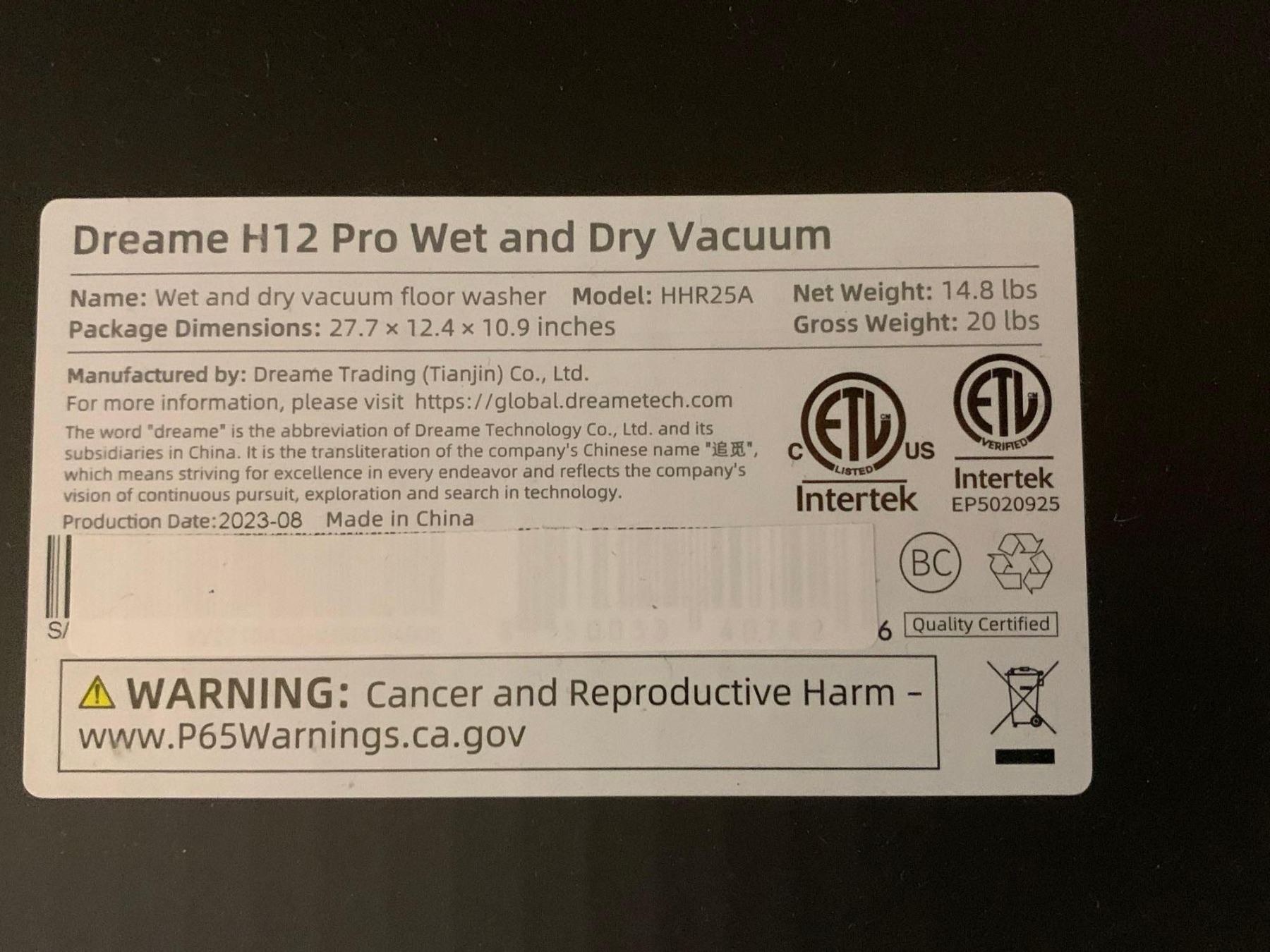 Dreame H12 Pro Wet And Dry Vacuum Floor Washer Model:HHR25A