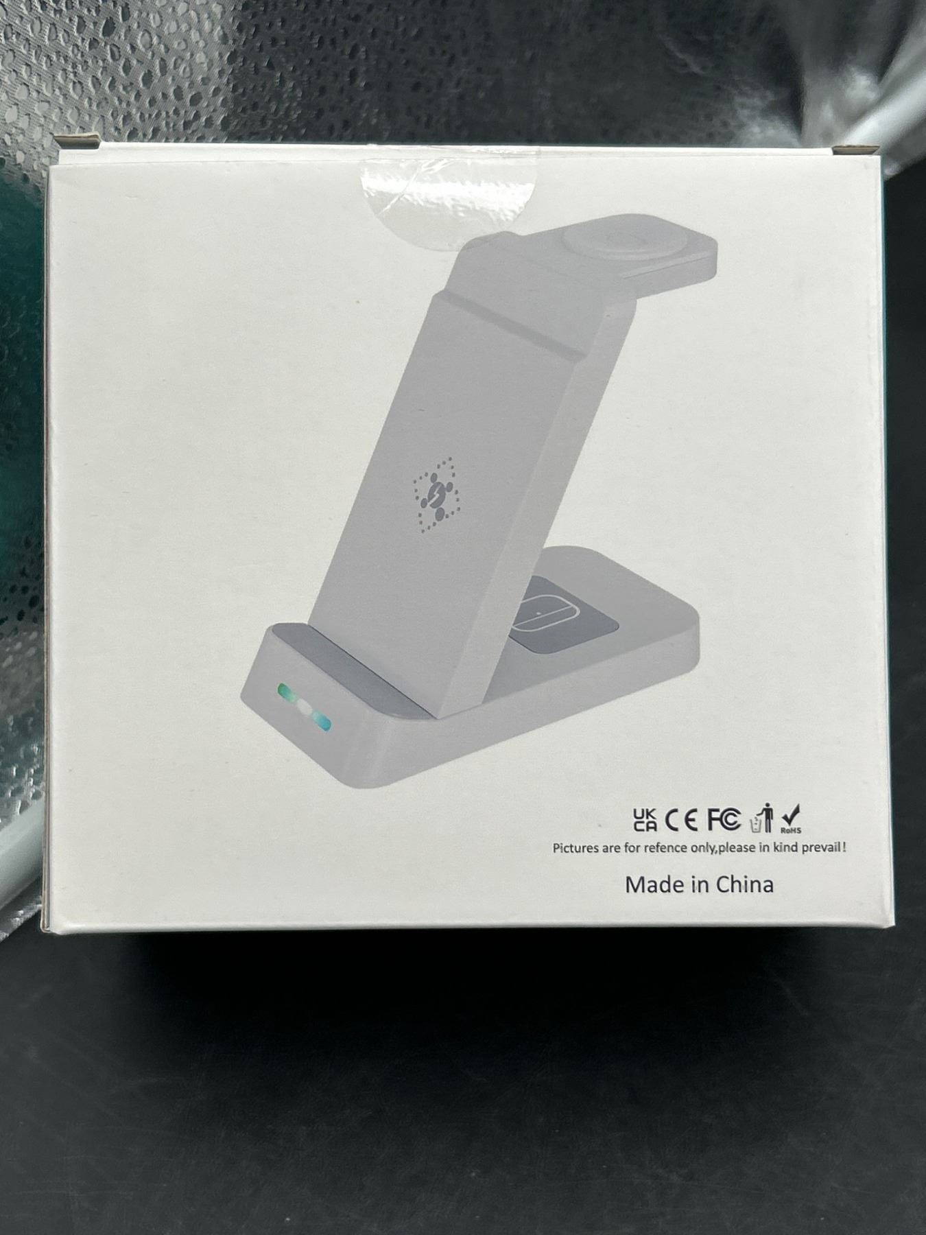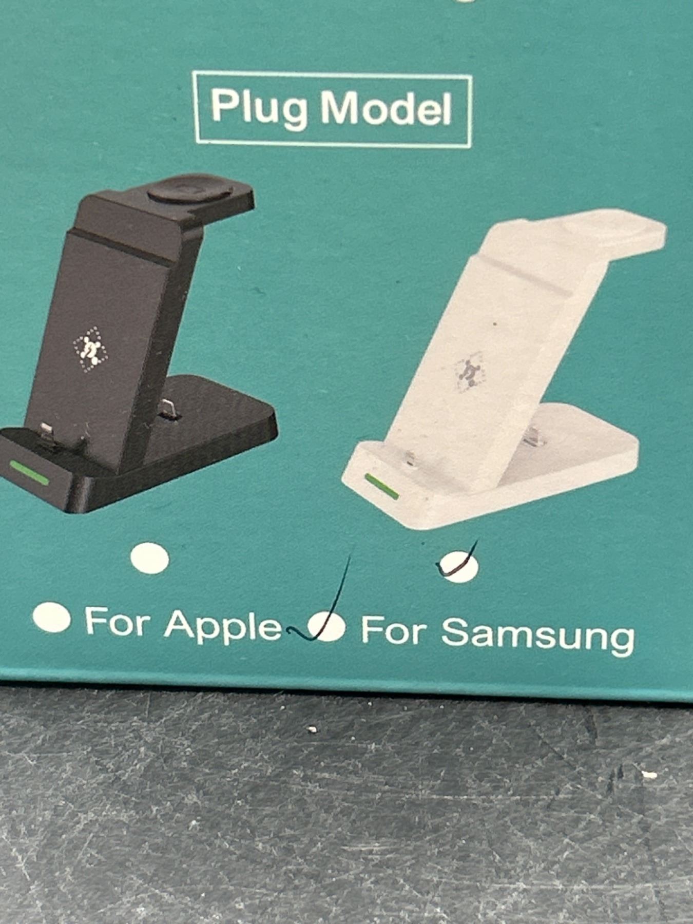 Dual wireless charging dock designed for compatibility with both Apple and Samsung devices. Features two charging zones for convenient simultaneous charging. Includes plug model configuration. Compact and lightweight design, crafted for modern efficiency. Made in China.