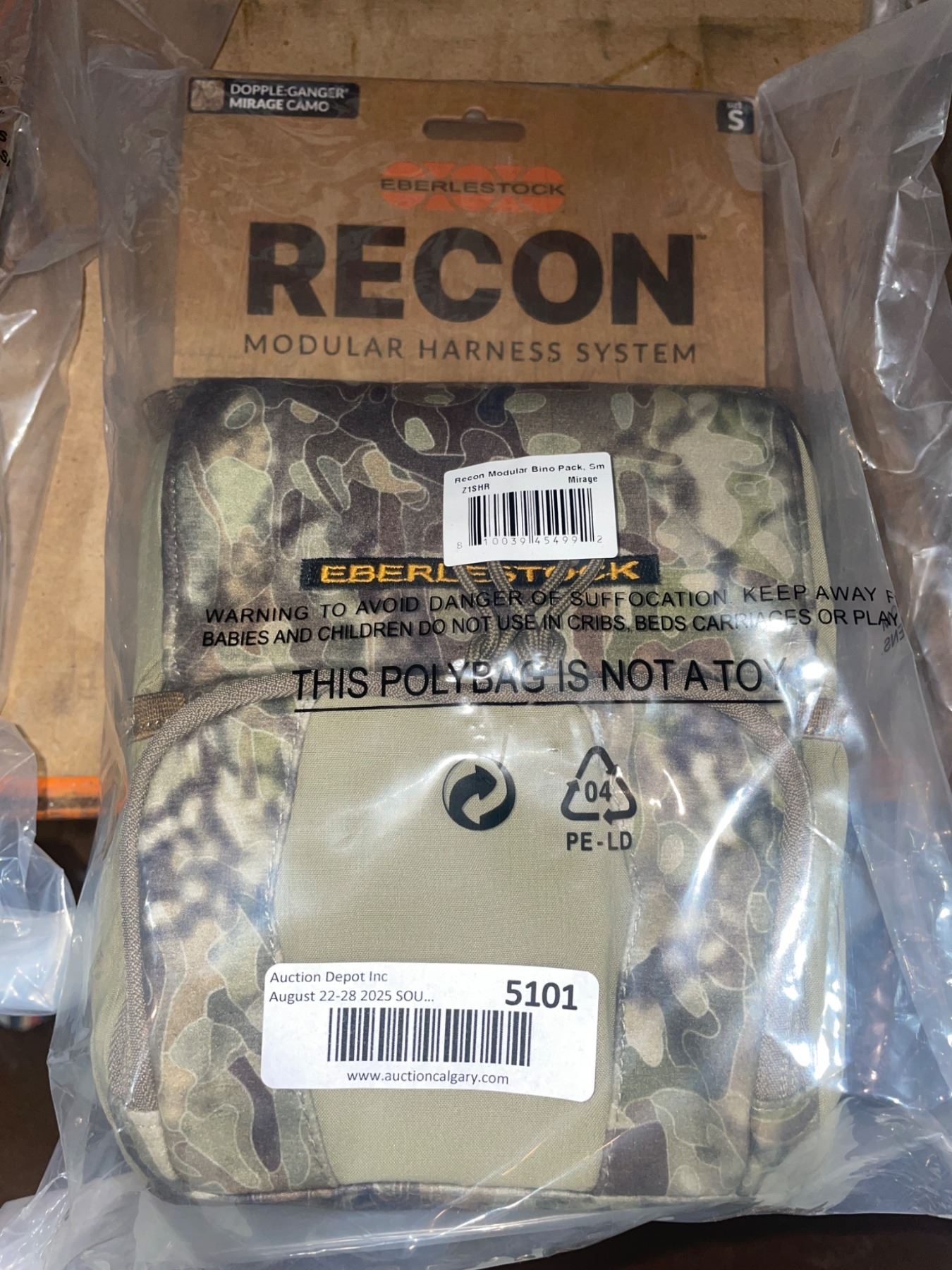 Eberlestock Recon Modular Bino Pack, in the Small size, Mirage camouflage pattern. Model number Z1SHR. Designed for carrying binoculars or similar items in an accessible system. Features PE-LD material and modular harness functionality.