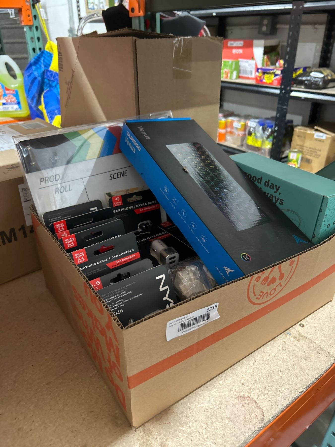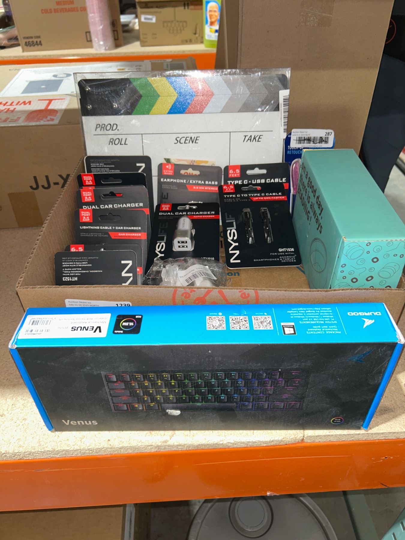 Electronics and Accessories Bundle Featuring Keyboard, Chargers, and Miscellaneous Items