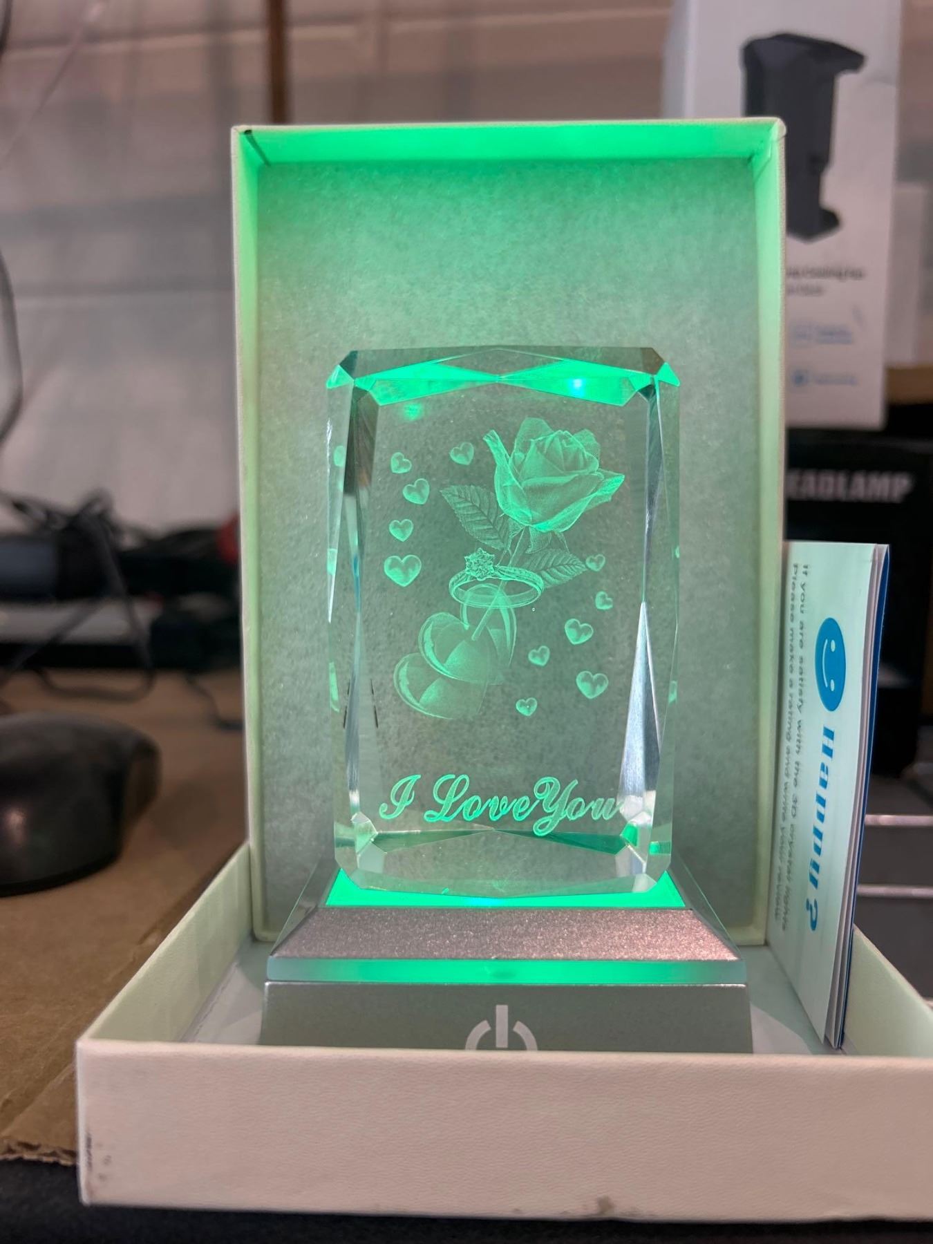 Etched Glass light up Ring and Rose Display with light up base in gift box