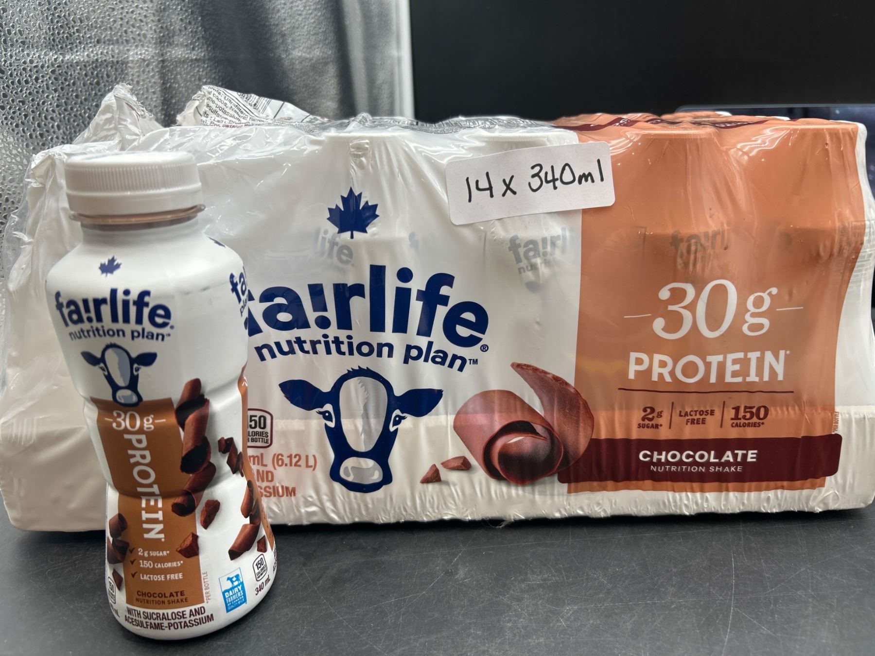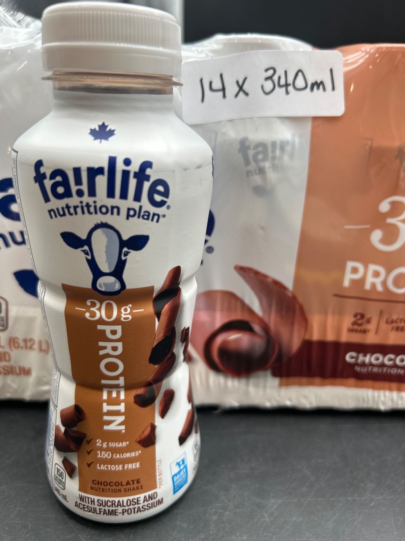 This is a set of 14 Fairlife Nutrition Plan chocolate-flavored drinks. Each bottle contains 30g of protein and has a 340ml capacity. The nutritional details indicate 2g of sugar, 150 calories per bottle, and lactose-free content along with added calcium and potassium. Ideal for high-protein dietary needs.