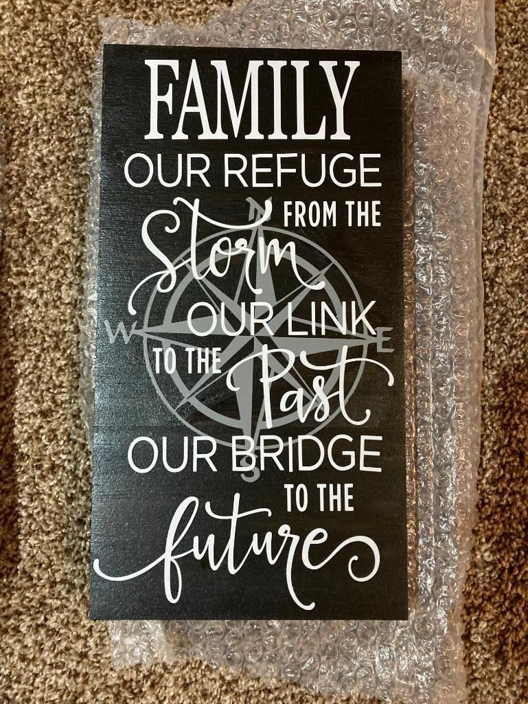 Family our refuge from the storm our link to the past our bridge to the future 6X12 Inches. Made of Pine. Hooks on Back
