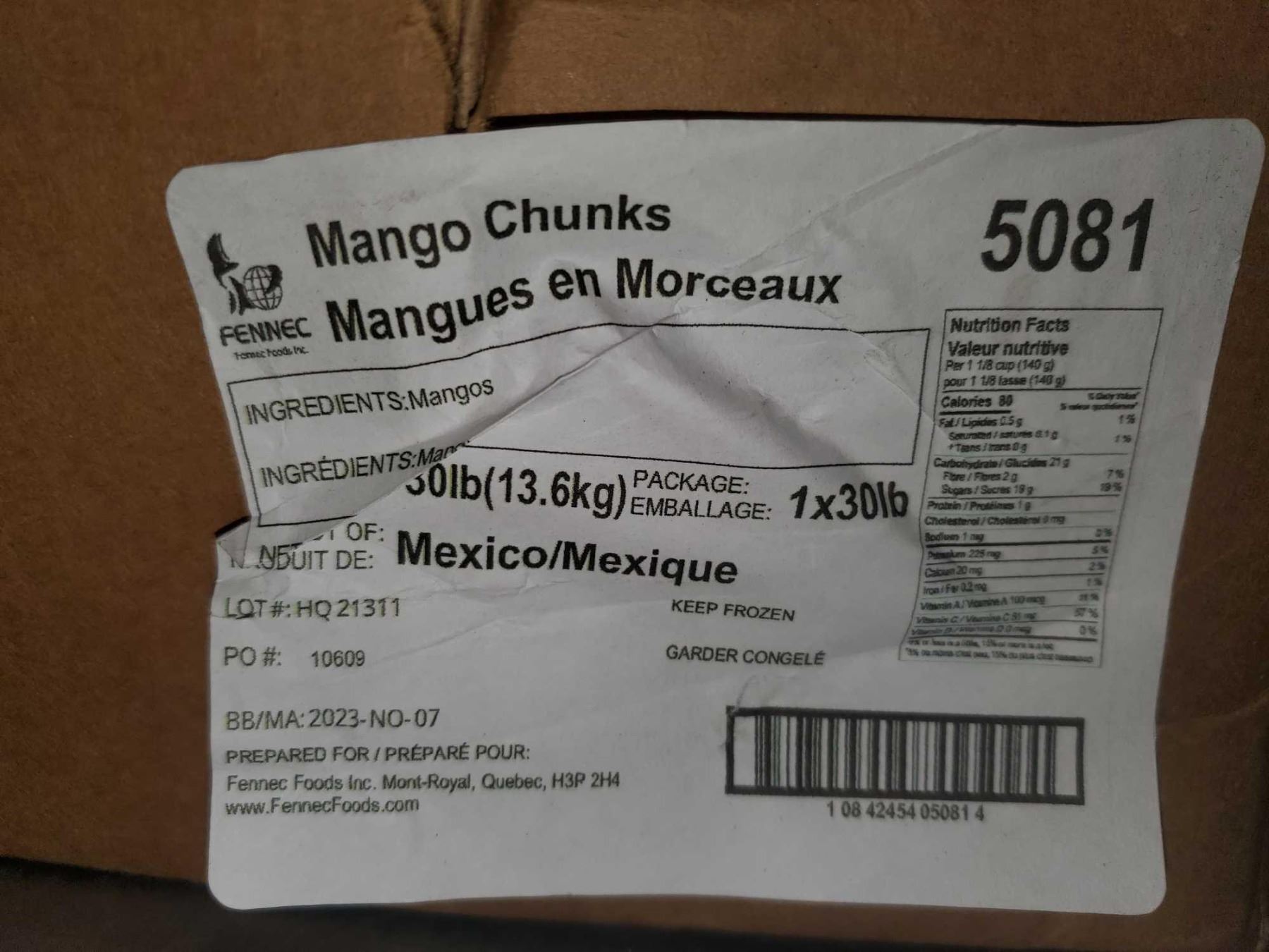Fennec Foods Frozen Mango Chunks 30 Lbs