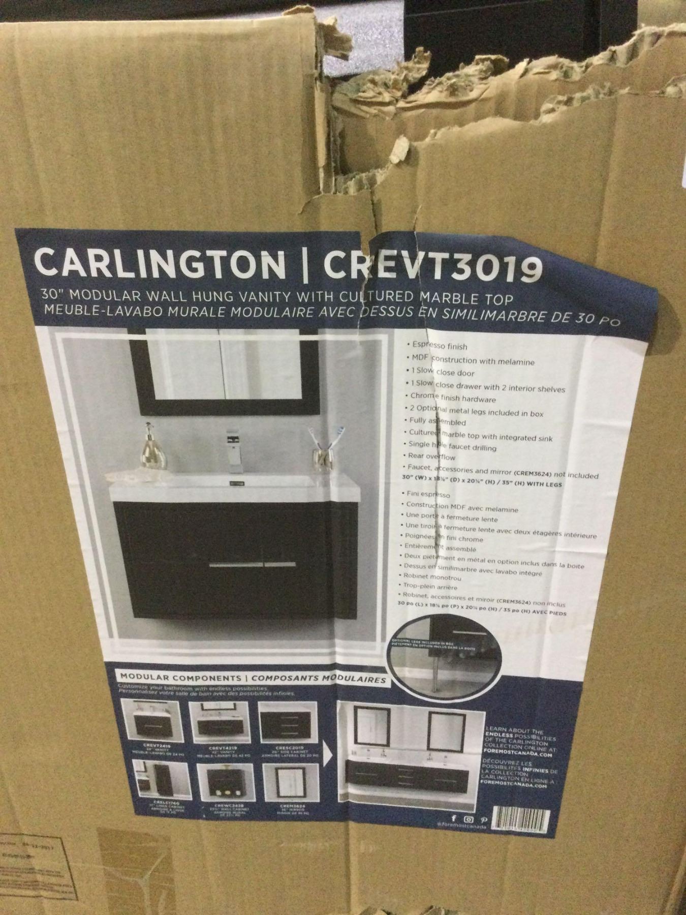 Foremost Carlington 30in Modular Wall Hung Vanity w/ Cultured Marble Top - Model: CREVT3019