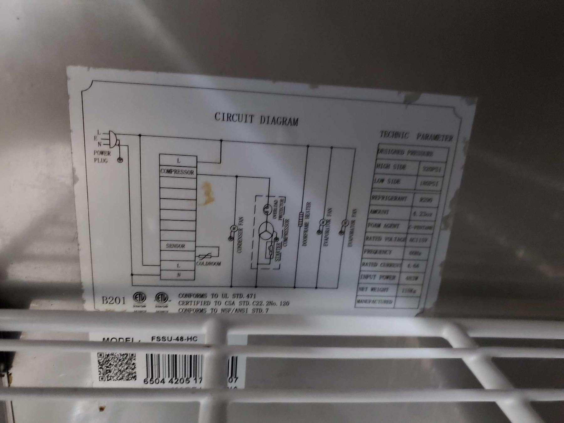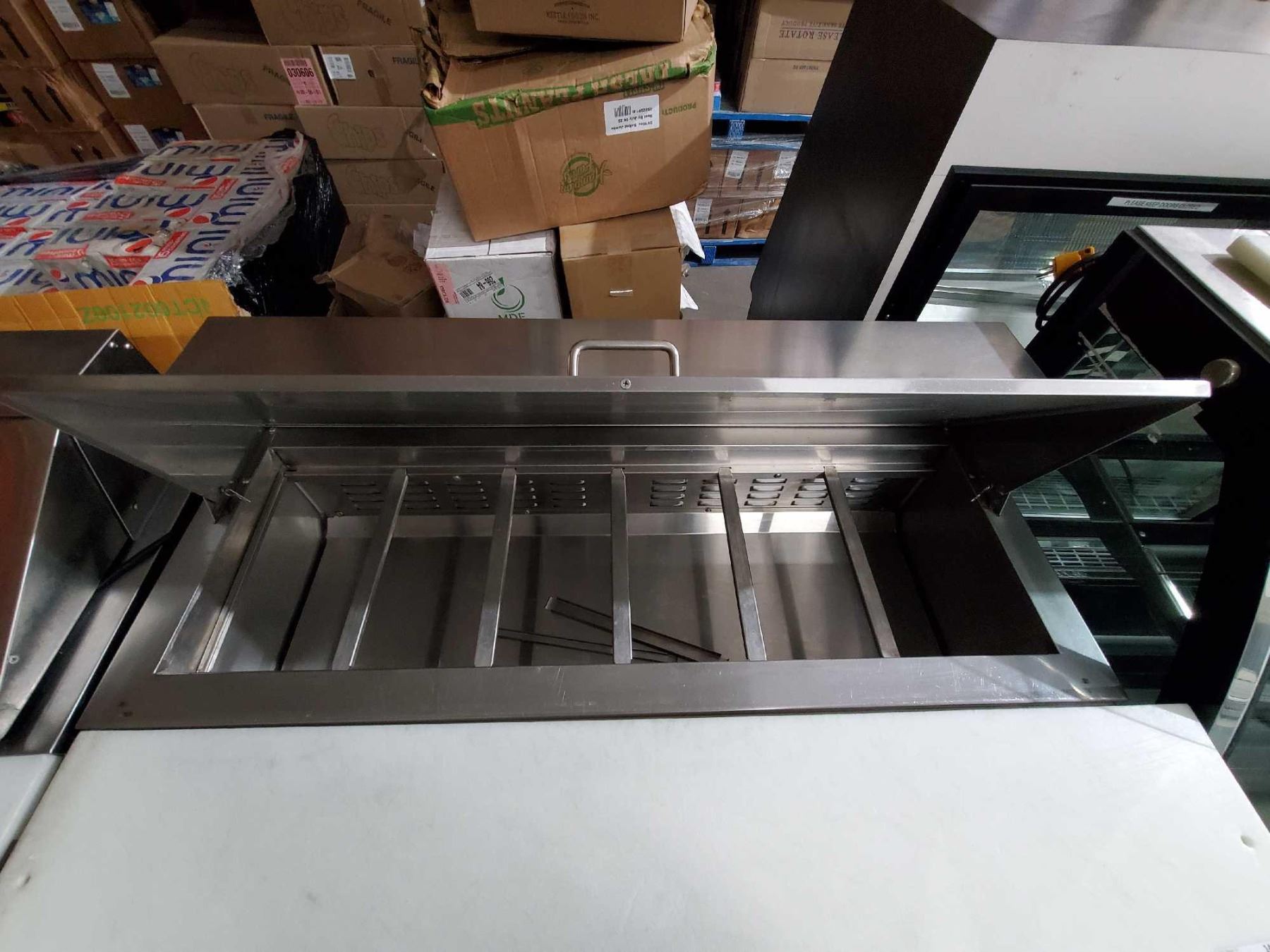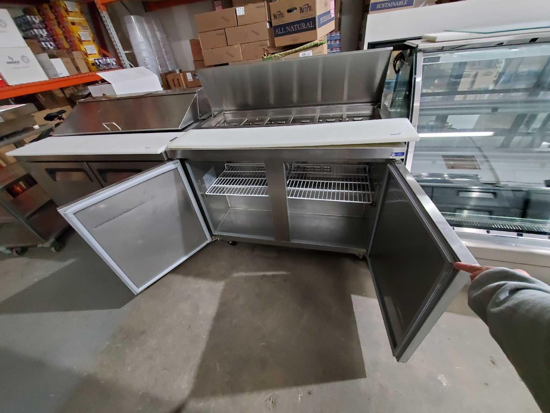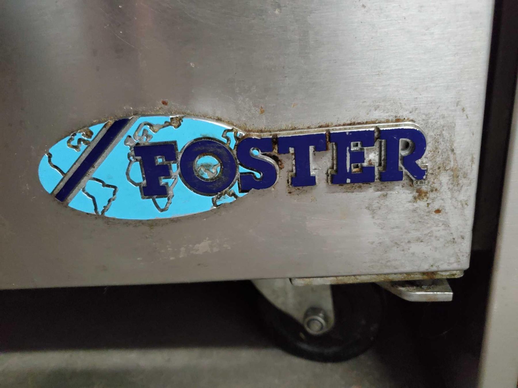 Foster 48 inch double door stainless steel refrigerated sandwich/pizza prep counter on wheels