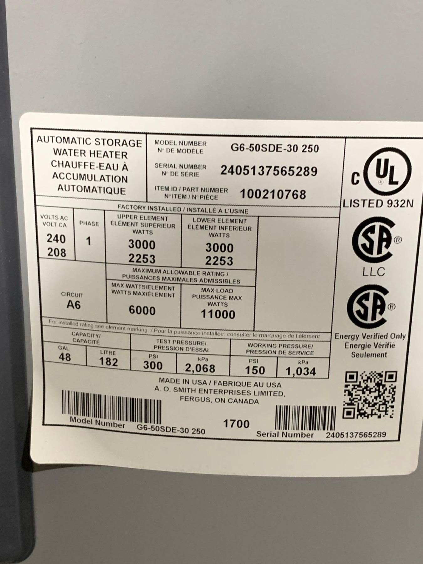 GSW Water Heater 6 Year Warranty Model G6-50SDE-30 250