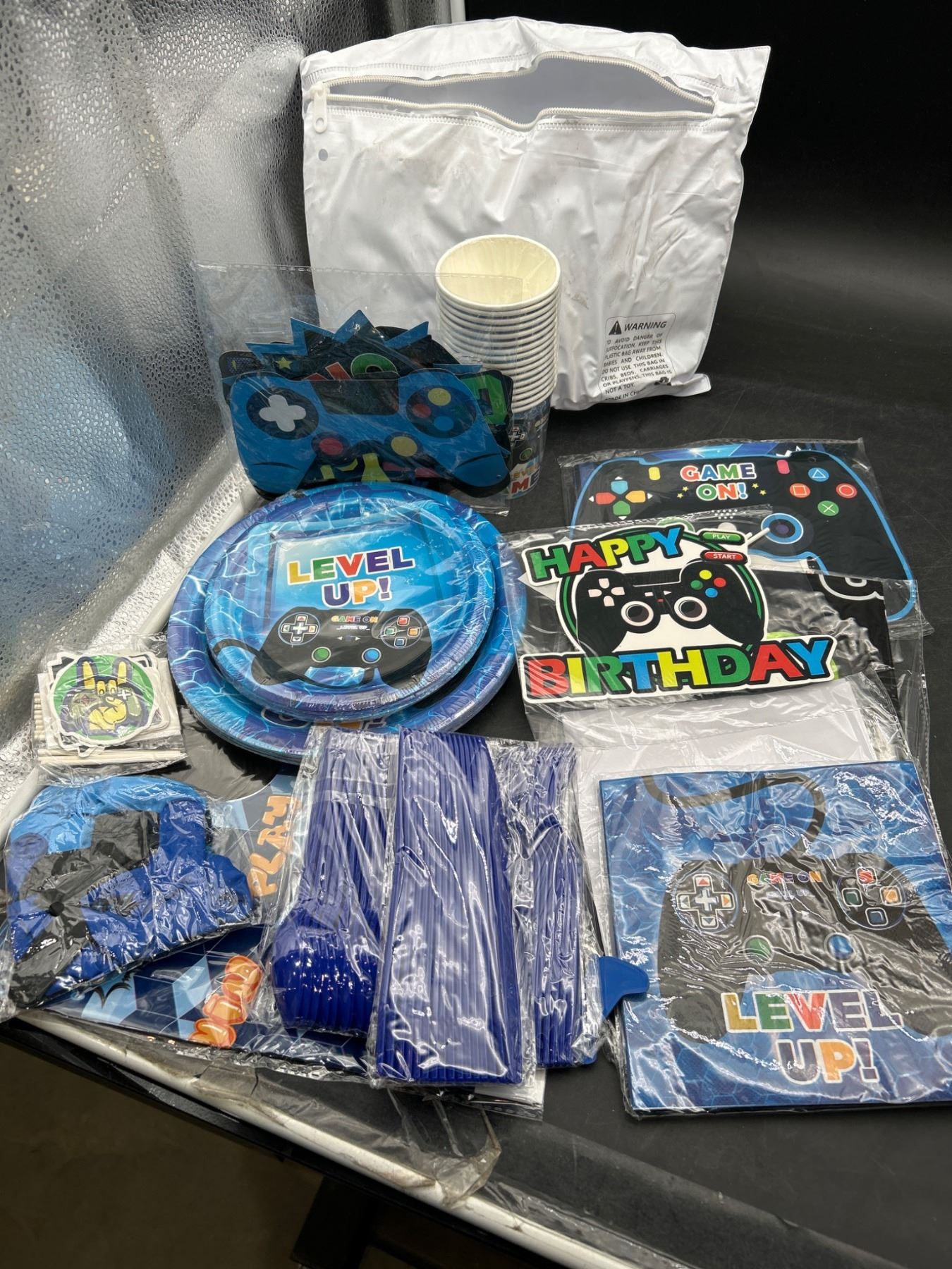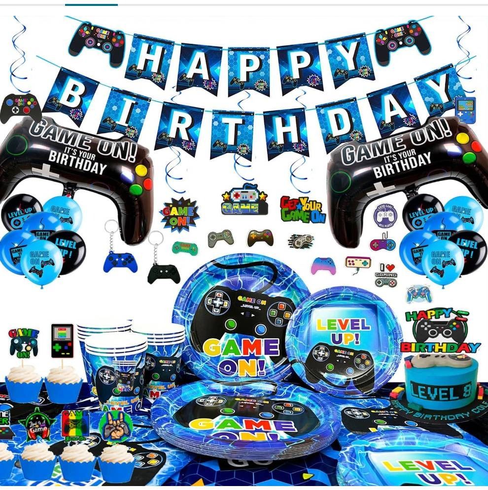Gaming-Themed Party Supplies Set Including Decorations and Tableware May Vary From Stock Photo