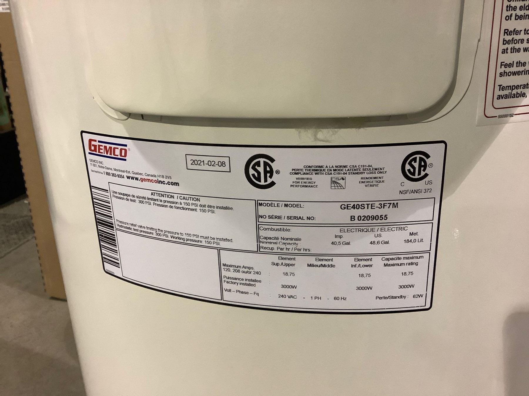 Gemco 40 Gal Imp 3000W Electric Water Heater  - Model: GE40STE-3F7M