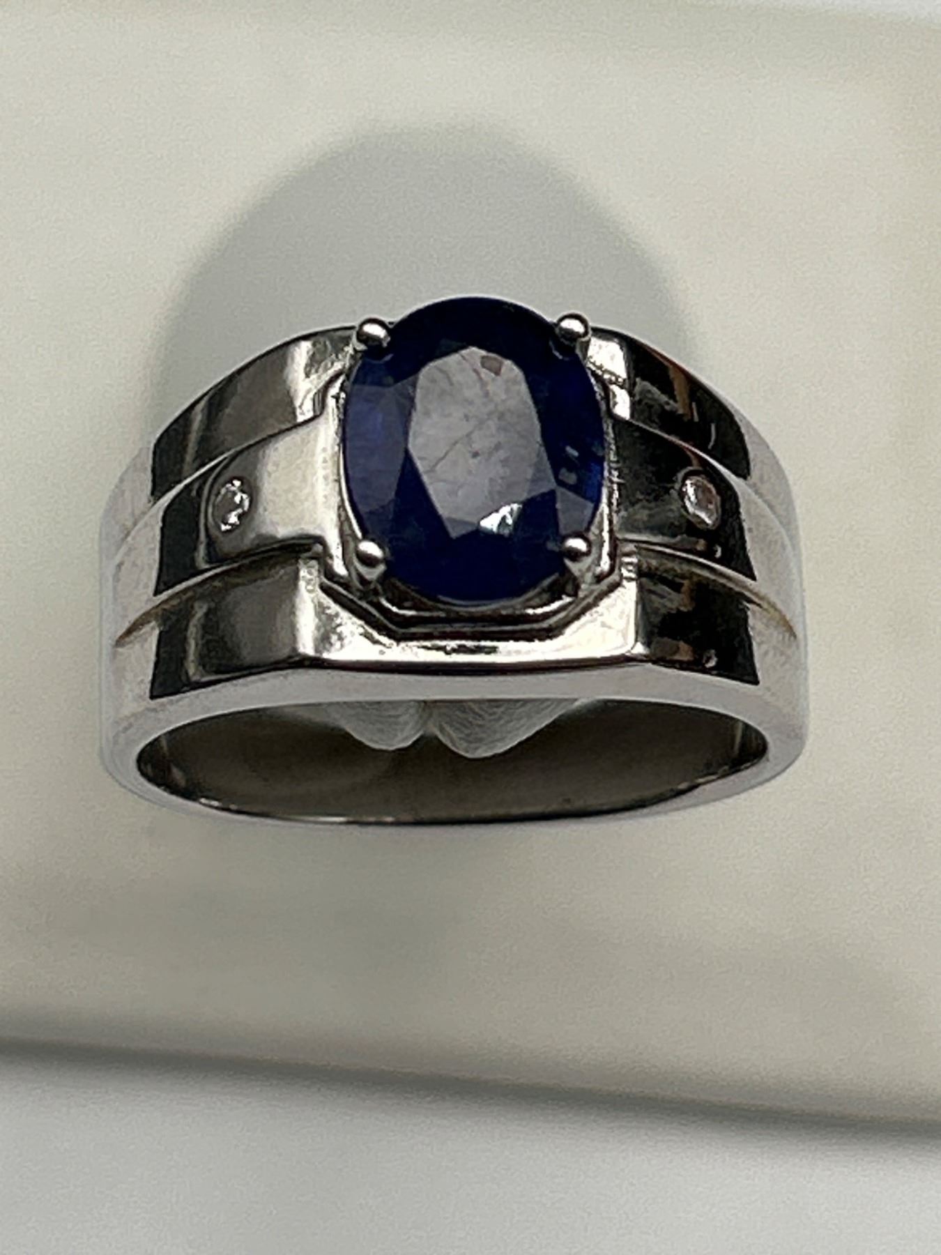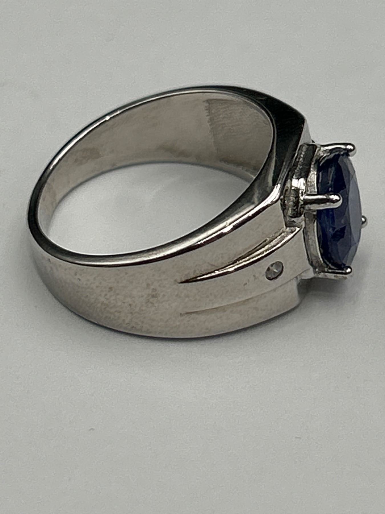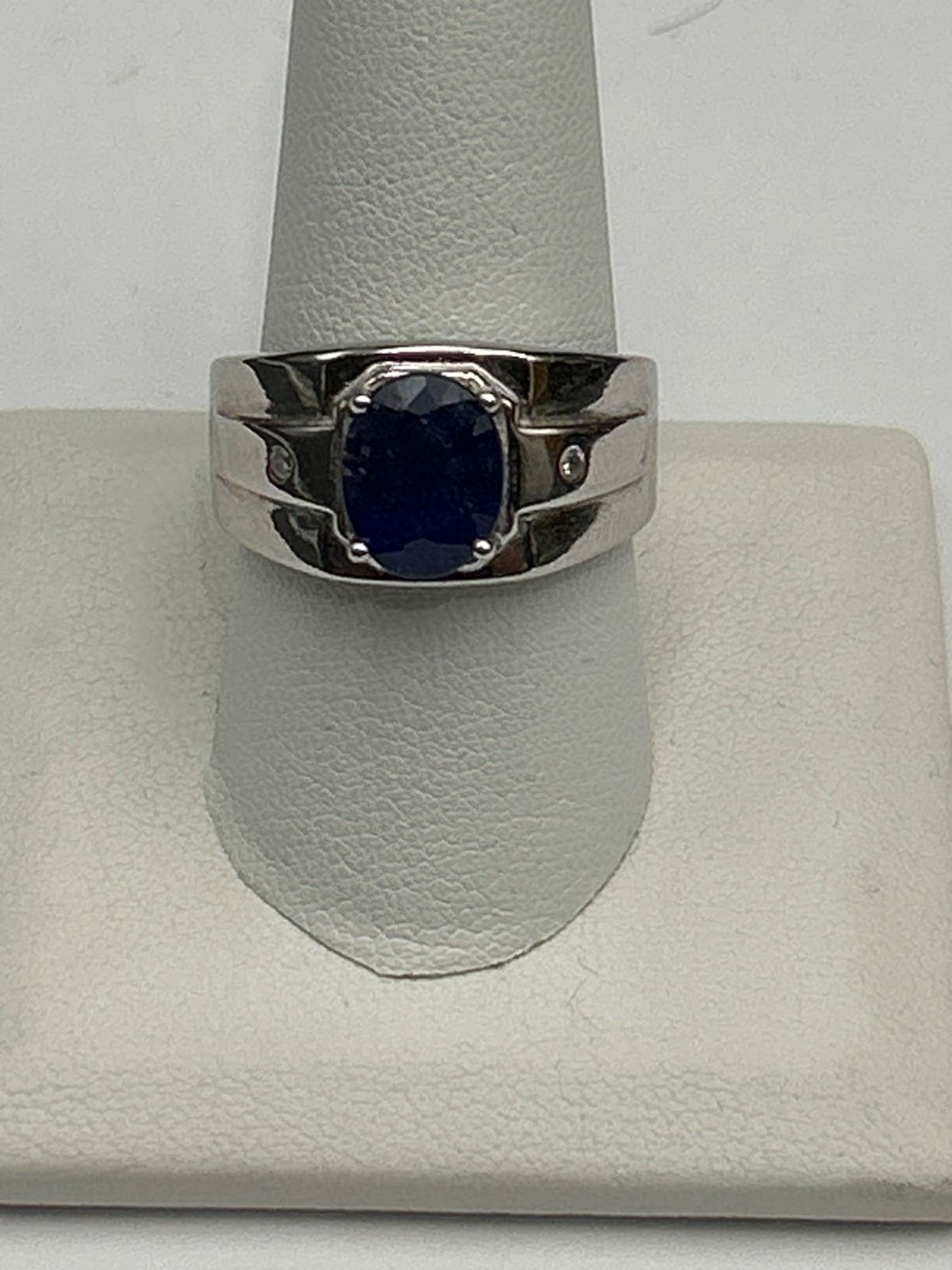 This is a .925 Silver men’s ring featuring a central oval-shaped blue sapphire weighing approximately 3.00 carats. The ring also includes two round brilliant cut cubic zirconiums totaling approximately 0.06 carats The ring weighs 7.55 grams overall.