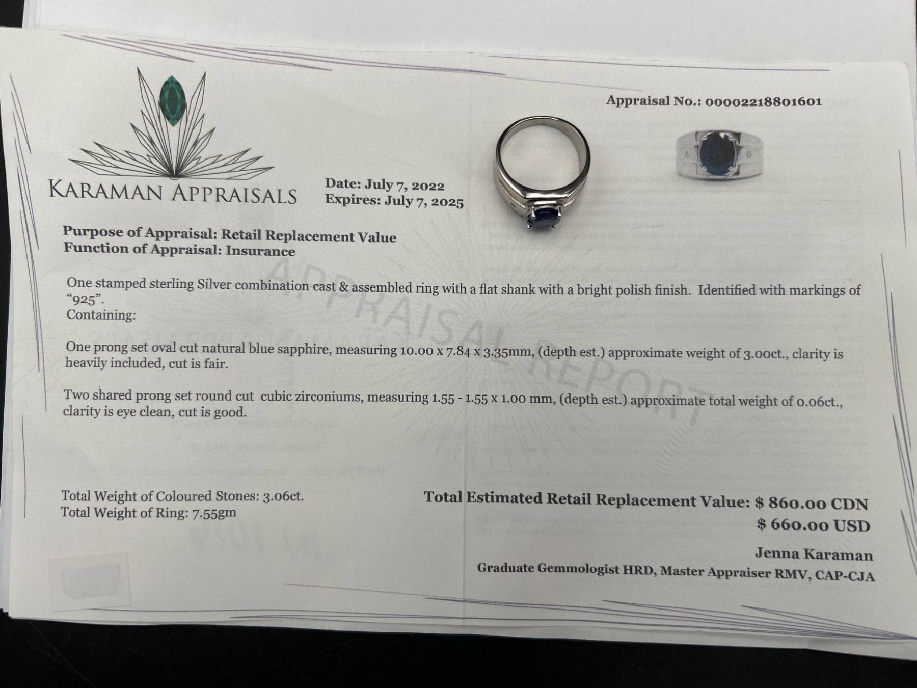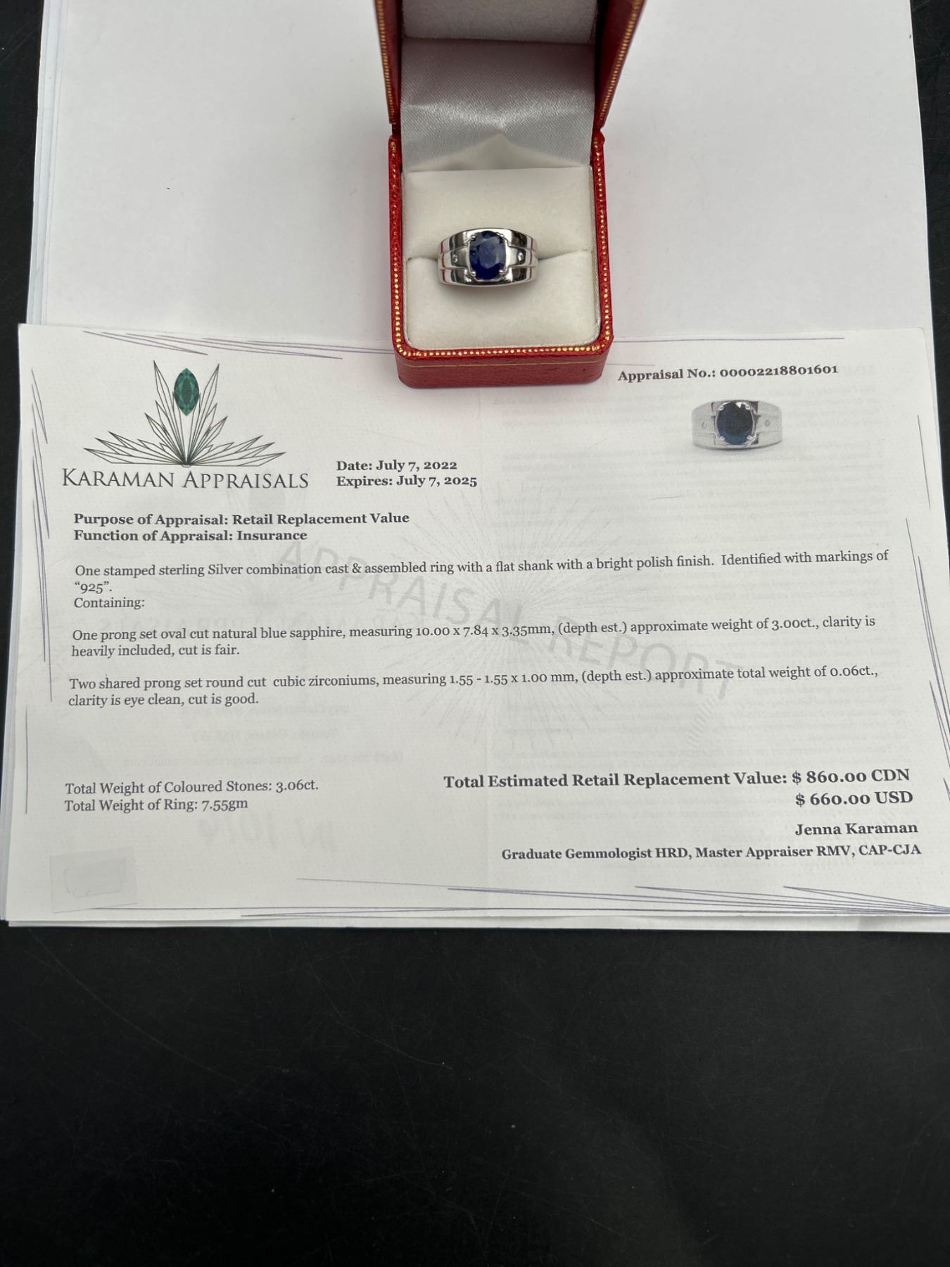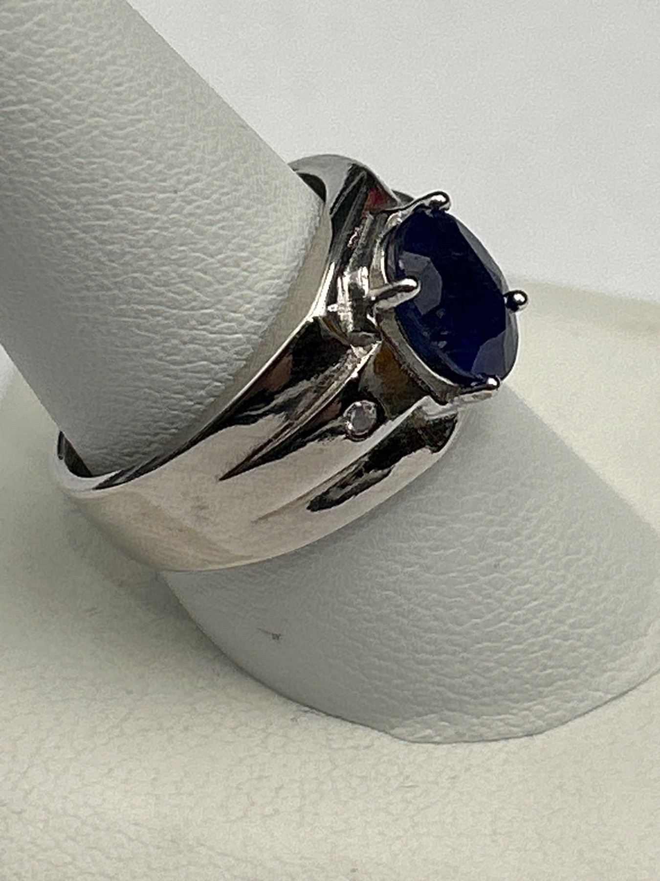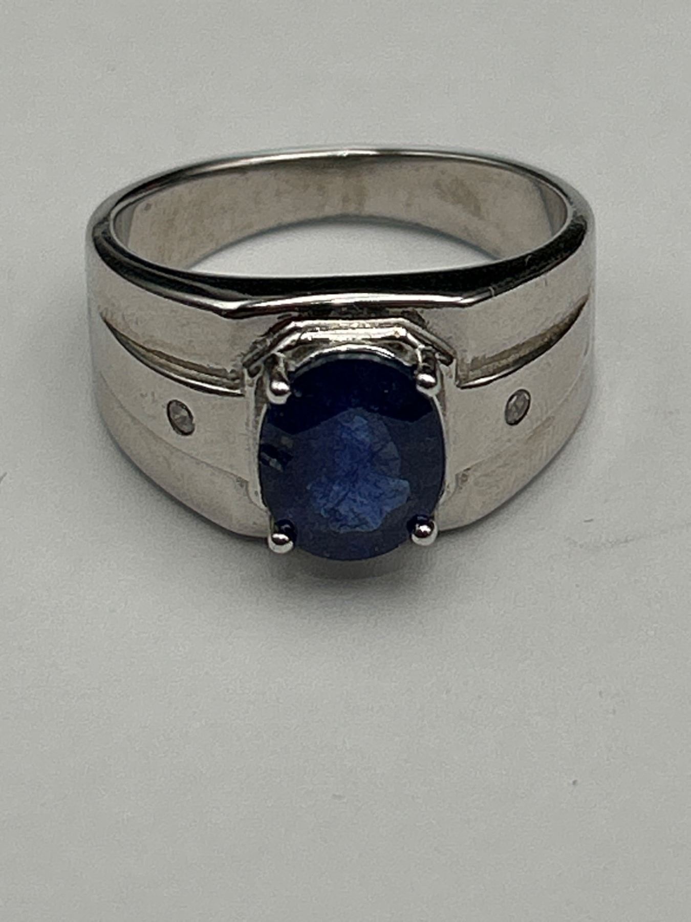 This is a .925 Silver men’s ring featuring a central oval-shaped blue sapphire weighing approximately 3.00 carats. The ring also includes two round brilliant cut cubic zirconiums totaling approximately 0.06 carats The ring weighs 7.55 grams overall.