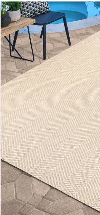 This is a Gertmenian Toscana indoor/outdoor rug with dimensions of 31 inches by 52 inches. It features a beige chevron pattern, suitable for various settings. The product label indicates the Toscana series, designed for versatile indoor and outdoor use.