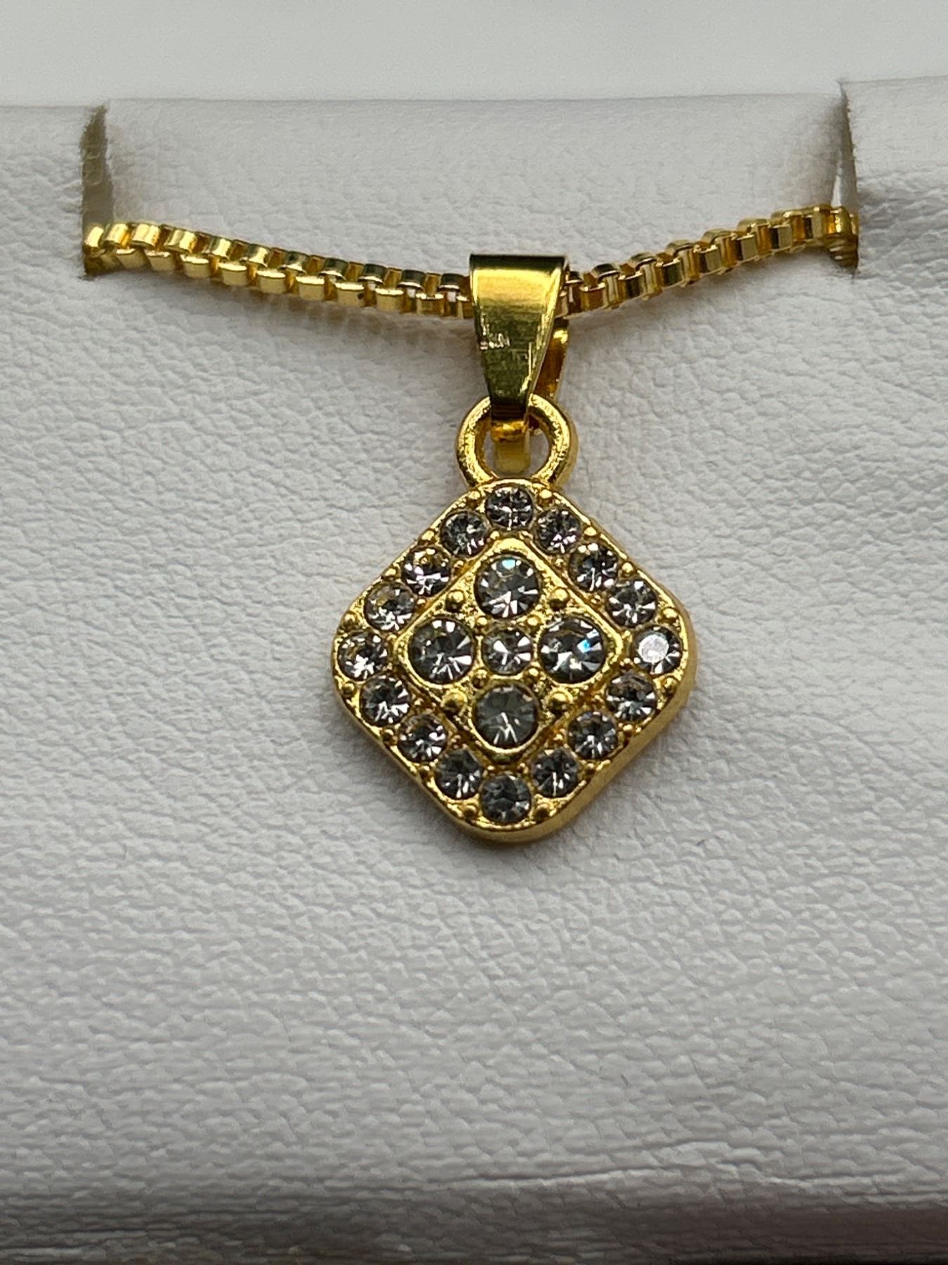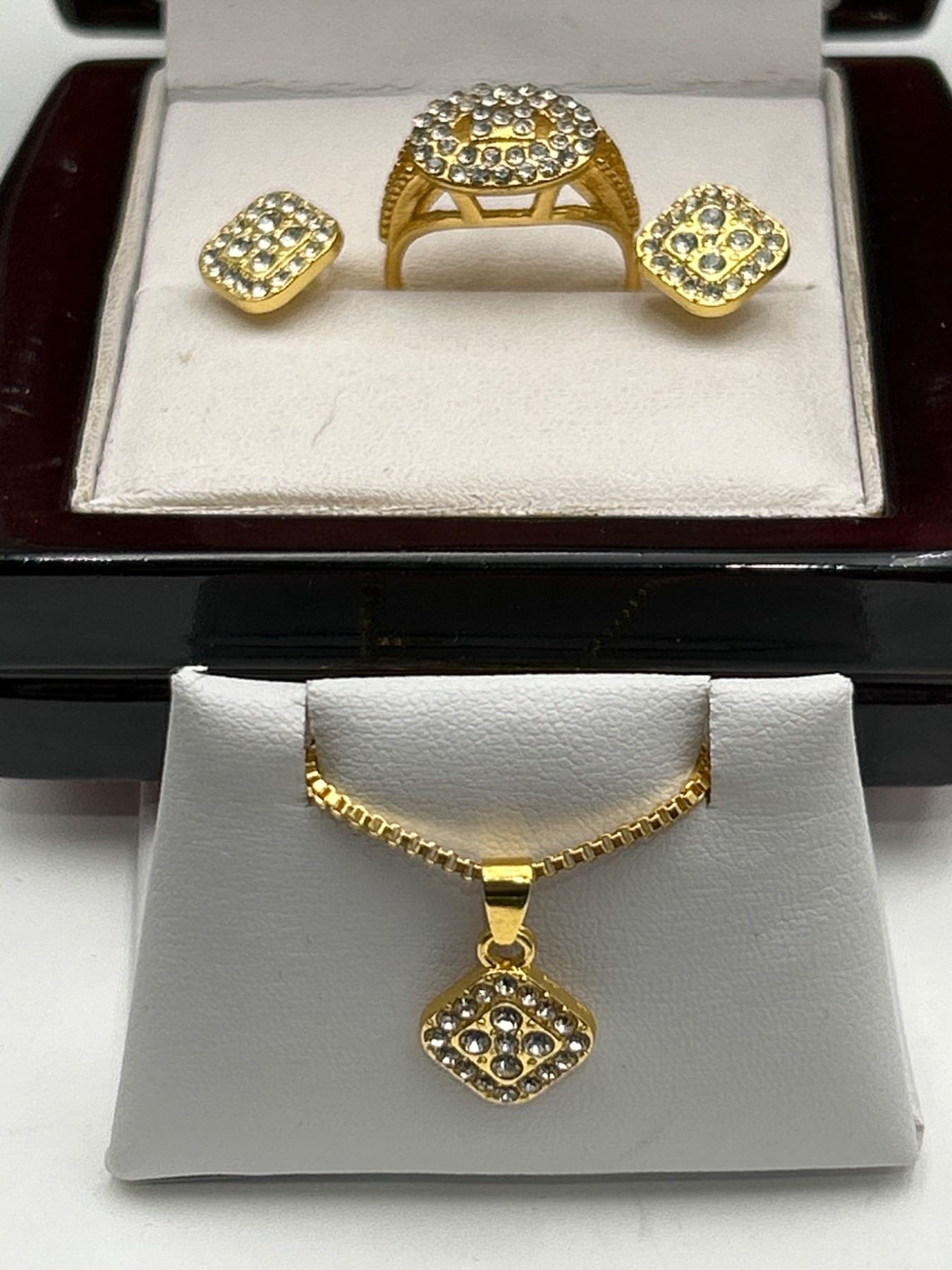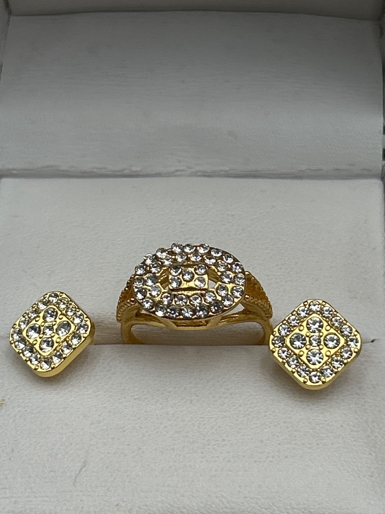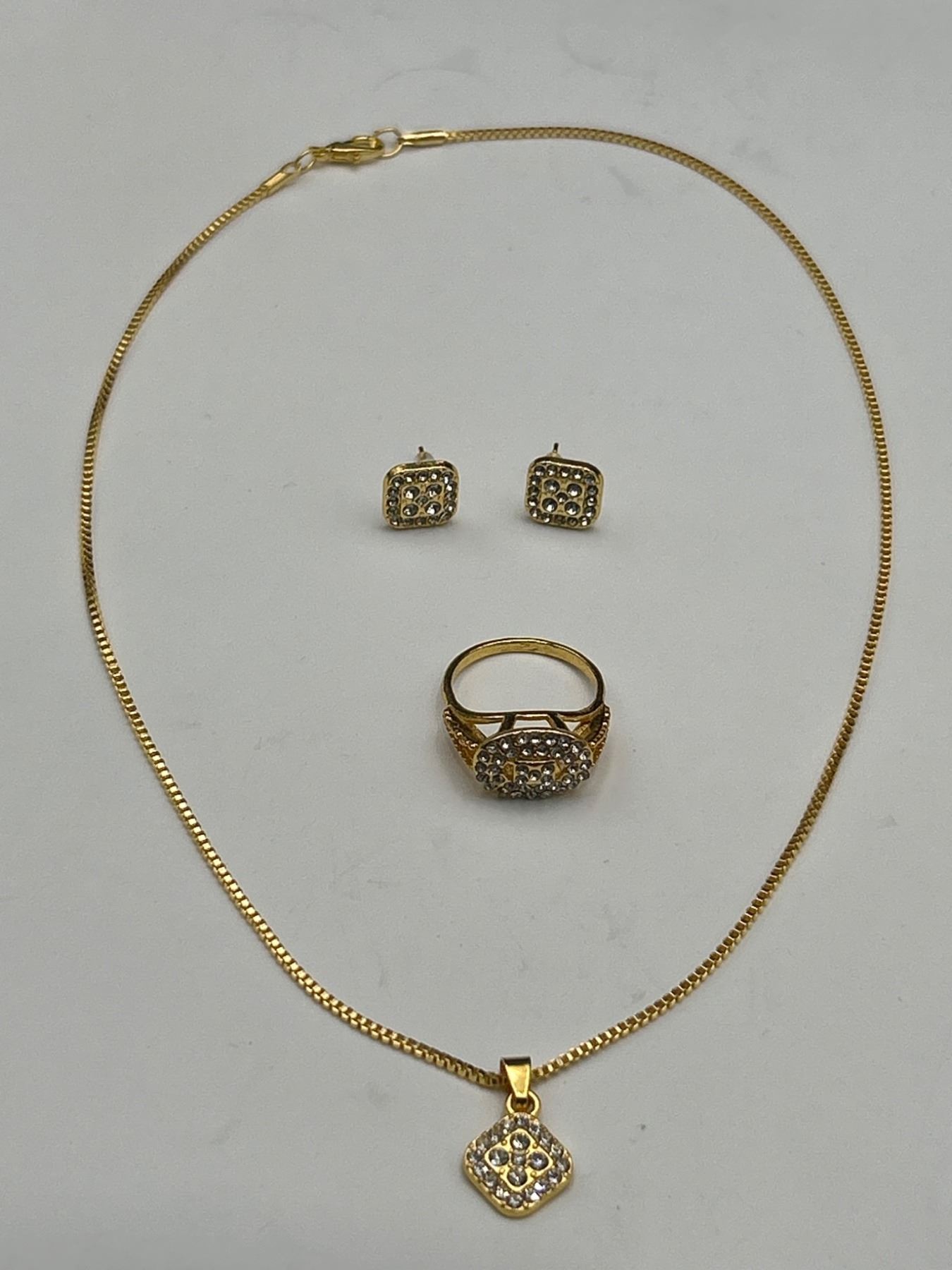 Gold-Tone Jewelry Set with Pendant, Earrings, and Ring Featuring Rhinestone Accents