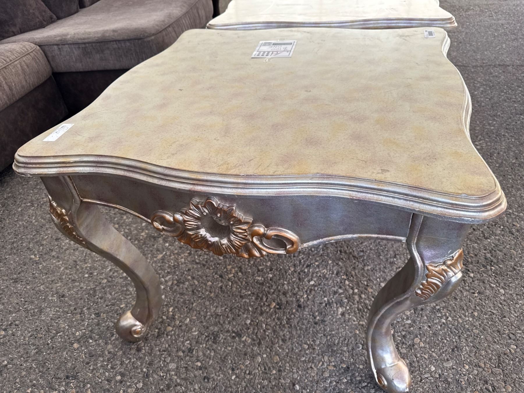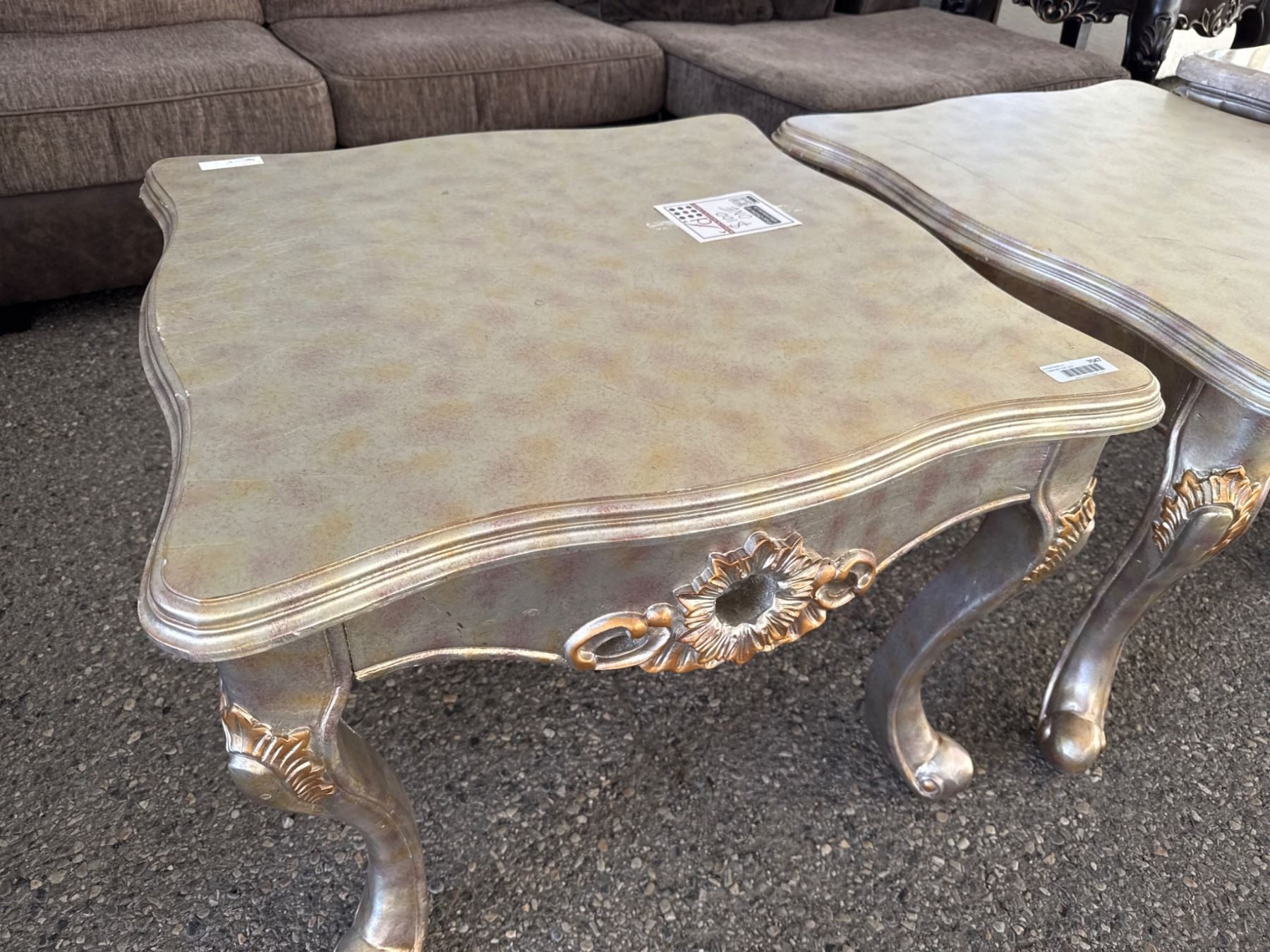 Gold-Tone Wooden Accent Table With Curved Legs and Ornate Design