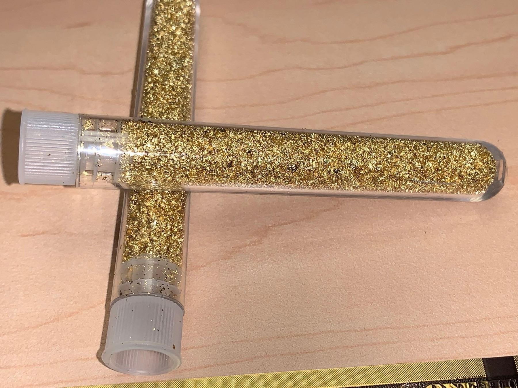 Golden Bundle with 2 large vials golden flake material, BitCoin Commemorative Medallion and Gold Clad USA $100 Certificate