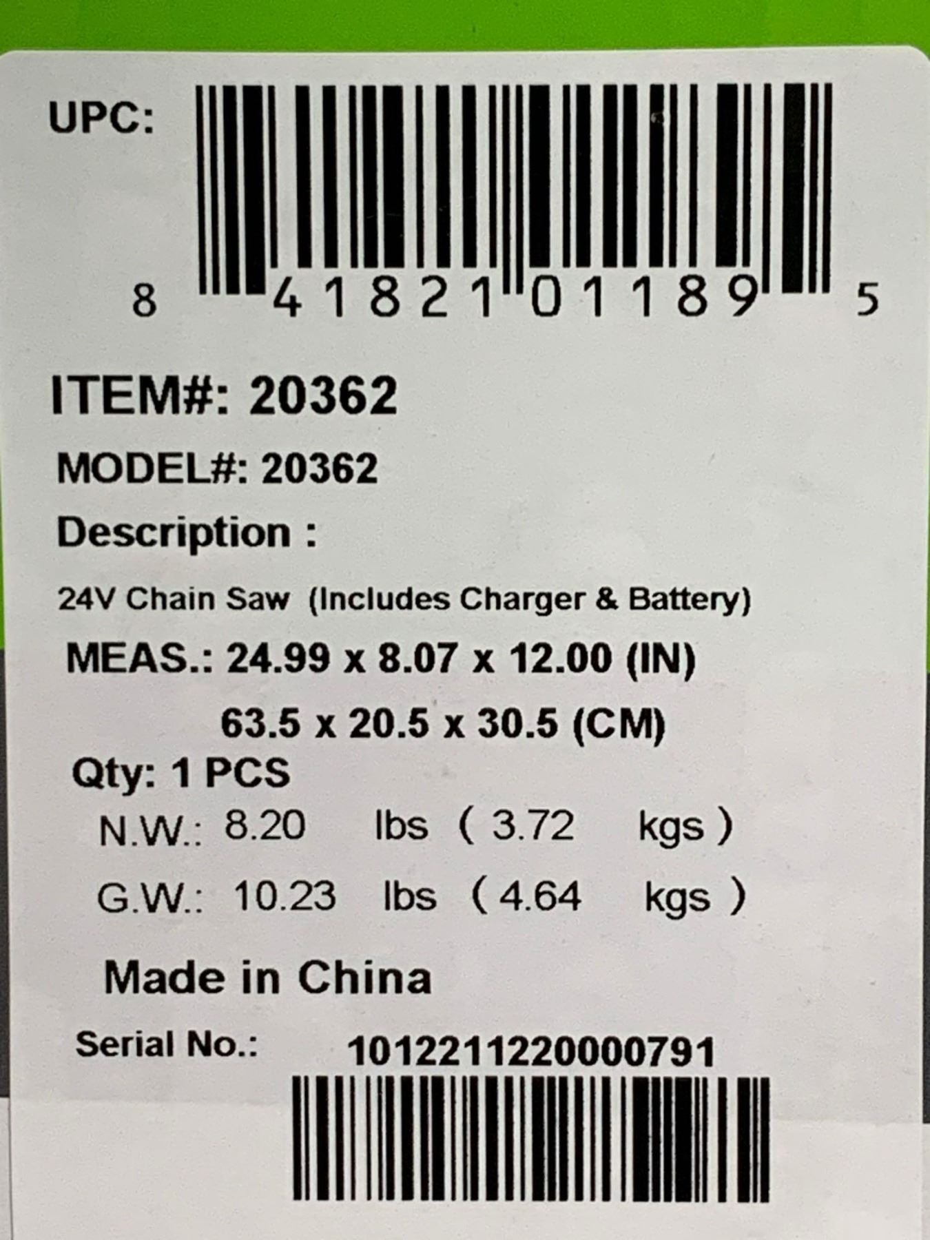 GreenWorks 10" Cordless Chain Saw 24V Lithium-Ion Battery