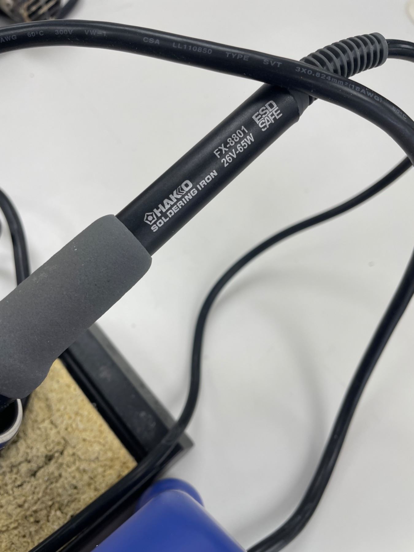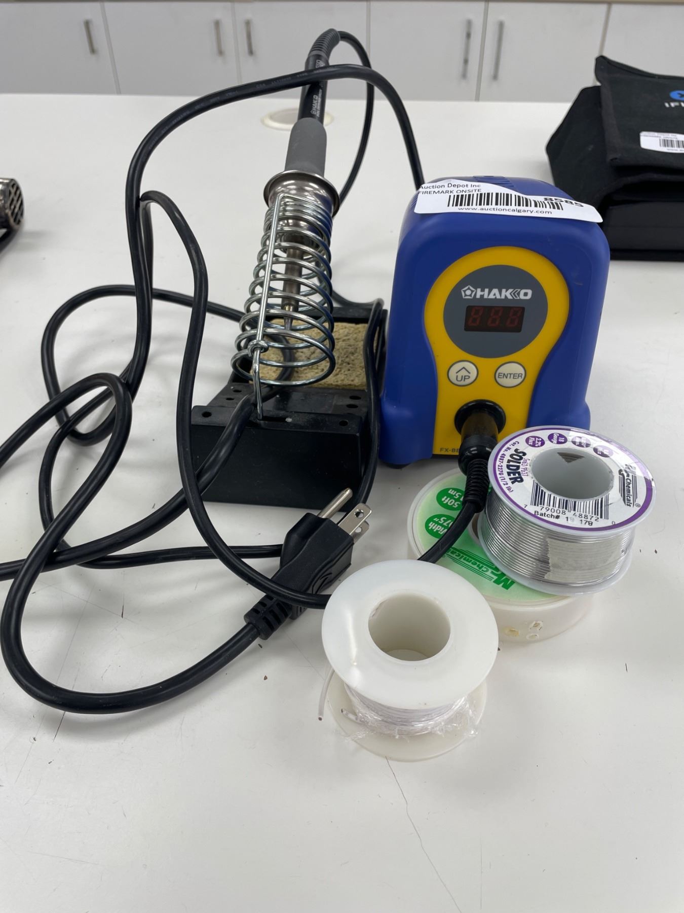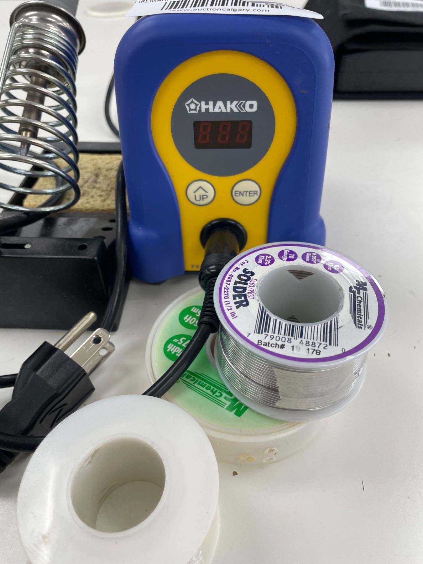 Hakko FX-888D soldering station featuring model FX-8801 soldering iron. Includes a temperature-controlled base station with up and enter buttons for adjustments. Comes with solder wire (various spools) as shown. Power specifications indicate 26V and 65W output for efficient operation. Includes all items depicted in images.