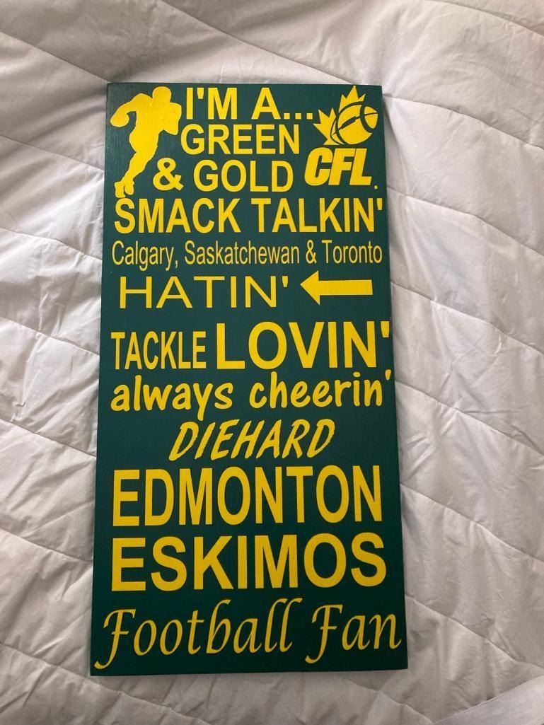 I'm a green and gold smack takin Calgary Saskatchewan & Toronto hatin tackle lovin always cheering Edmonton Eskimos Football Fan 12X24 Inches. Made of Pine. Hooks on Back