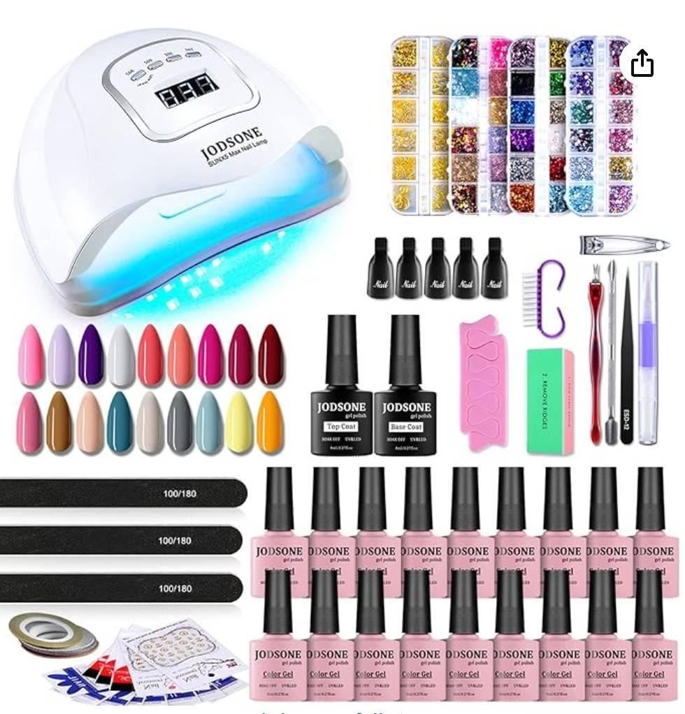 JODSONE Gel Nail Polish Kit with UV Light, 18 Colors Gel Nail Polish Set with 150W UV Led Nail Lamp Base Coat Top Coat DIY Home Manicure Tools Nail art Glitters Rhinestones **May Vary From Stock Photo**