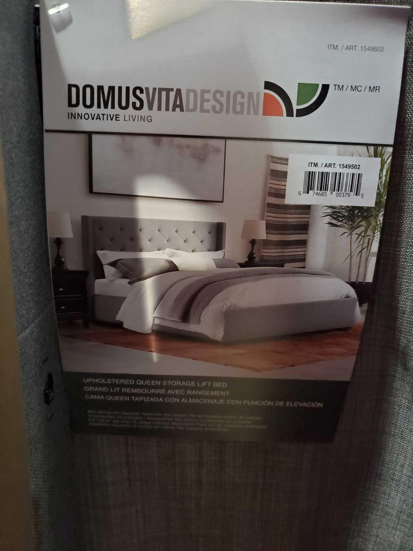 KING SIZE DOMUSVITA DESIGN UPHOLSTERED BED FRAME - includes head board, footboard and 2 side rails OPEN/OUT OF BOX - SOLD AS IS