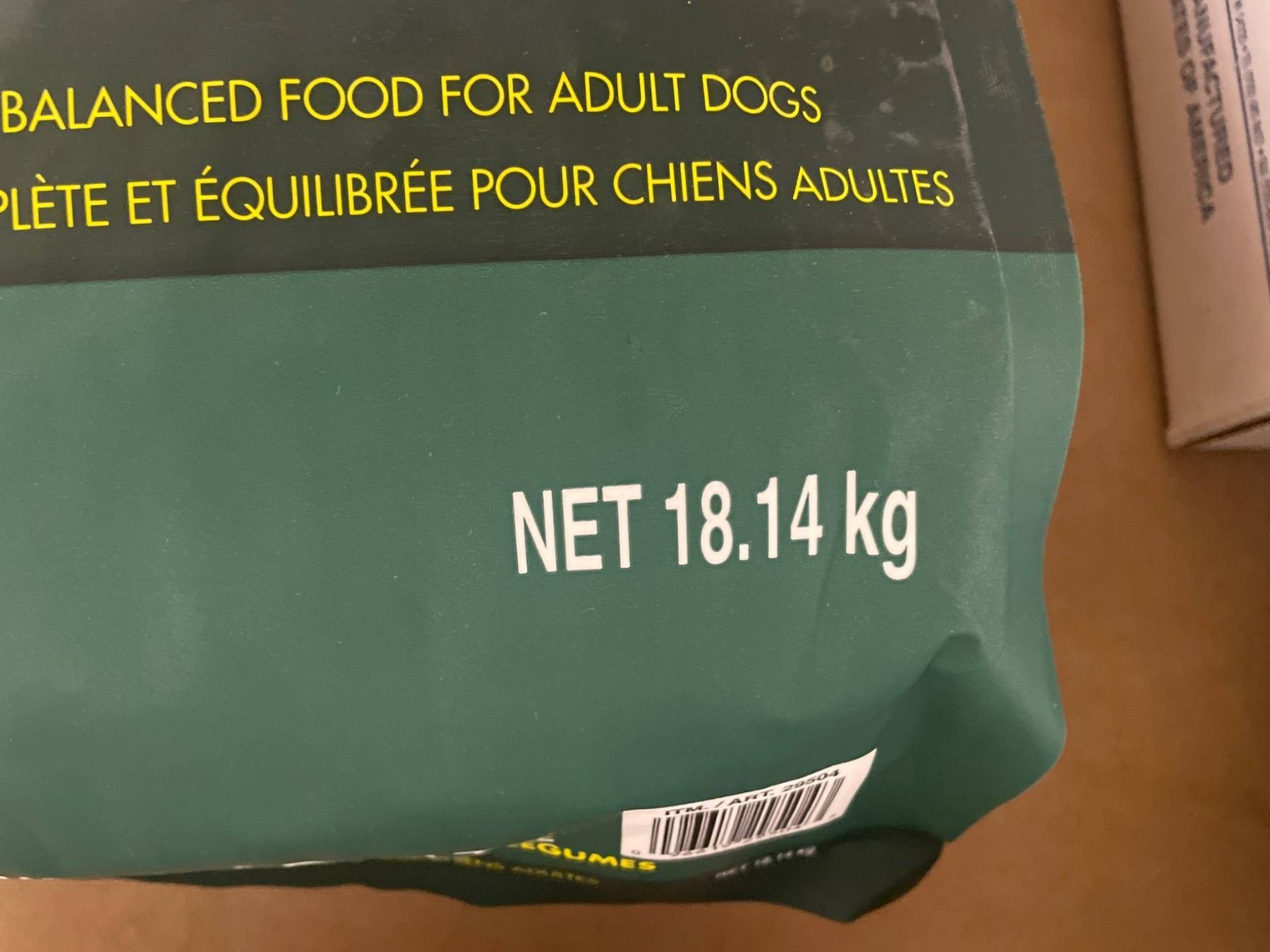 Kirkland Adult Dog Food featuring lamb, rice, and vegetable formula. The net weight is 18.14 kg (40 lbs). The product is formulated to provide a complete and balanced diet for adult dogs. Includes information in both English and French on the packaging. Specific details regarding ingredients are printed on the bag.