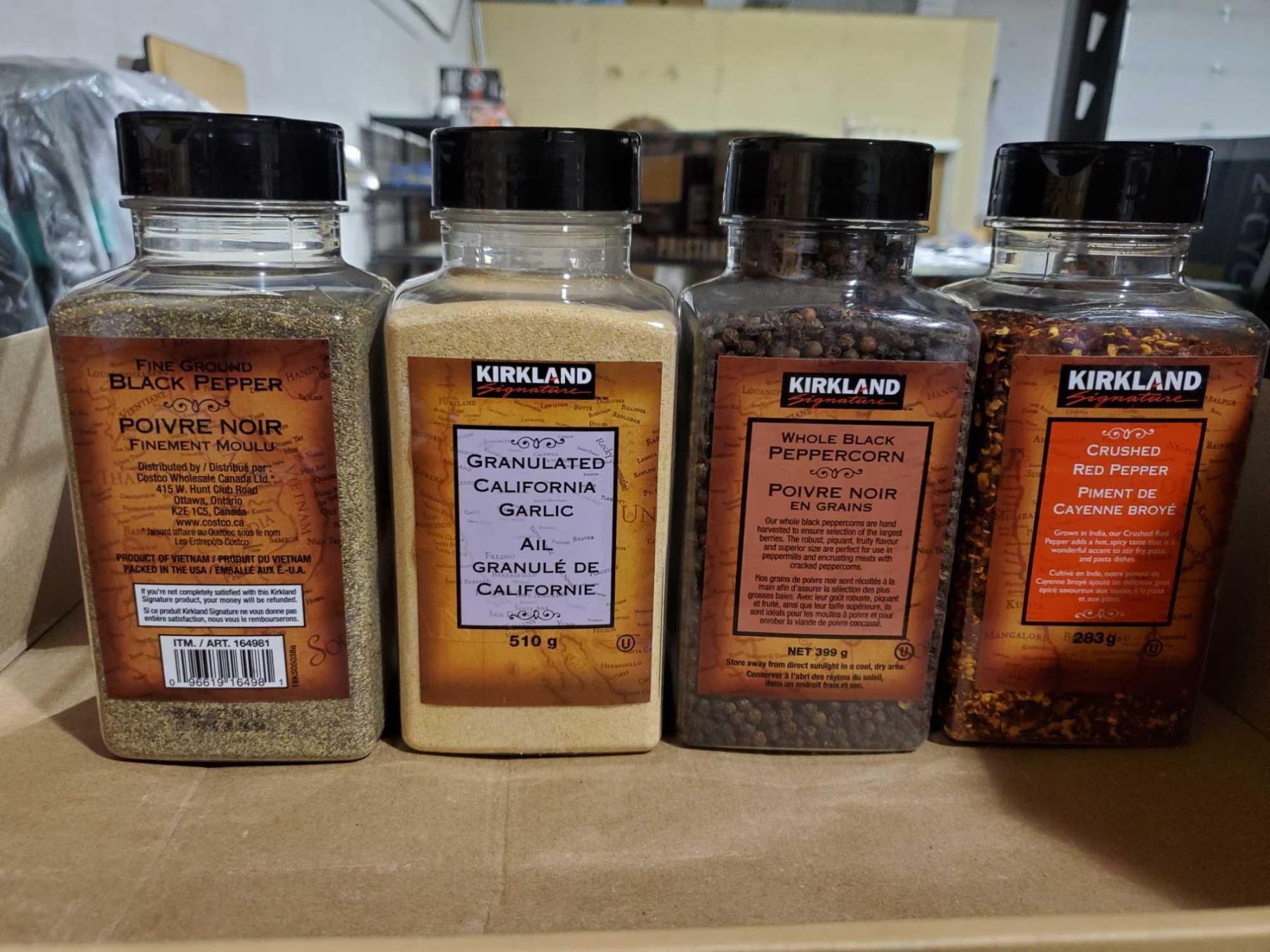 Kirkland Spices - Ground Black Pepper 348g, Granulated California Garlic 510g, Whole Black Peppercorns 399g & Crushed Red Pepper Flakes 283g