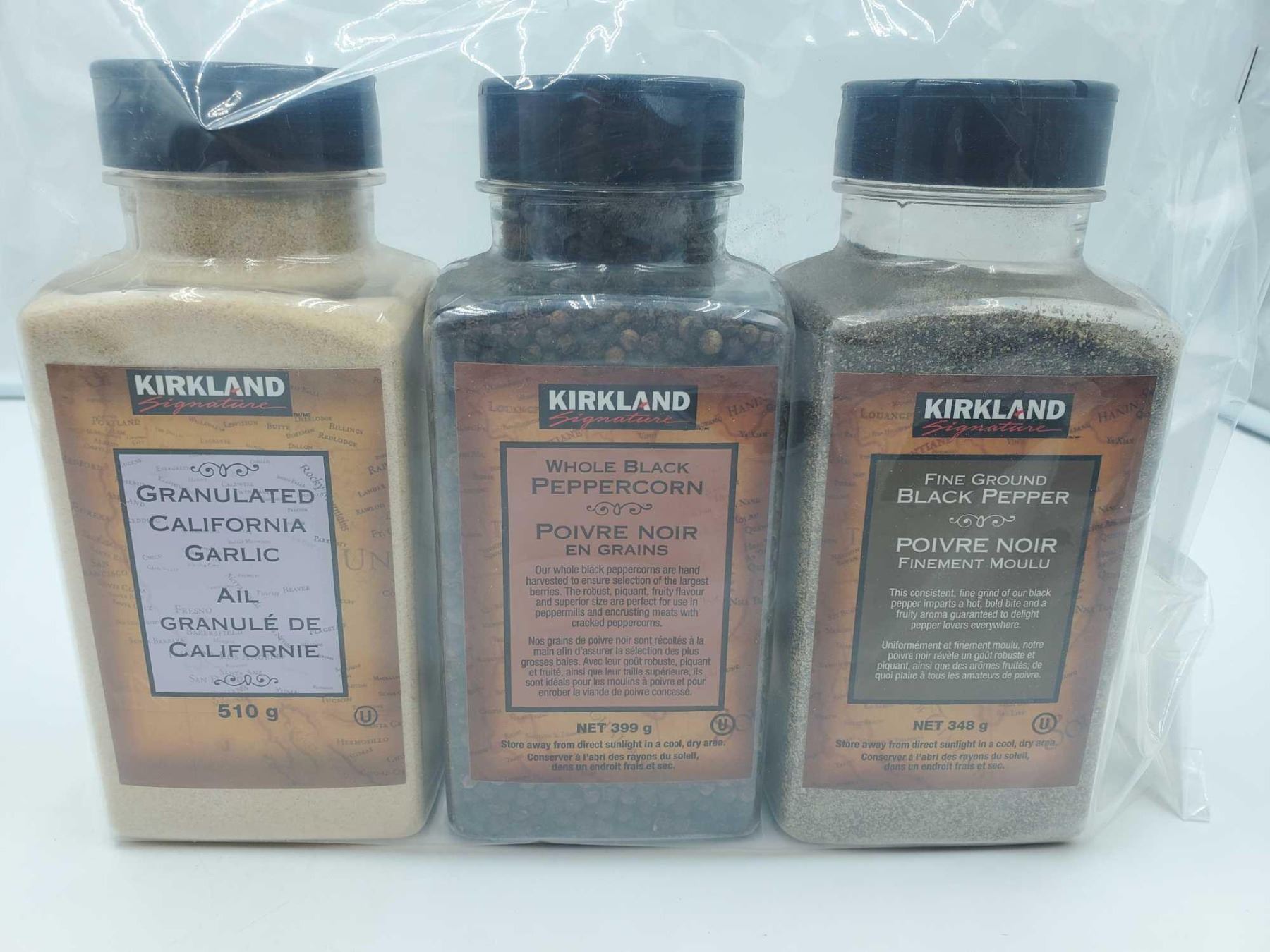 Kirkland Whole Black Peppercorn (399g) Fine Ground Pepper (348g) & Granulated California Garlic (510g)