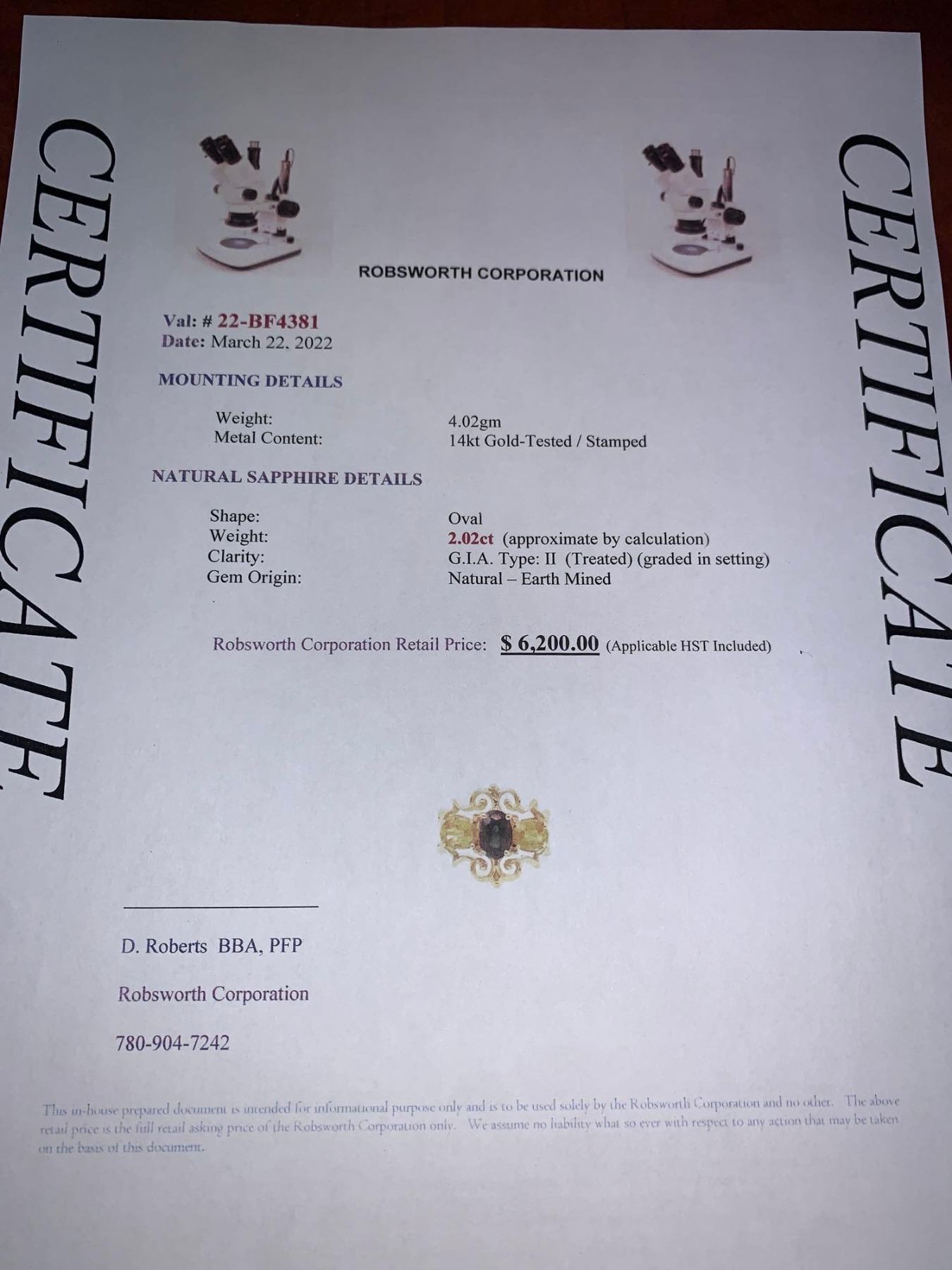 Ladies 14K Gold 2.02 Carat Oval Cut Sapphire Solitaires Anniversary Ring - Certificate Value $6200.00