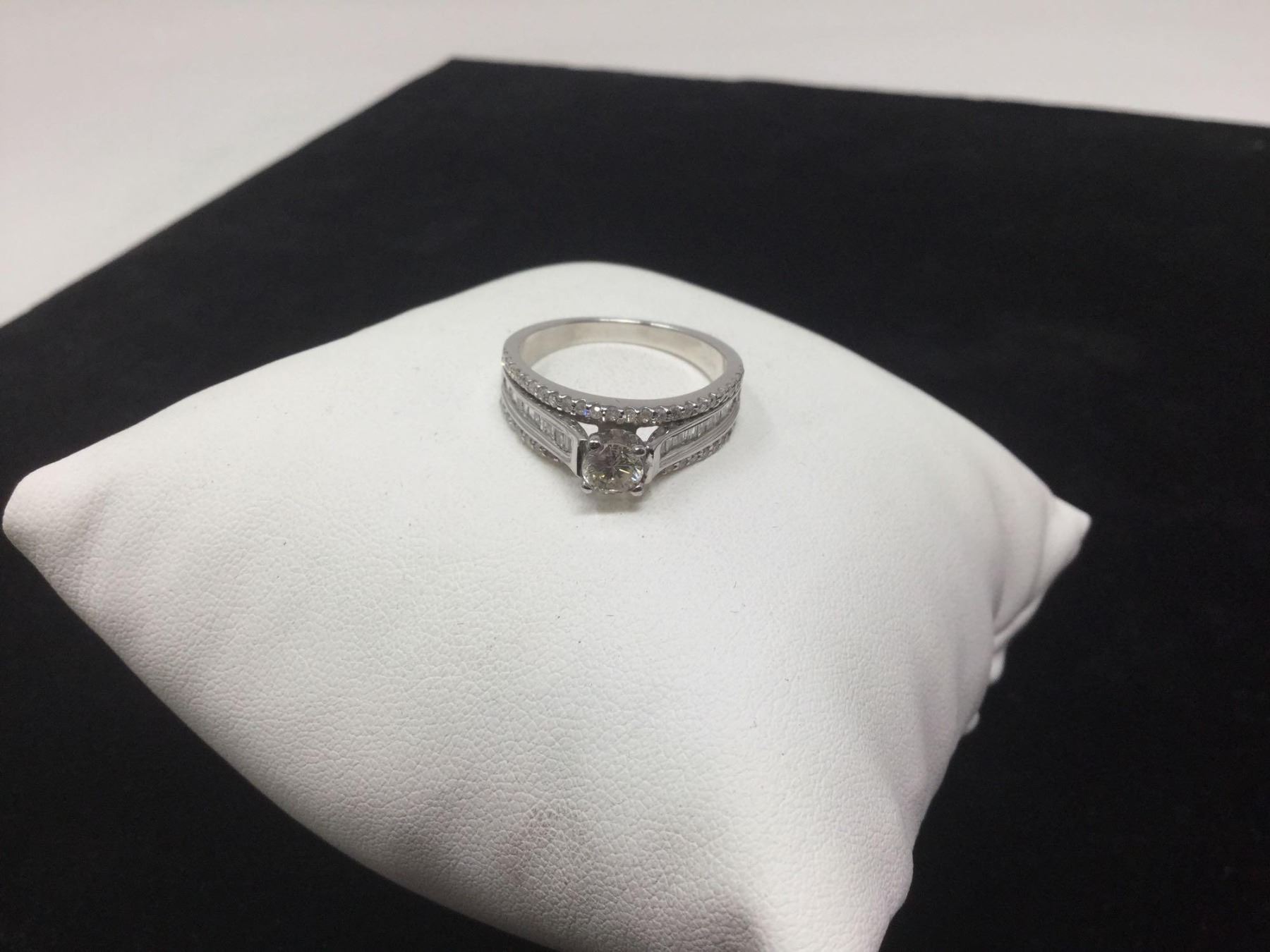 Ladies 14kt white gold diamond solitaire 1.36 carat engagement ring with appraisal certificate value $15,800.00