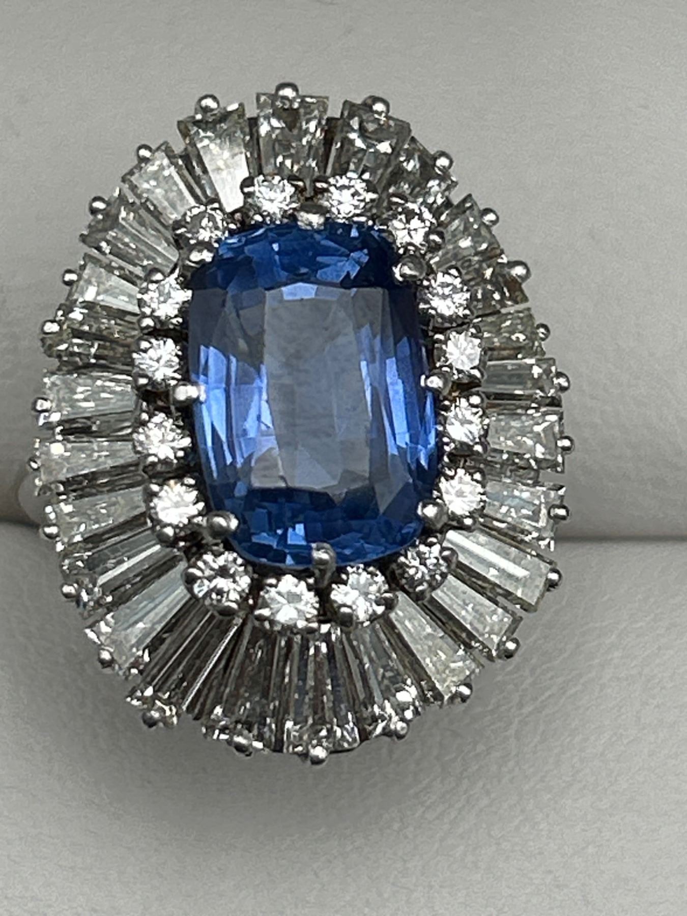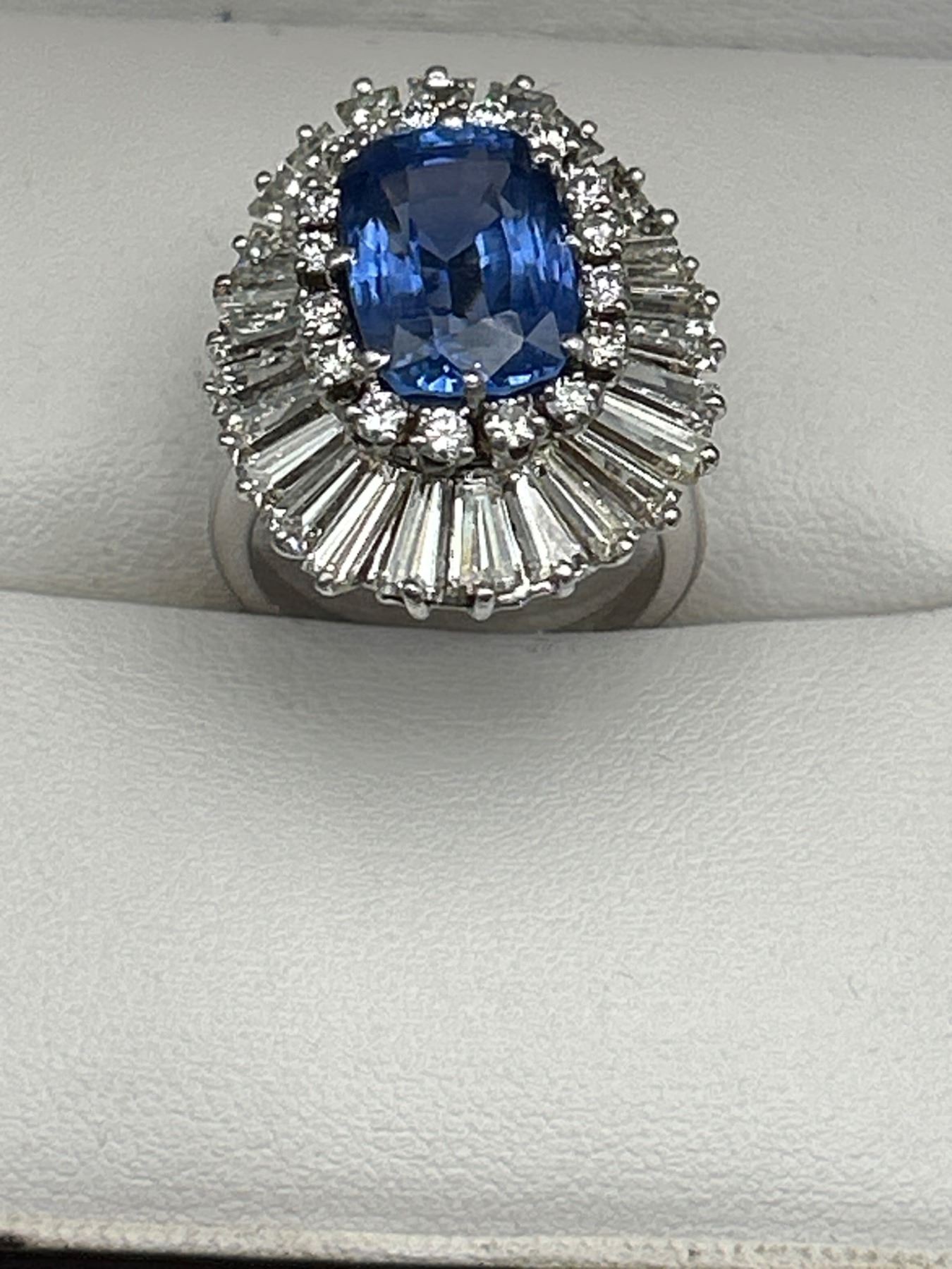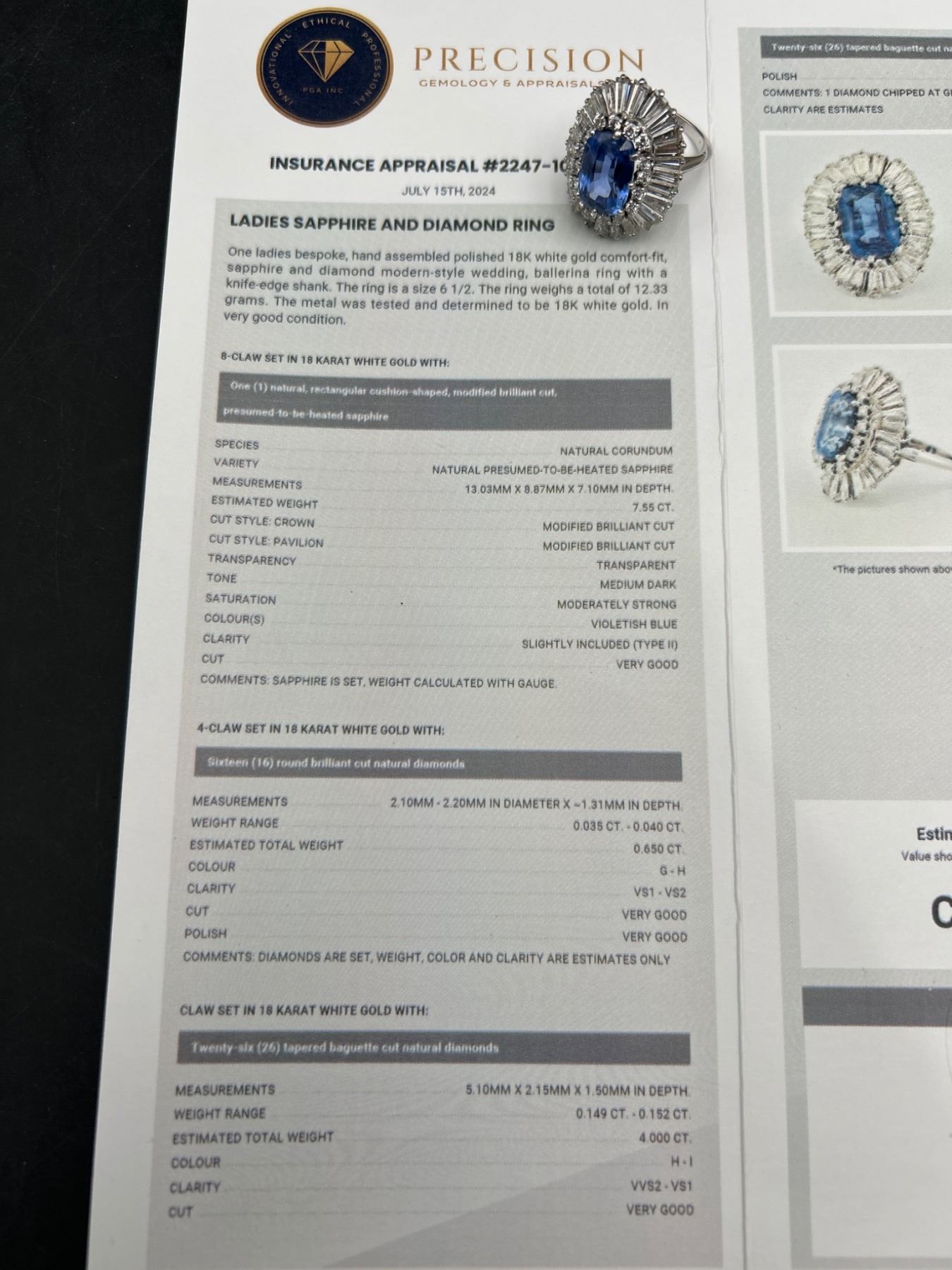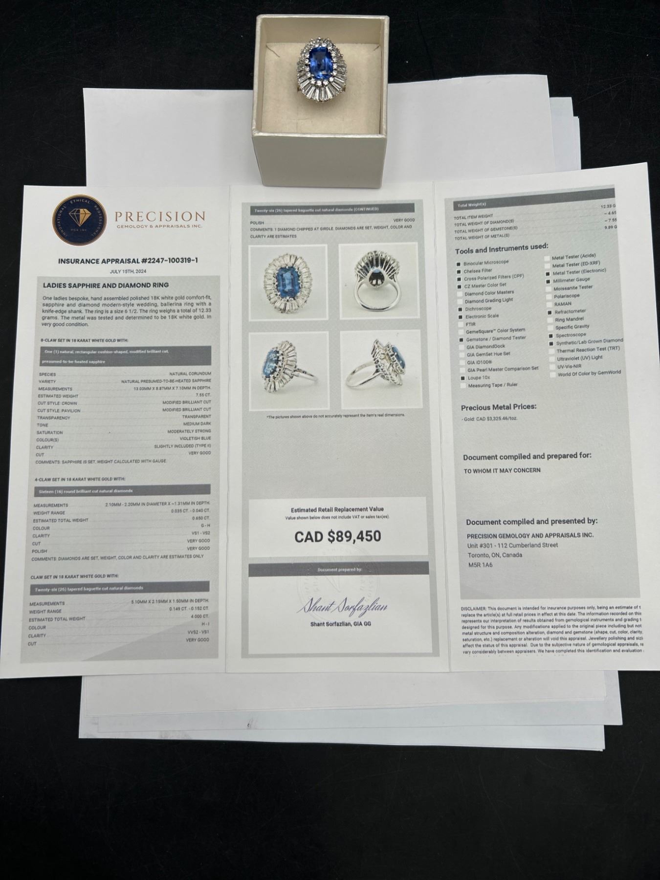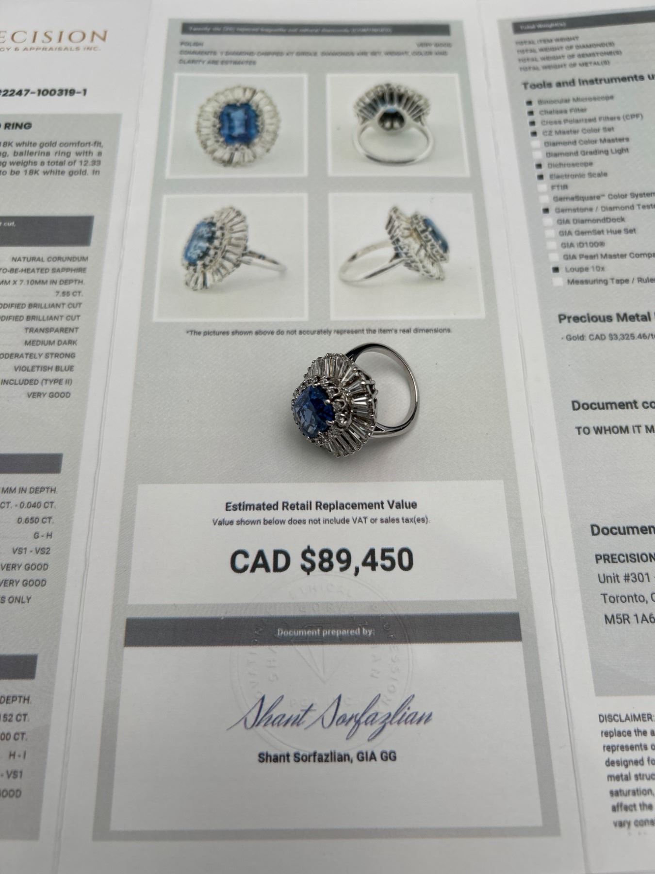 This Ladies Sapphire and Diamond Ring features a 7.55ct natural blue sapphire in a cushion mixed cut, surrounded by a two-tiered design with round brilliant and baguette-cut diamonds, totaling 4.00 ct. The metal is crafted in 18-karat white gold and weighs 15.2 grams. The sapphire clarity is lightly included, and the diamonds are graded VS/SI clarity and F/G color. The appraisal value provided is CAD 89,450.