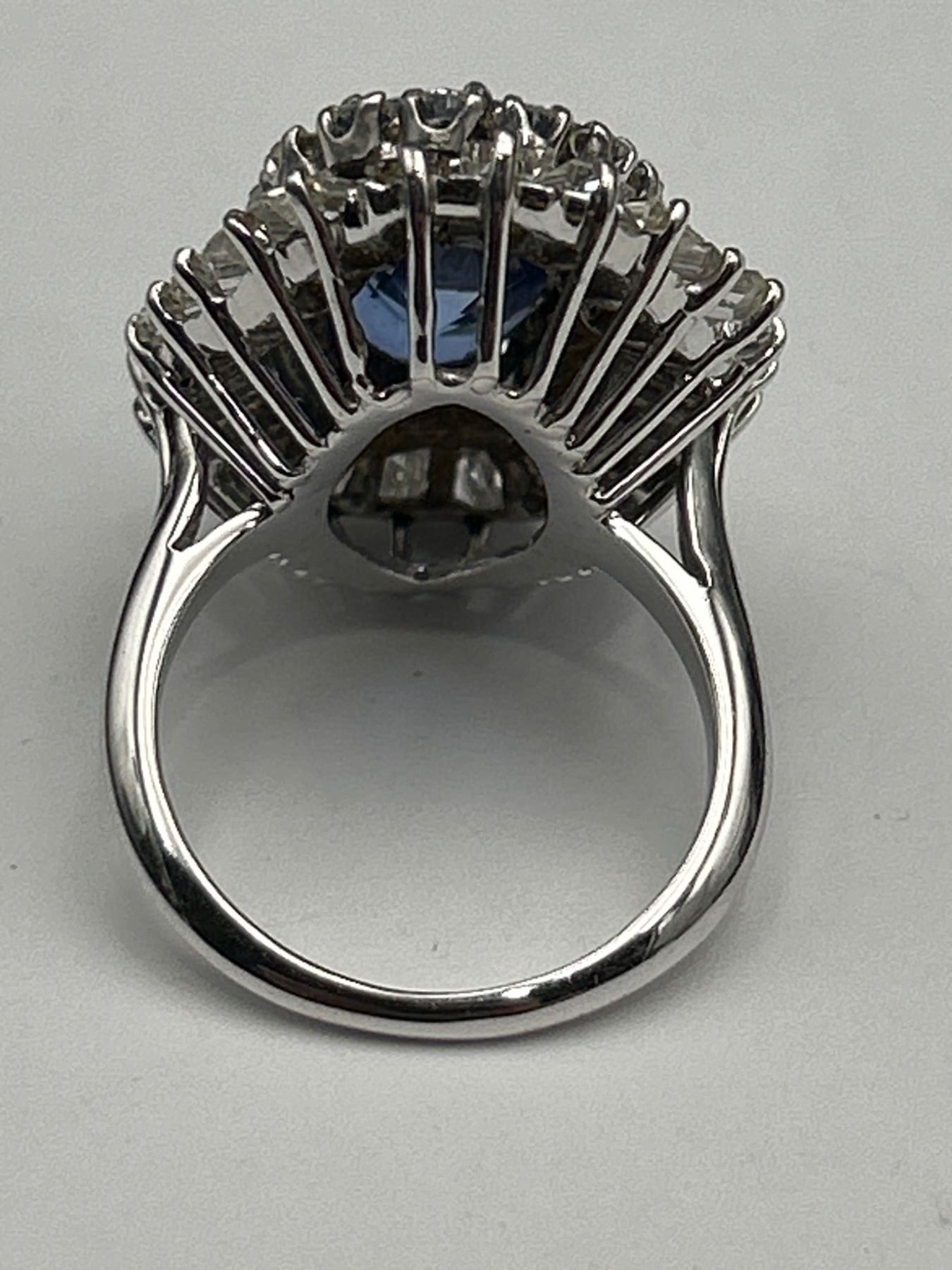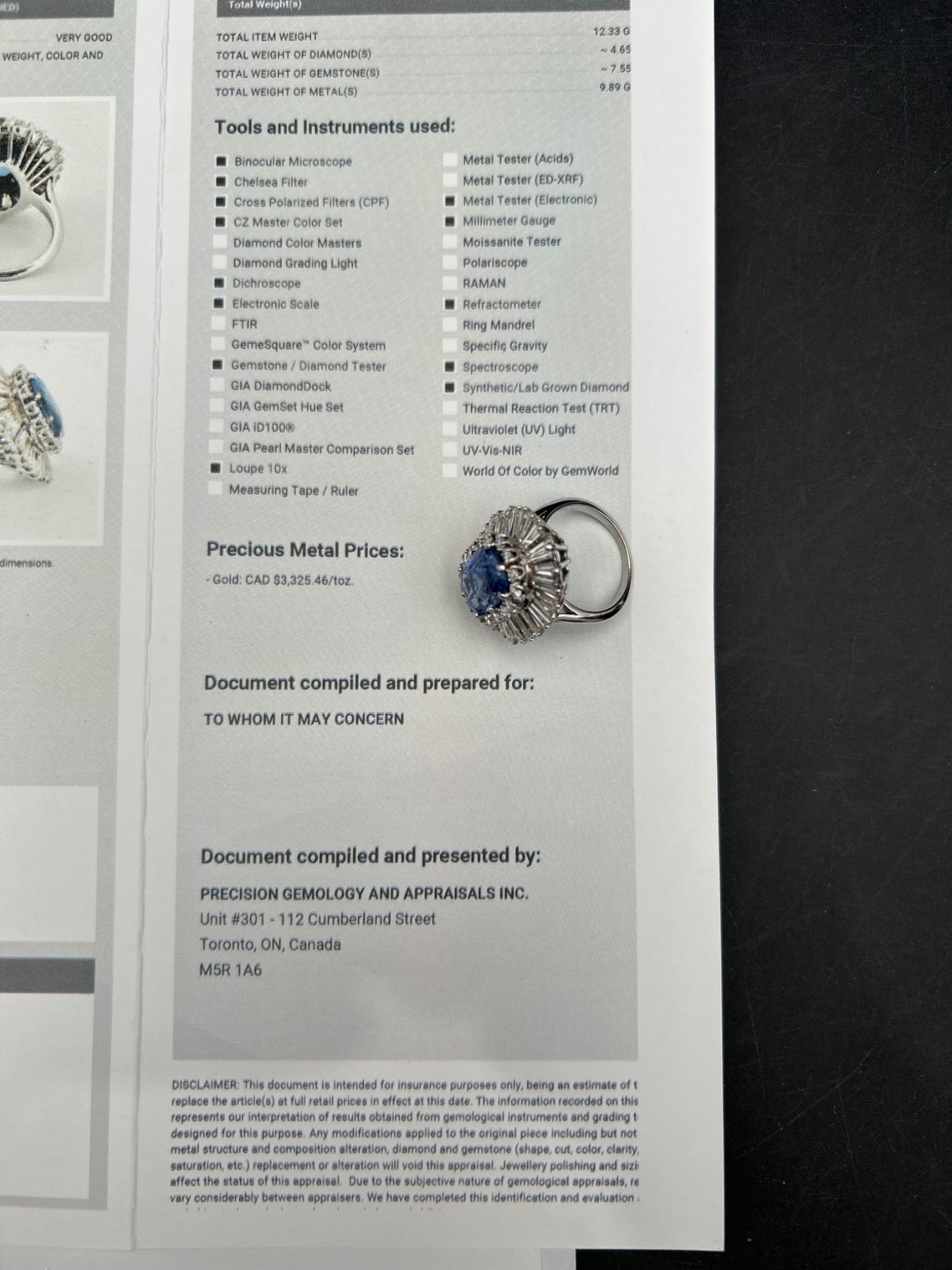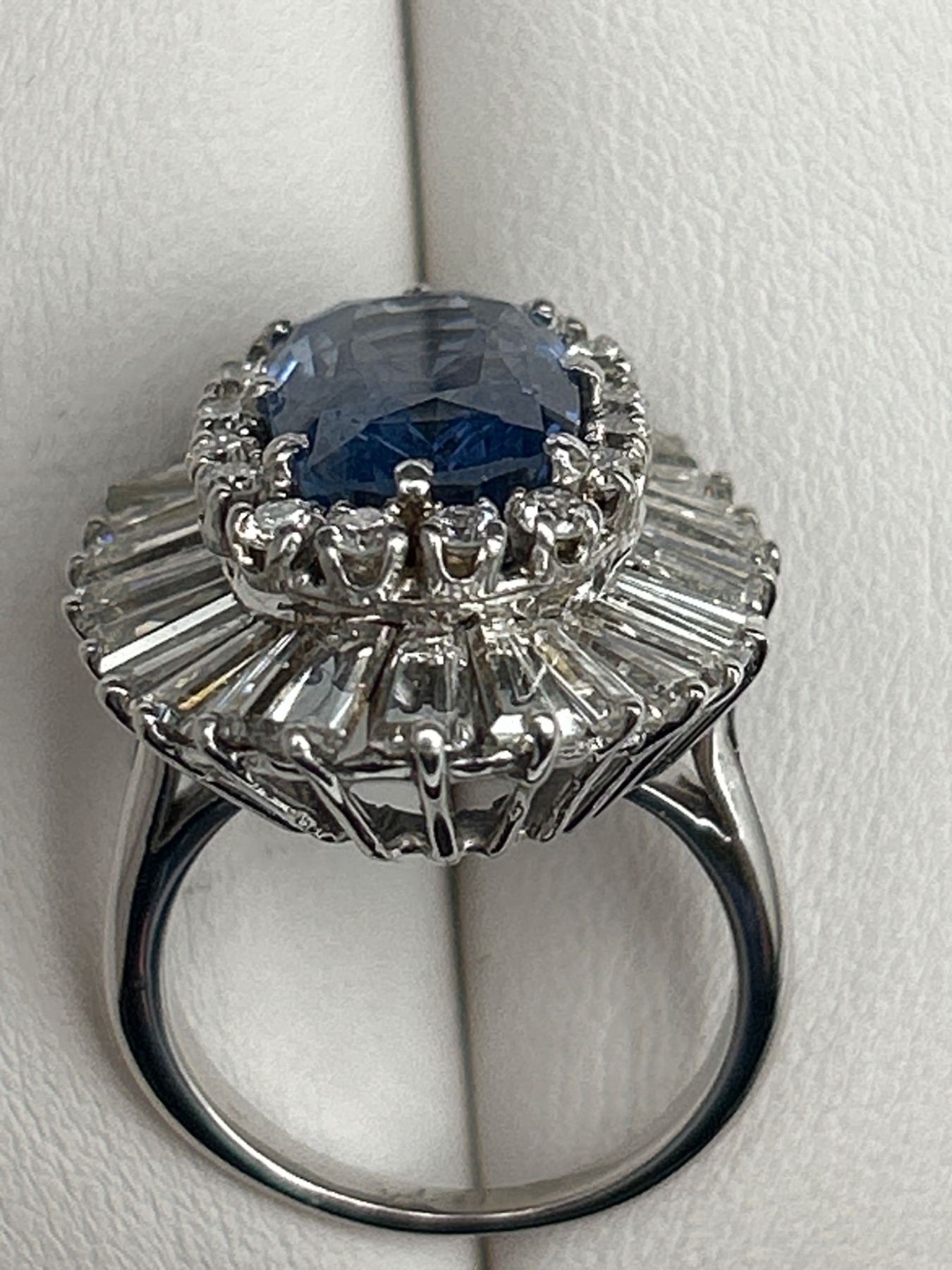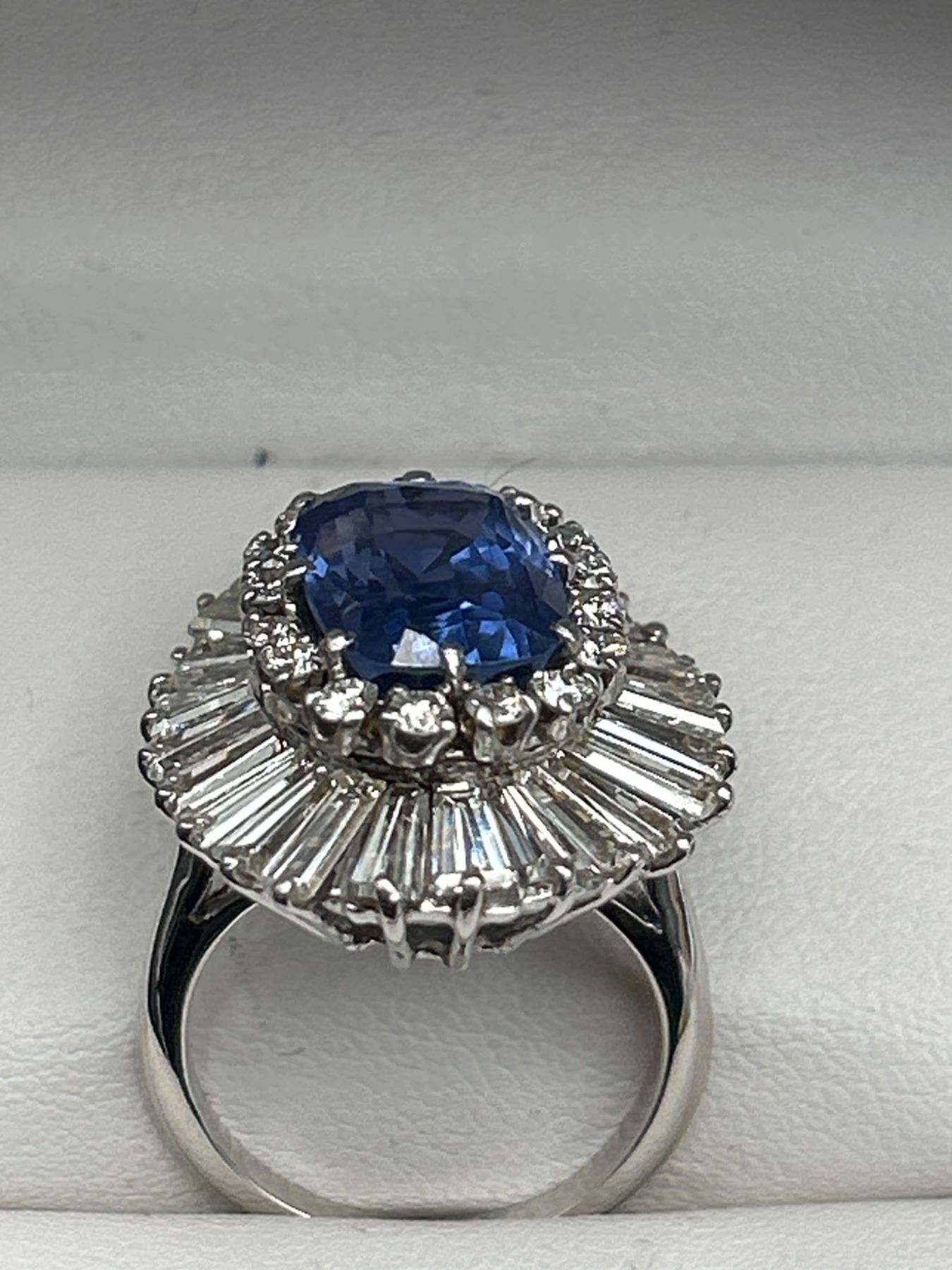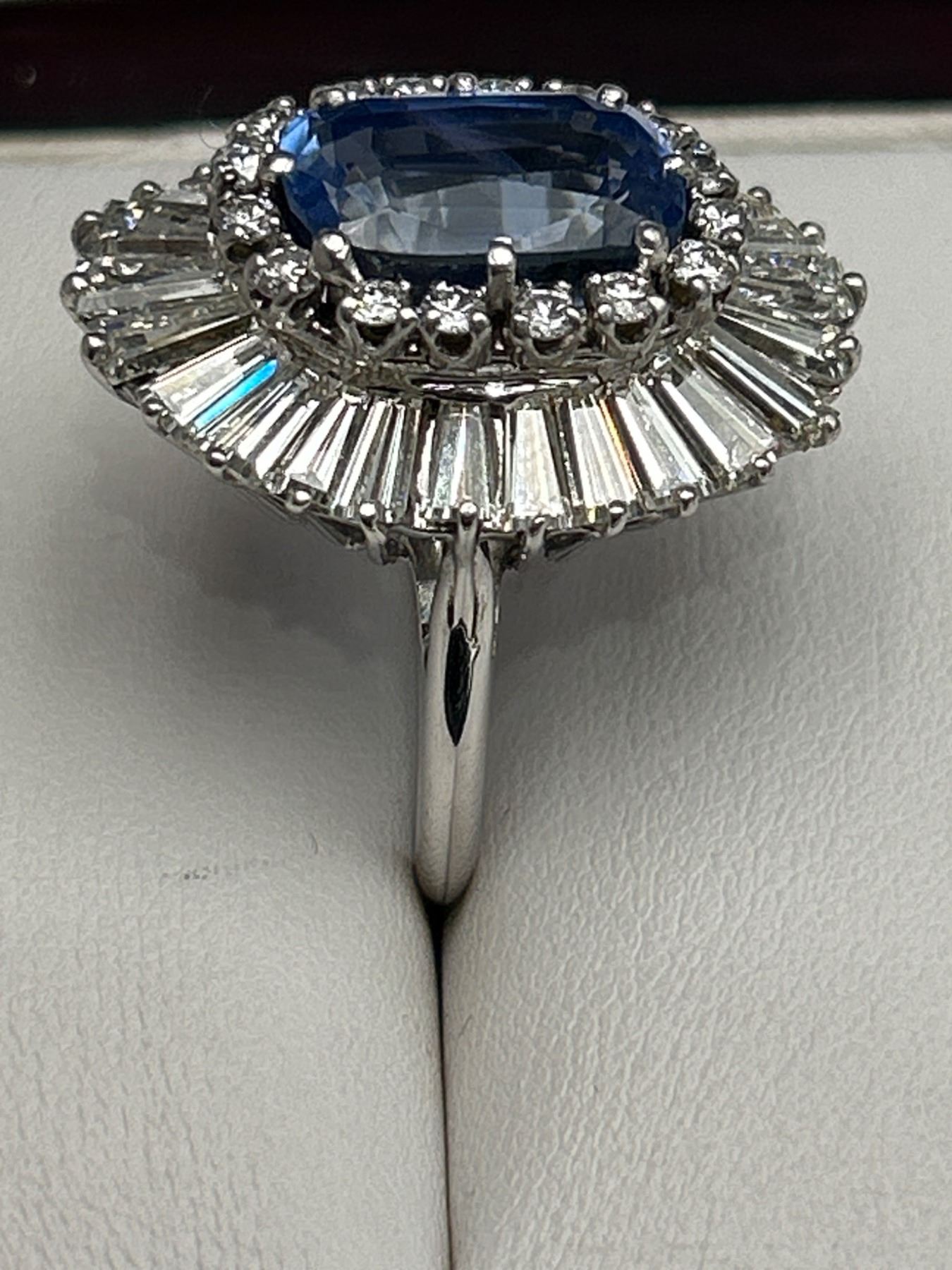 This Ladies Sapphire and Diamond Ring features a 7.55ct natural blue sapphire in a cushion mixed cut, surrounded by a two-tiered design with round brilliant and baguette-cut diamonds, totaling 4.00 ct. The metal is crafted in 18-karat white gold and weighs 15.2 grams. The sapphire clarity is lightly included, and the diamonds are graded VS/SI clarity and F/G color. The appraisal value provided is CAD 89,450.