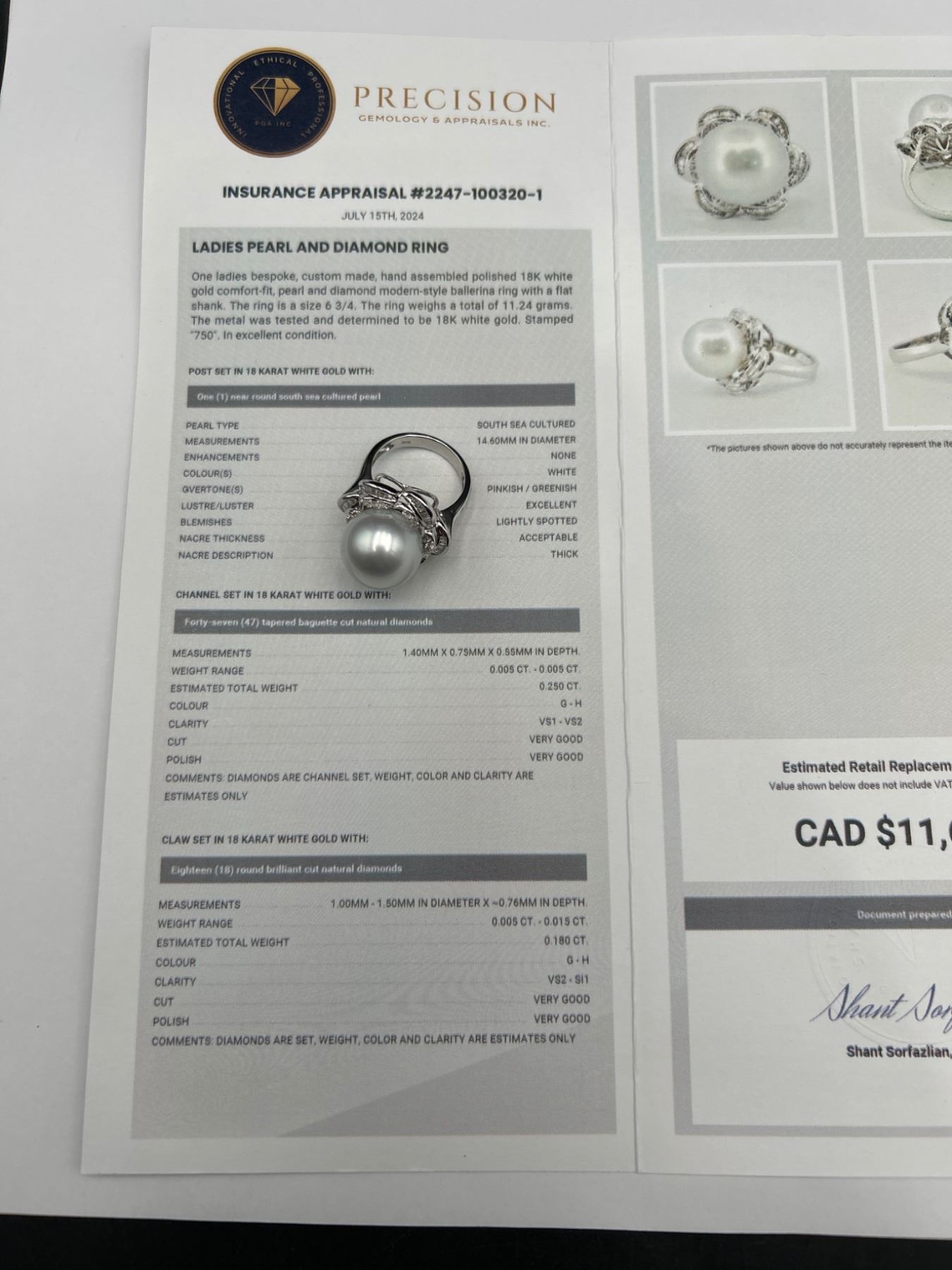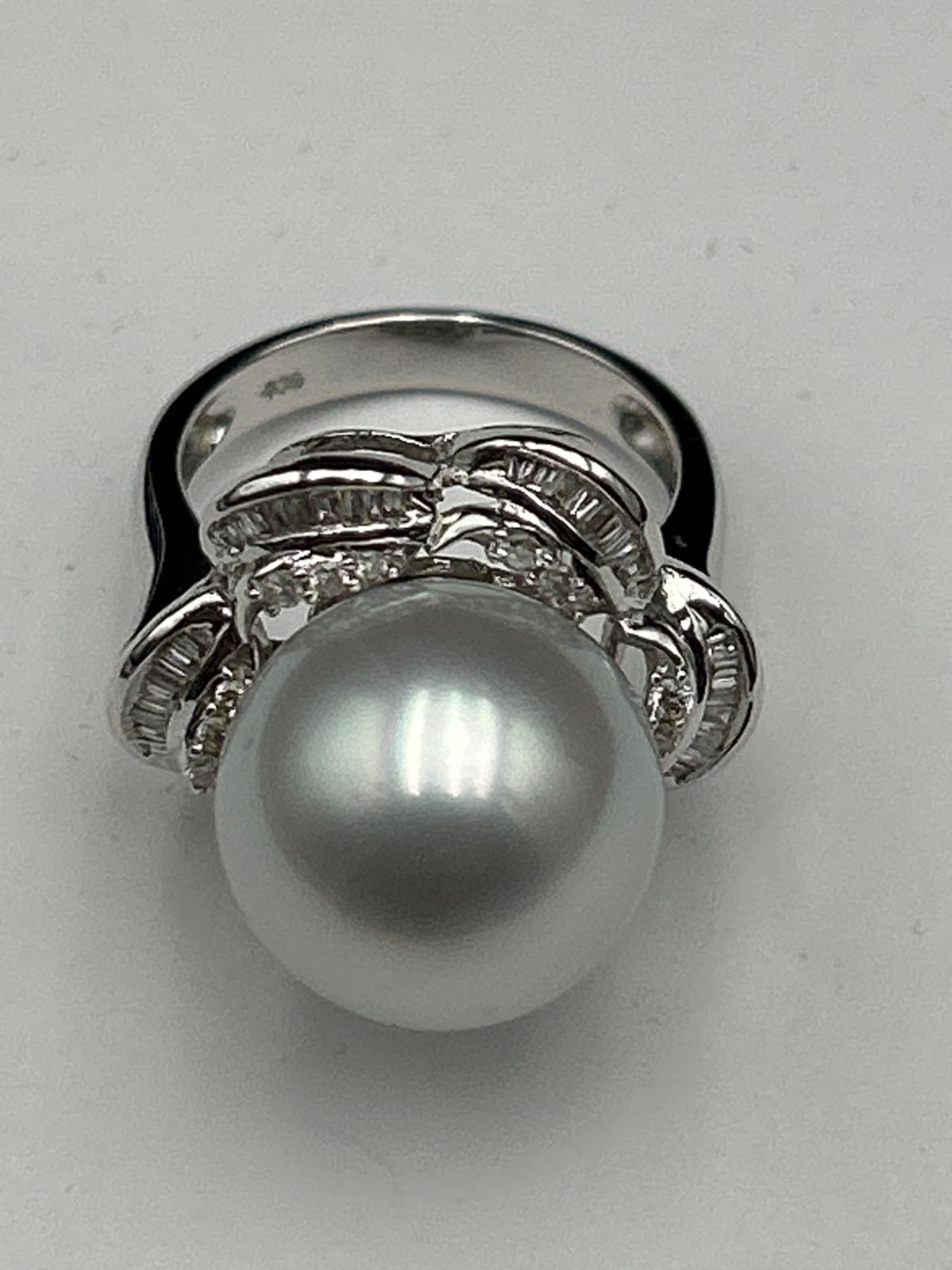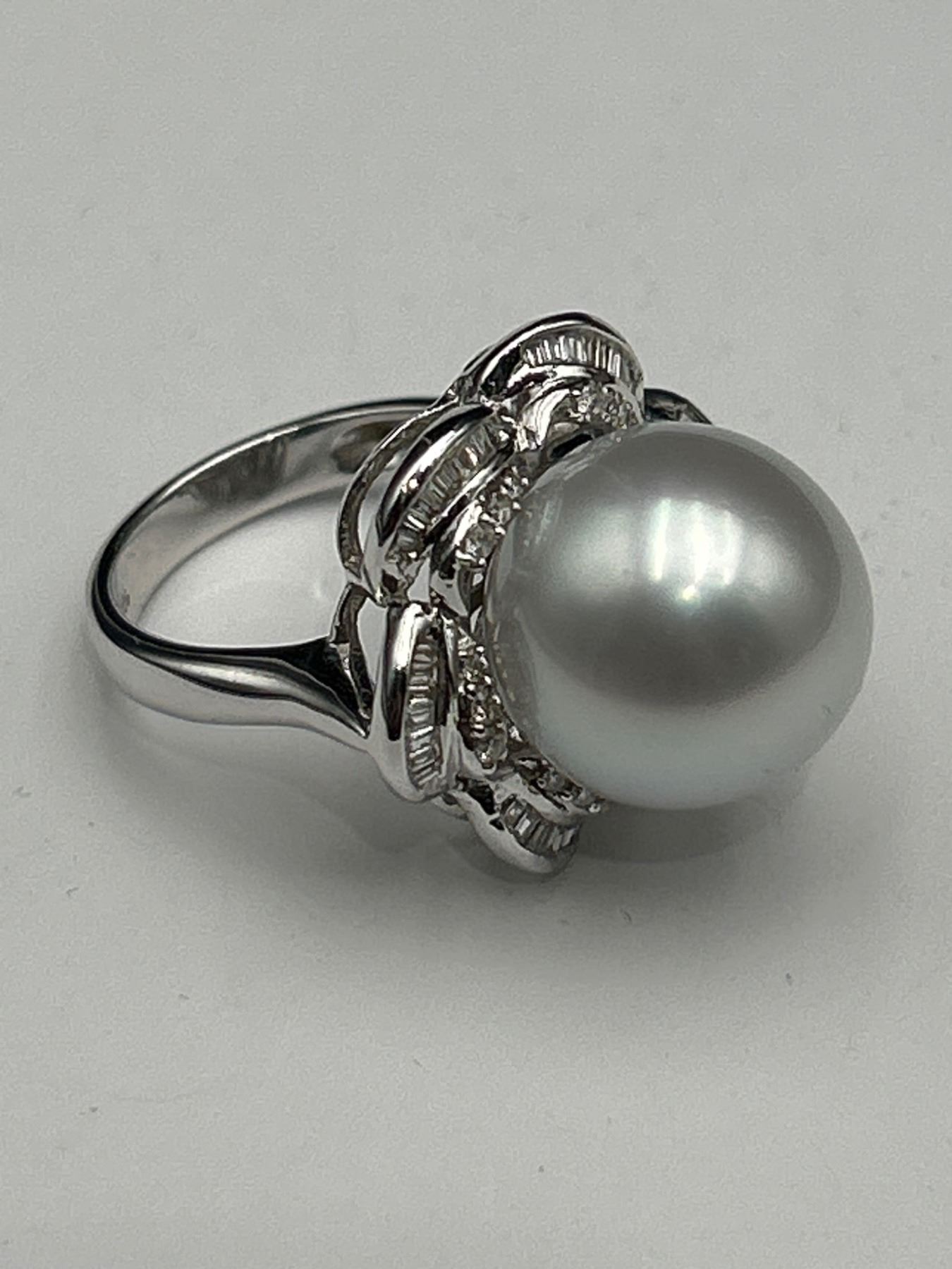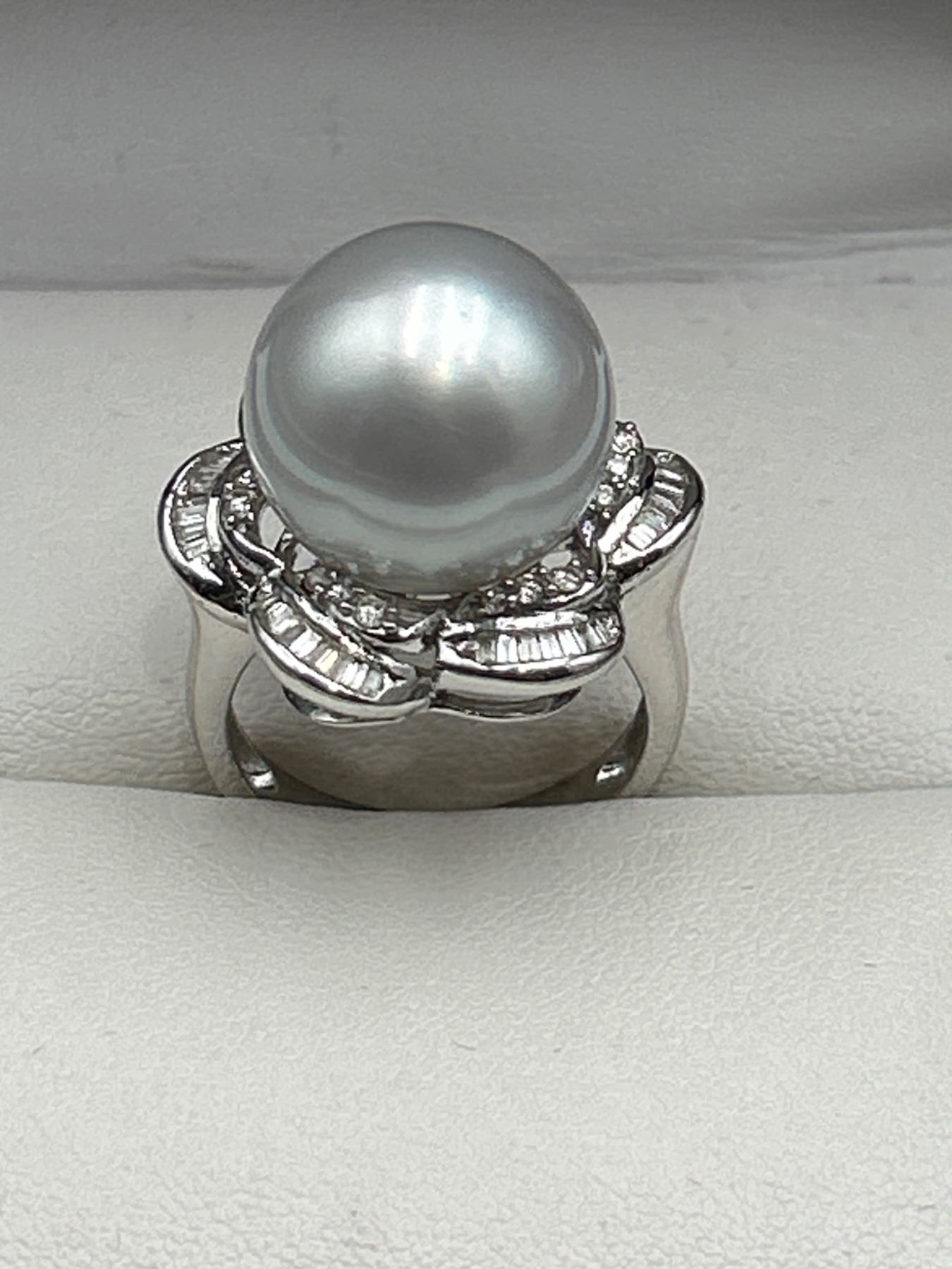 This is a ladies’ pearl and diamond ring crafted from 18K white gold. The ring features a 14.6 mm round white South Sea cultured pearl and is enhanced with 47 tapered baguette diamonds totaling approximately .25 carats. Diamonds are F-G color and VS clarity. Size: 7.0. Appraised value is CAD 11,650 by Precision Gemology and Appraisals Inc.