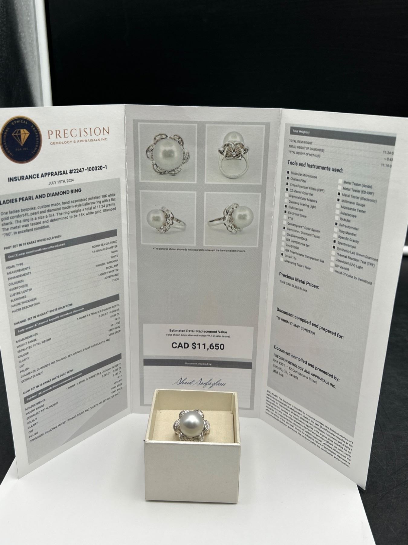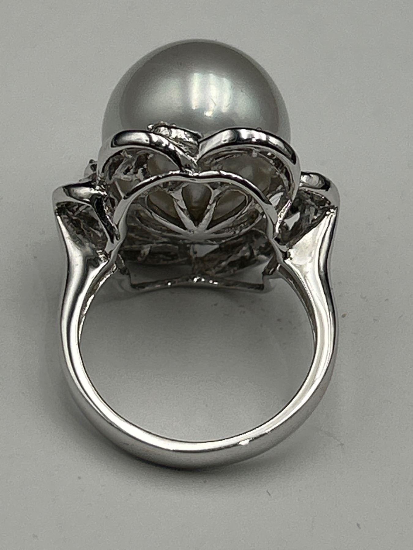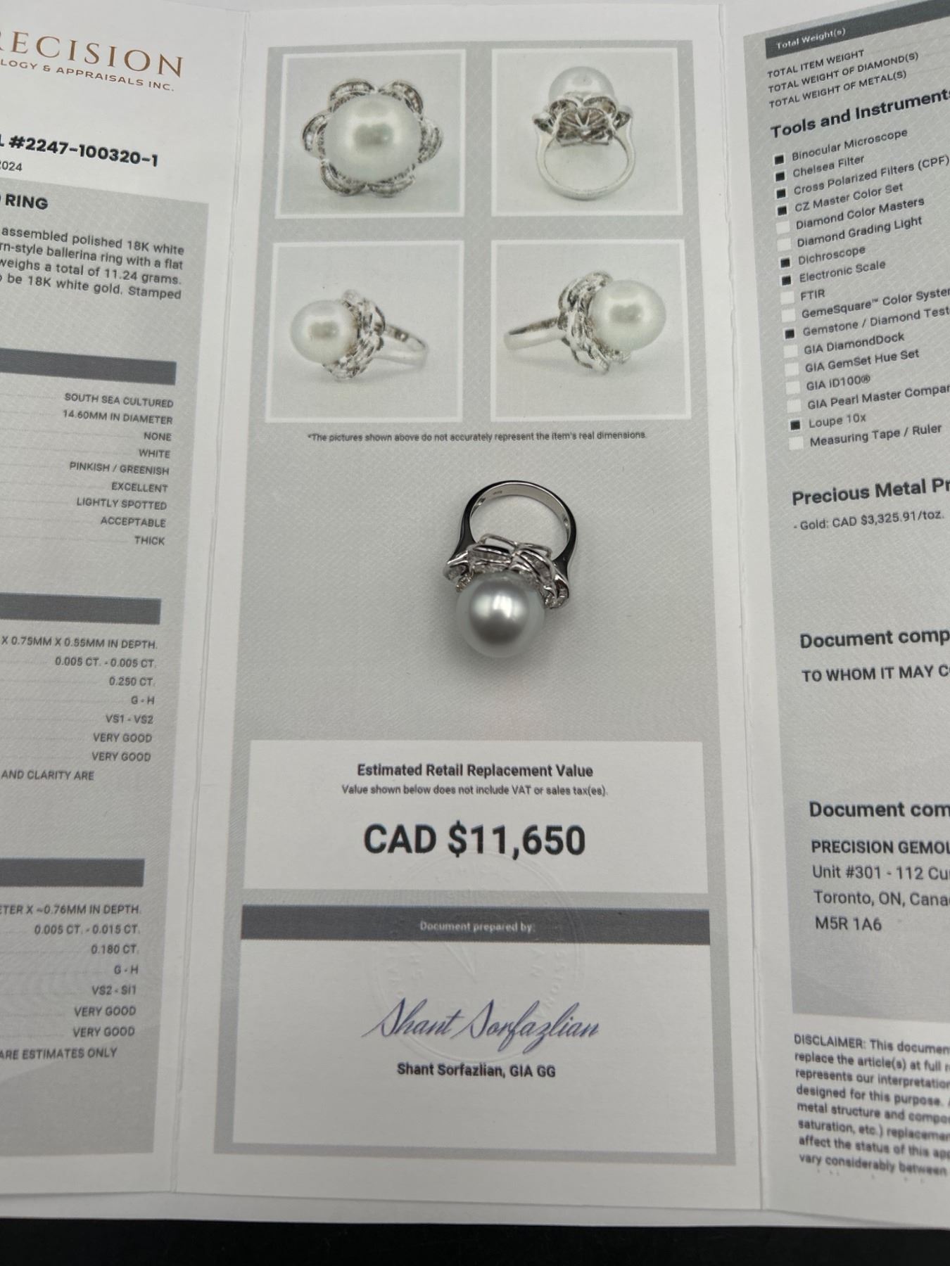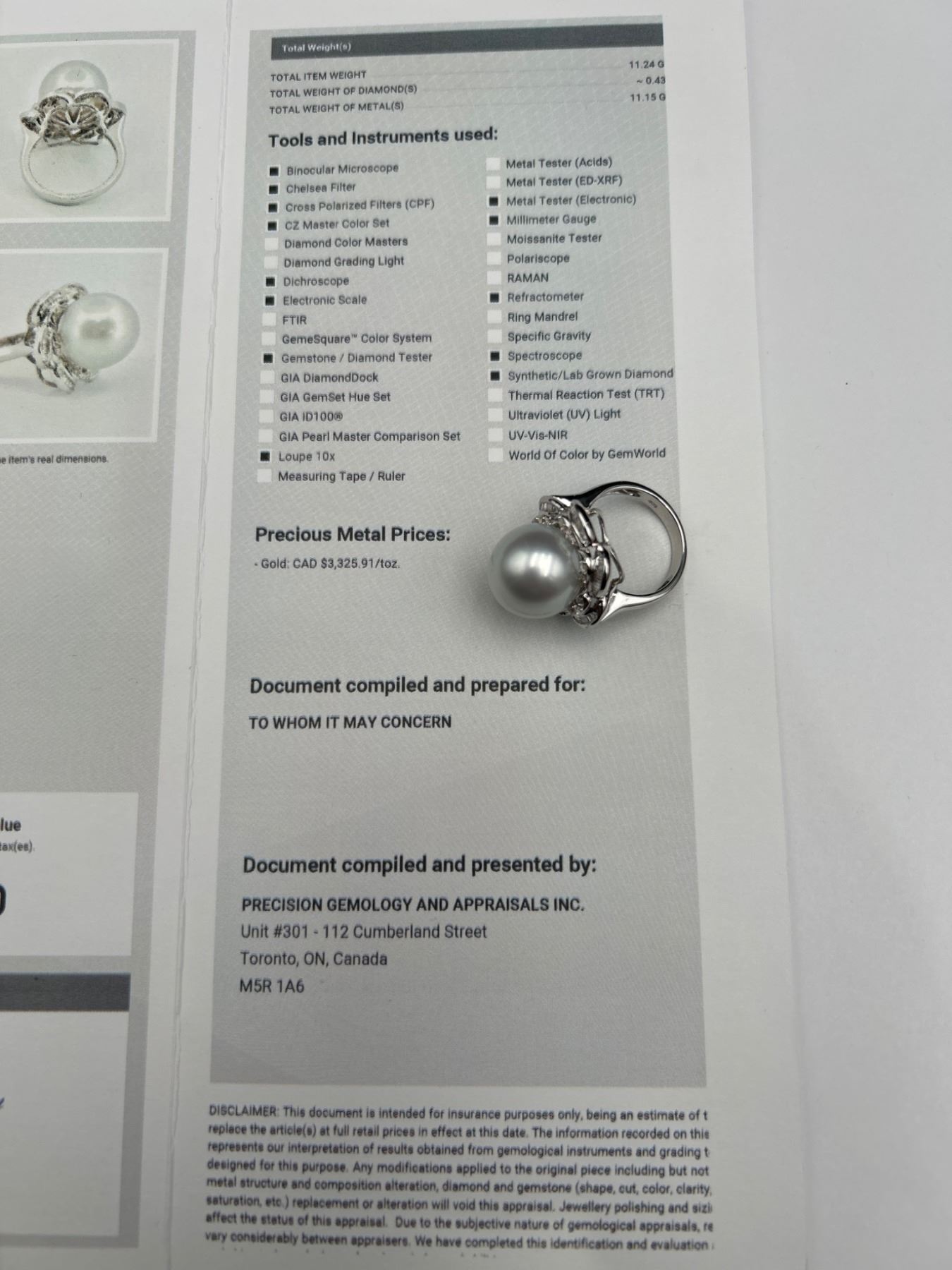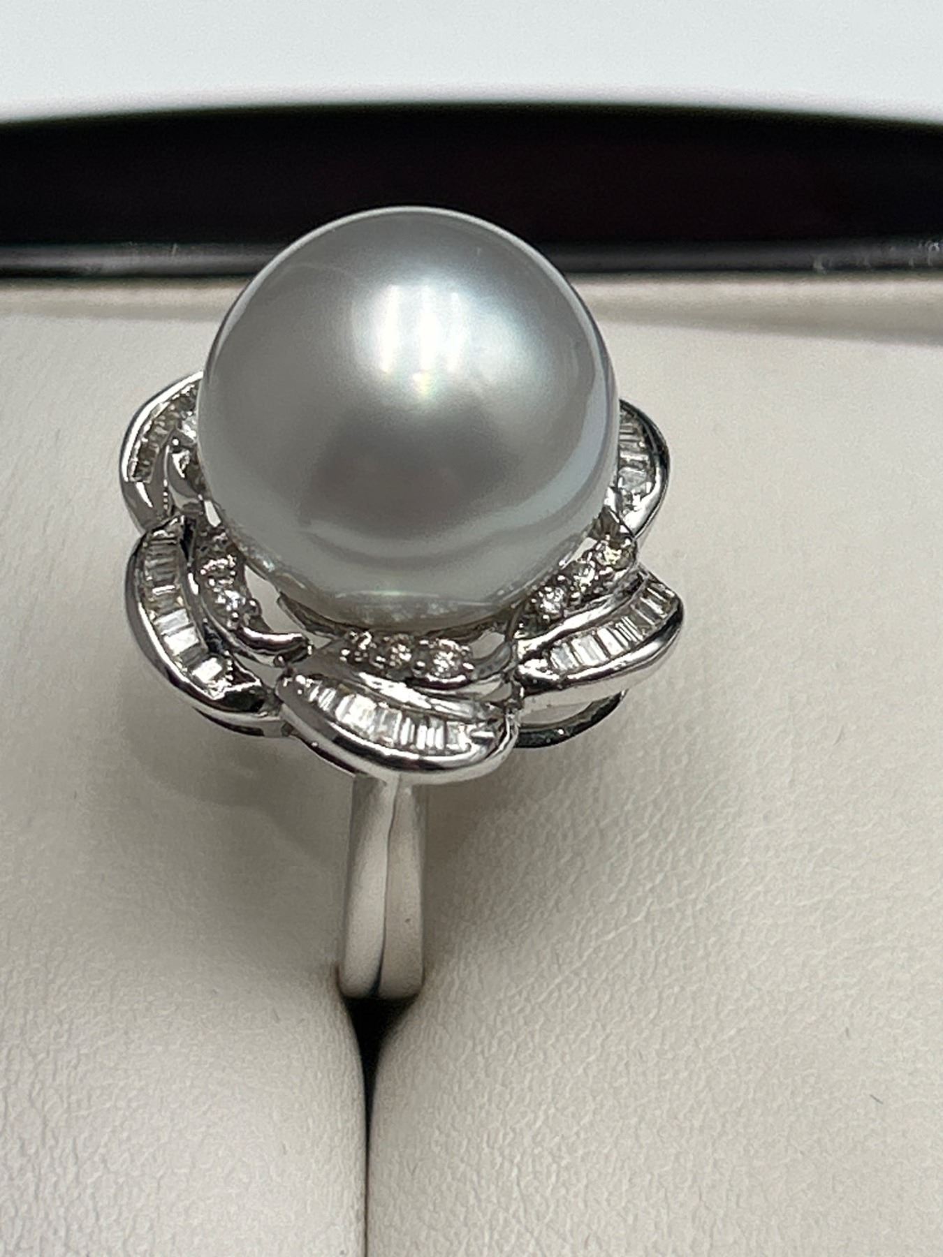 This is a ladies’ pearl and diamond ring crafted from 18K white gold. The ring features a 14.6 mm round white South Sea cultured pearl and is enhanced with 47 tapered baguette diamonds totaling approximately .25 carats. Diamonds are F-G color and VS clarity. Size: 7.0. Appraised value is CAD 11,650 by Precision Gemology and Appraisals Inc.