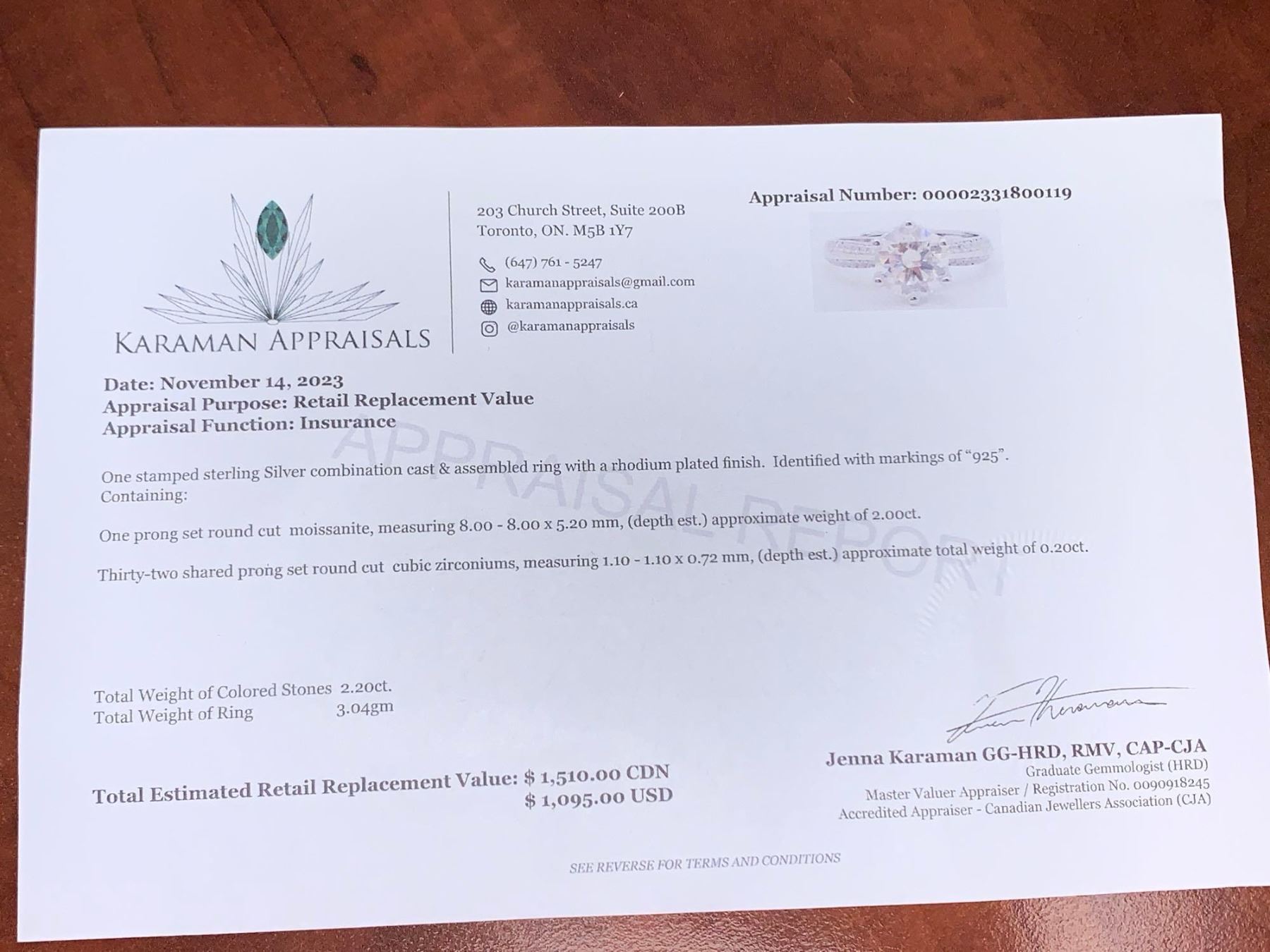 Ladies 2.0 Carat Brillisnt Cut Moissanit Solitaire .925 Silver ring with appraisal $1510.00