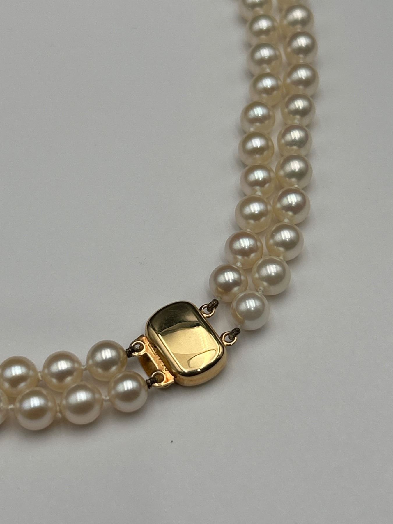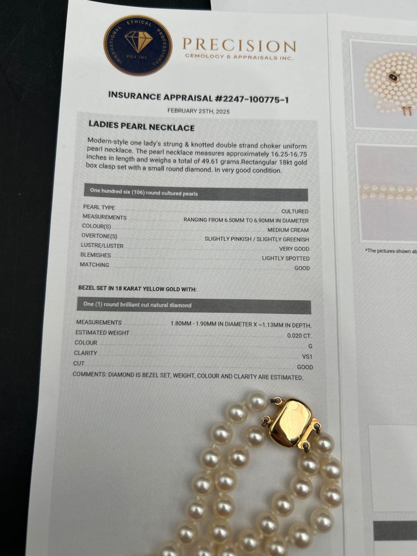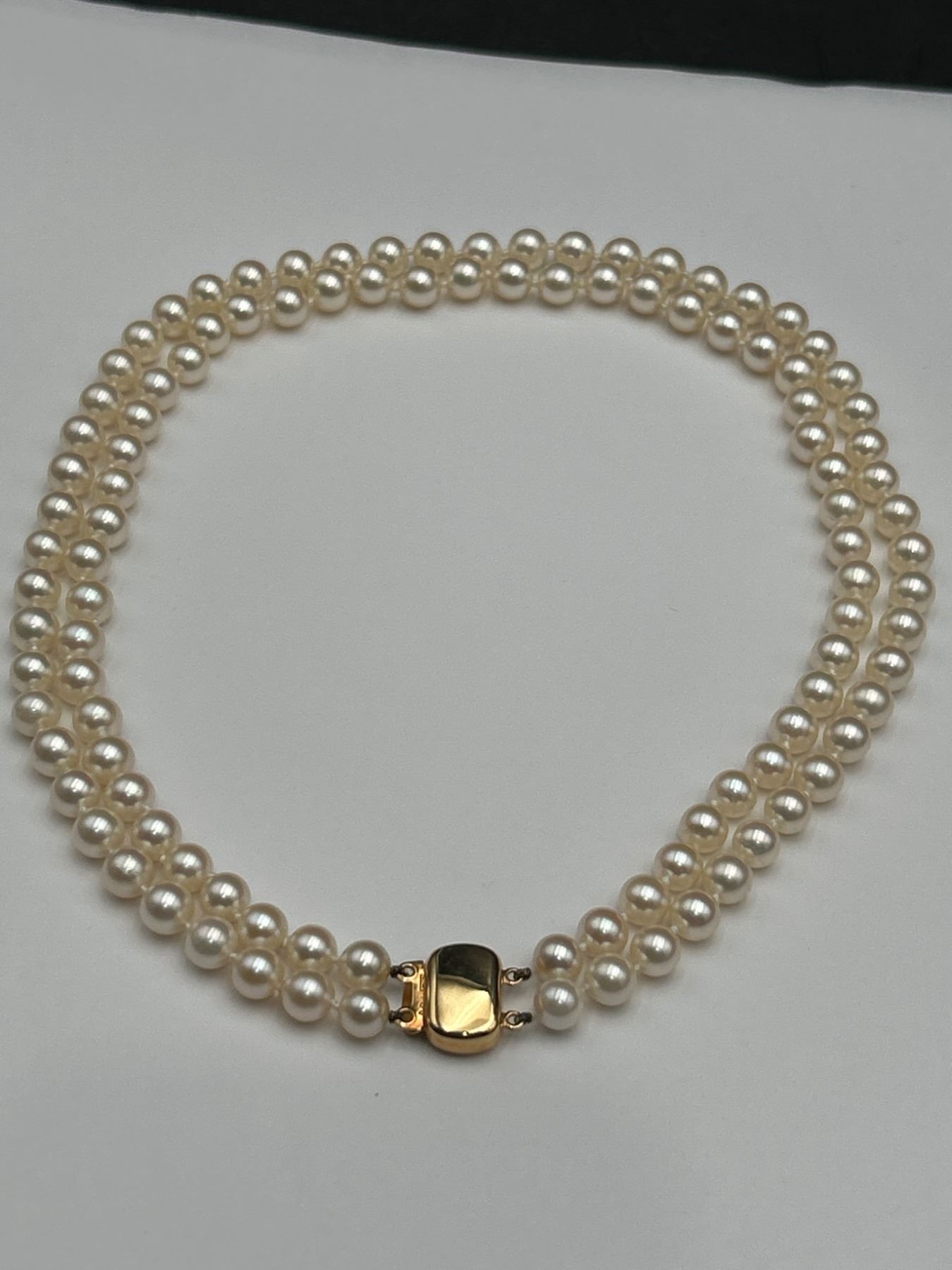 This lot features a ladies double-strand necklace of cultured pearls, including a total of 106 pearls The necklace is equipped with a 14-karat yellow gold clasp, weighing a total of 49.60 grams. The pearls exhibit good luster, surface quality, and roundness. This necklace is appraised by Precision Gemology & Appraisals Inc. with an estimated retail replacement value of CAD 4,750.