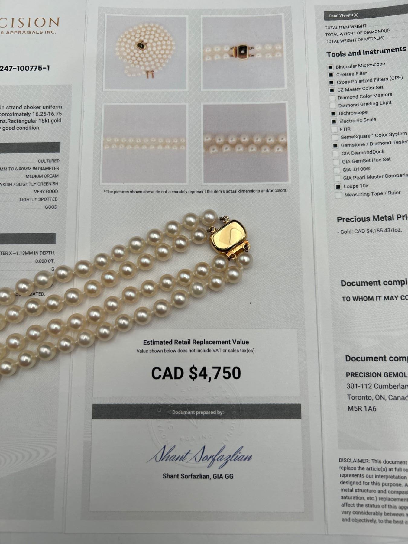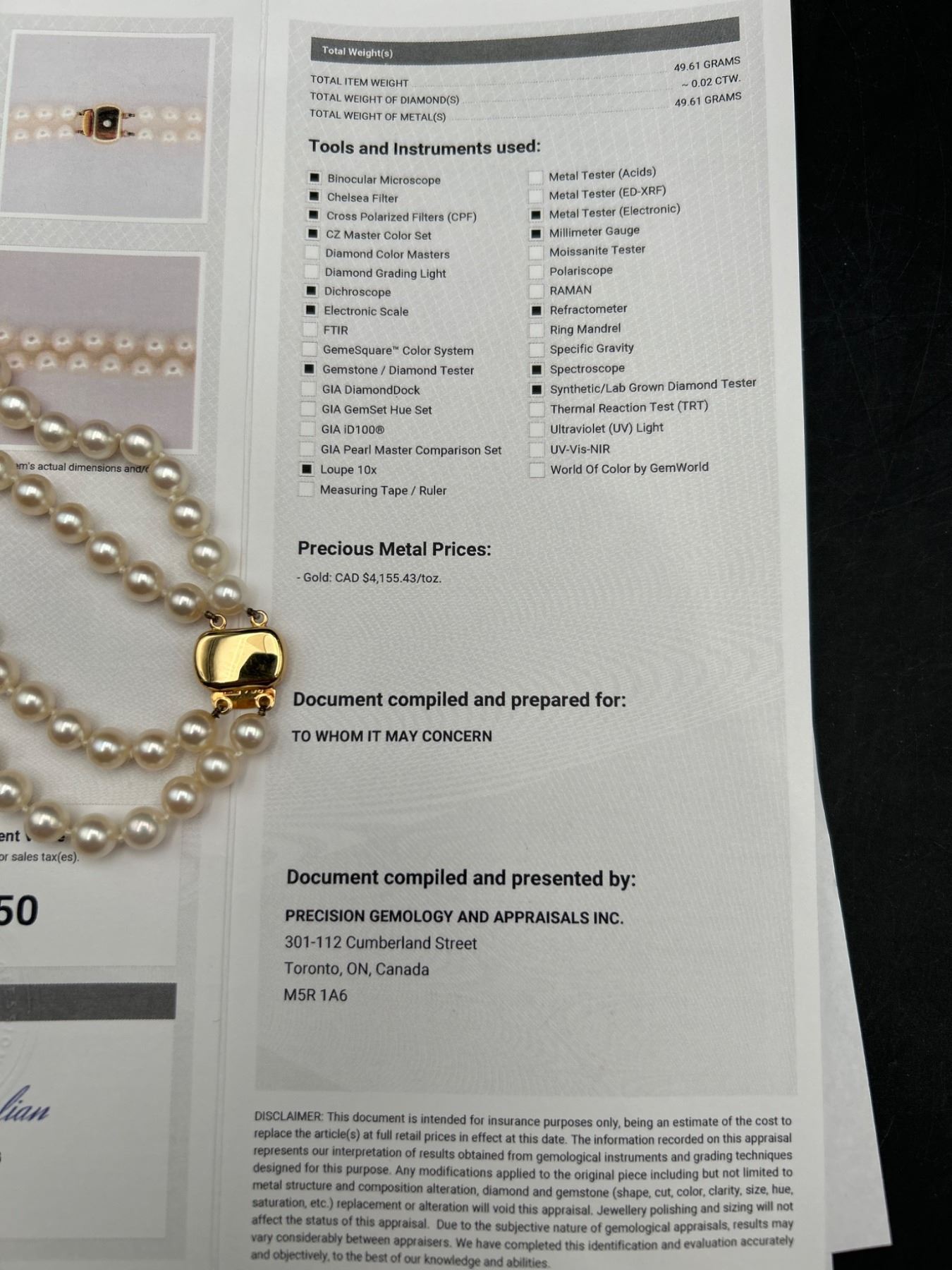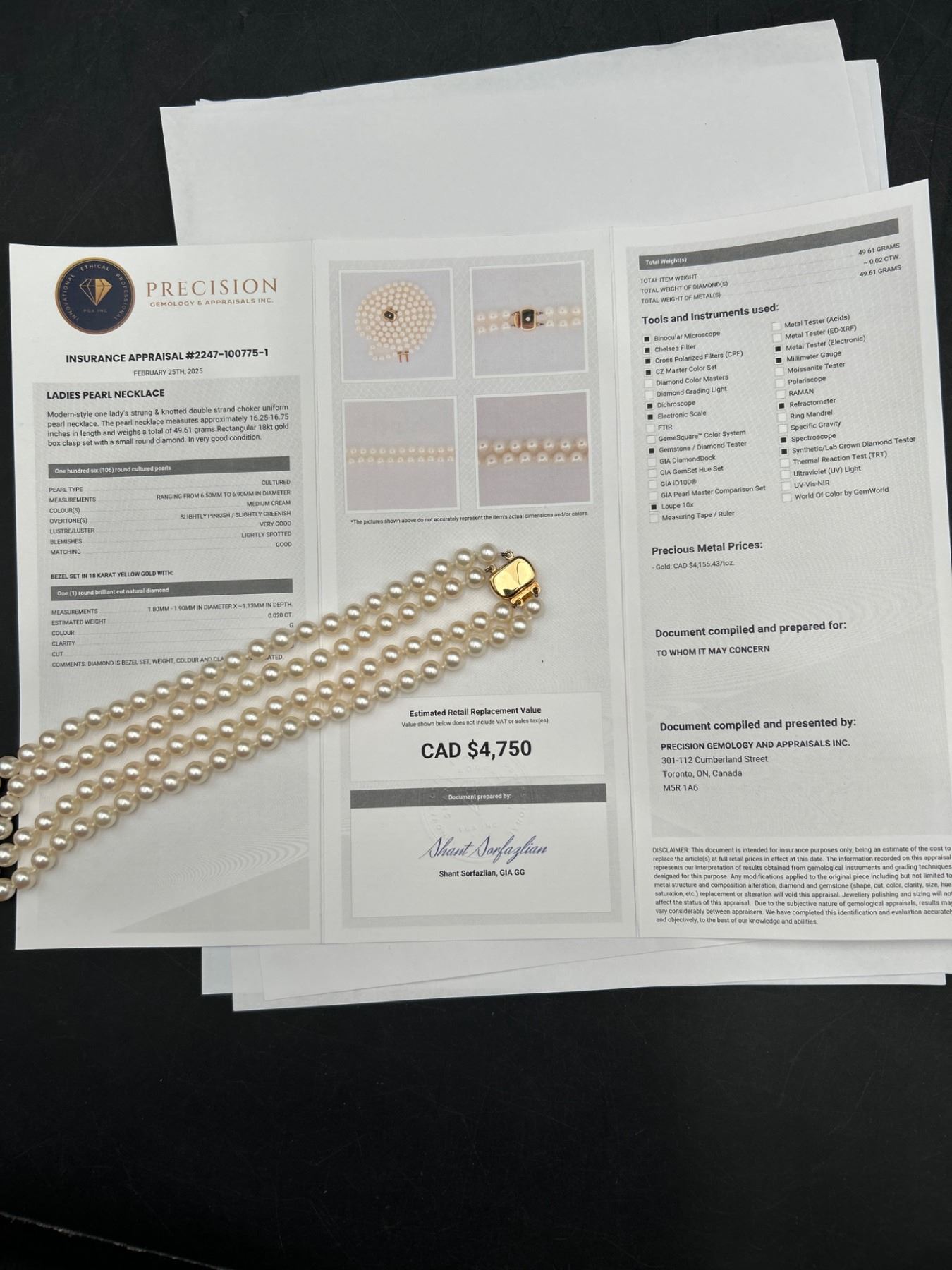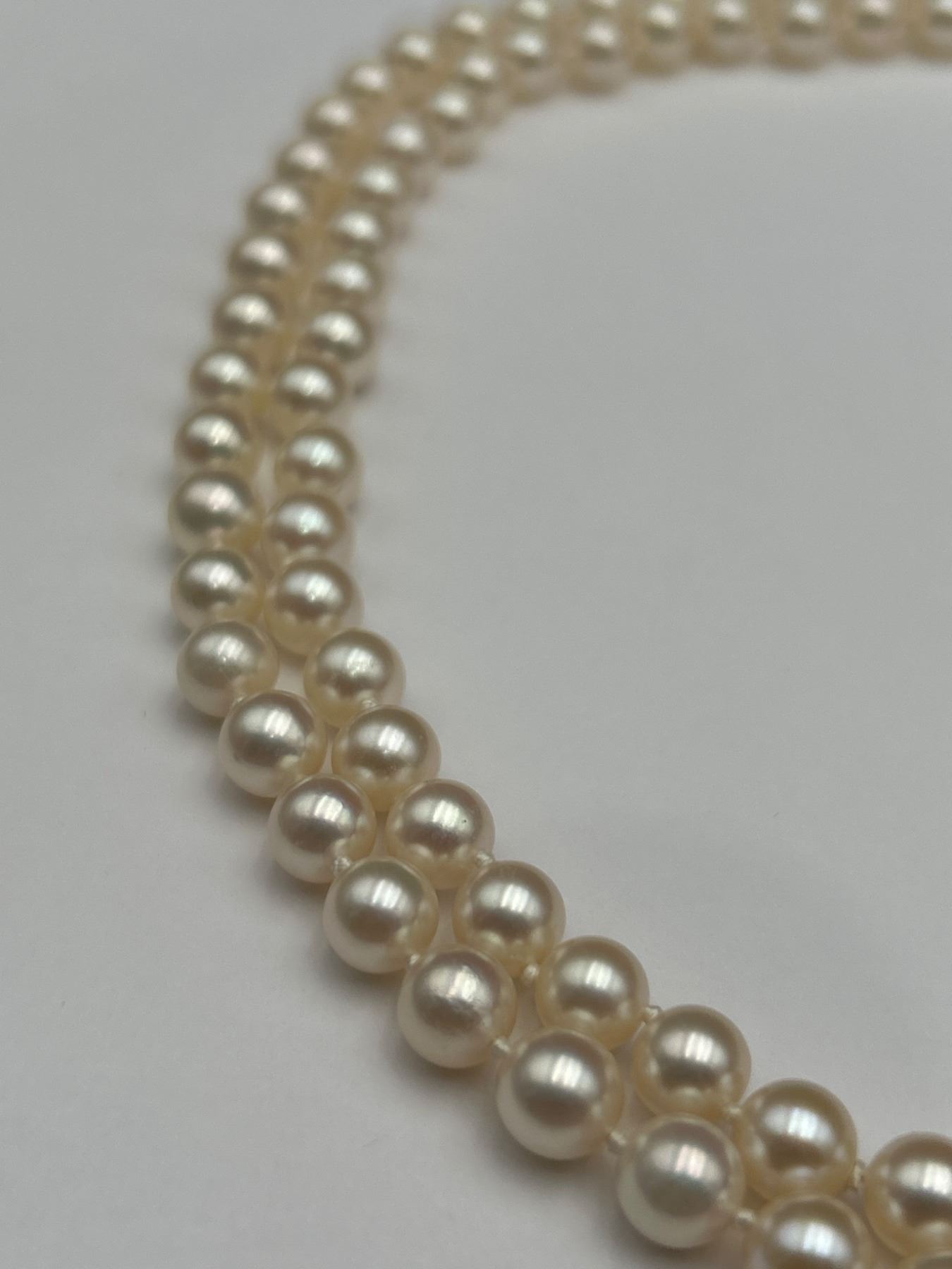 This lot features a ladies double-strand necklace of cultured pearls, including a total of 106 pearls The necklace is equipped with a 14-karat yellow gold clasp, weighing a total of 49.60 grams. The pearls exhibit good luster, surface quality, and roundness. This necklace is appraised by Precision Gemology & Appraisals Inc. with an estimated retail replacement value of CAD 4,750.