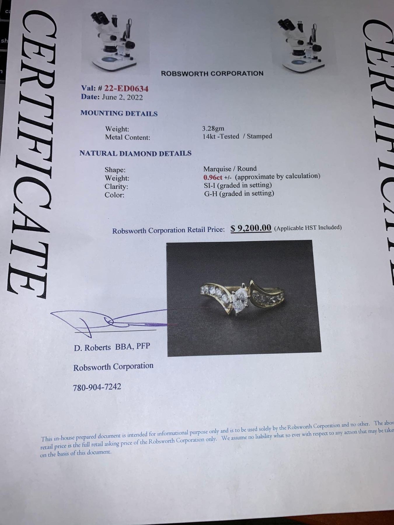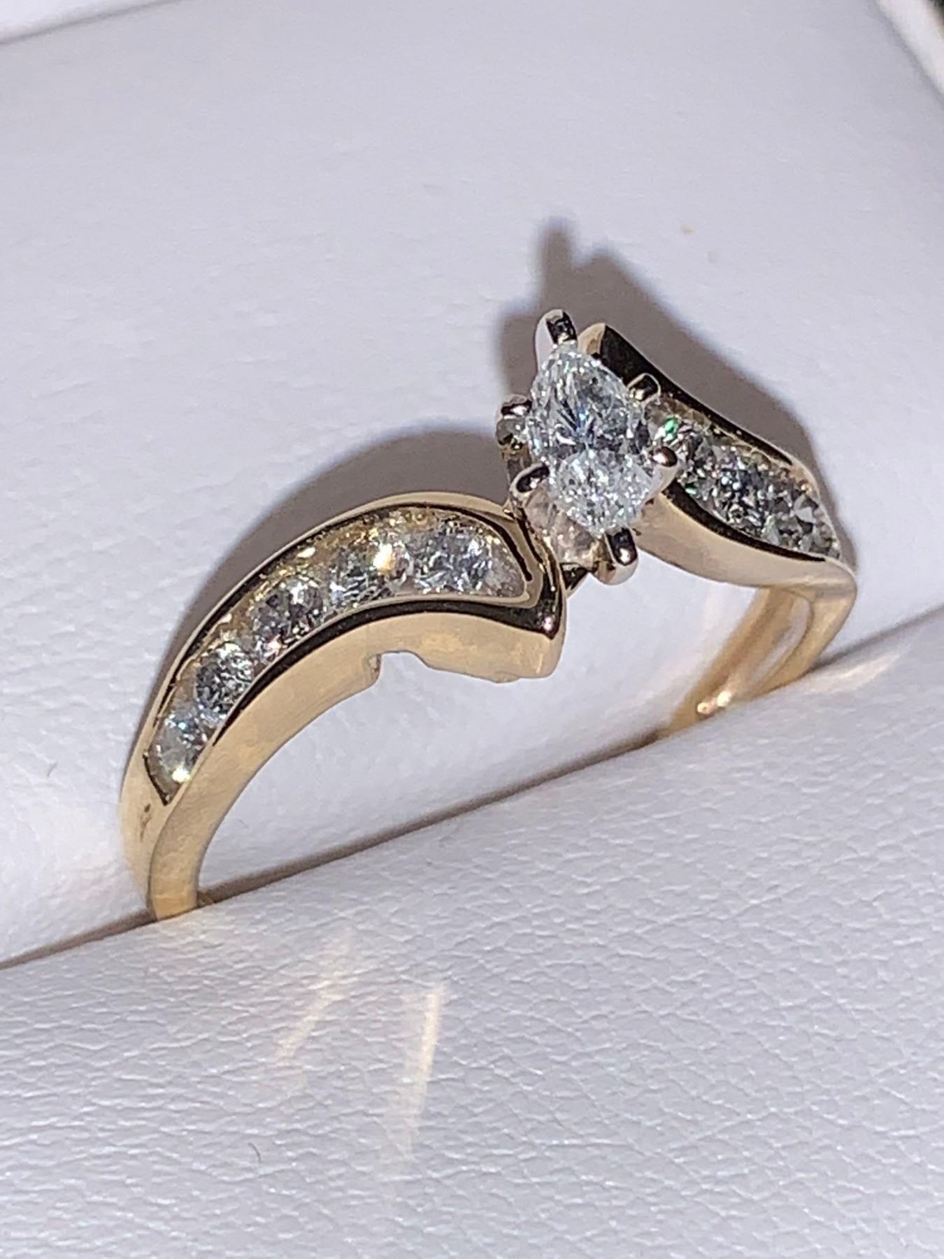 Ladies Marquis Cut .96 Carat Diamond ( SI-I, G-H) Ring set in 14K Gold certificate Value $9,200.00