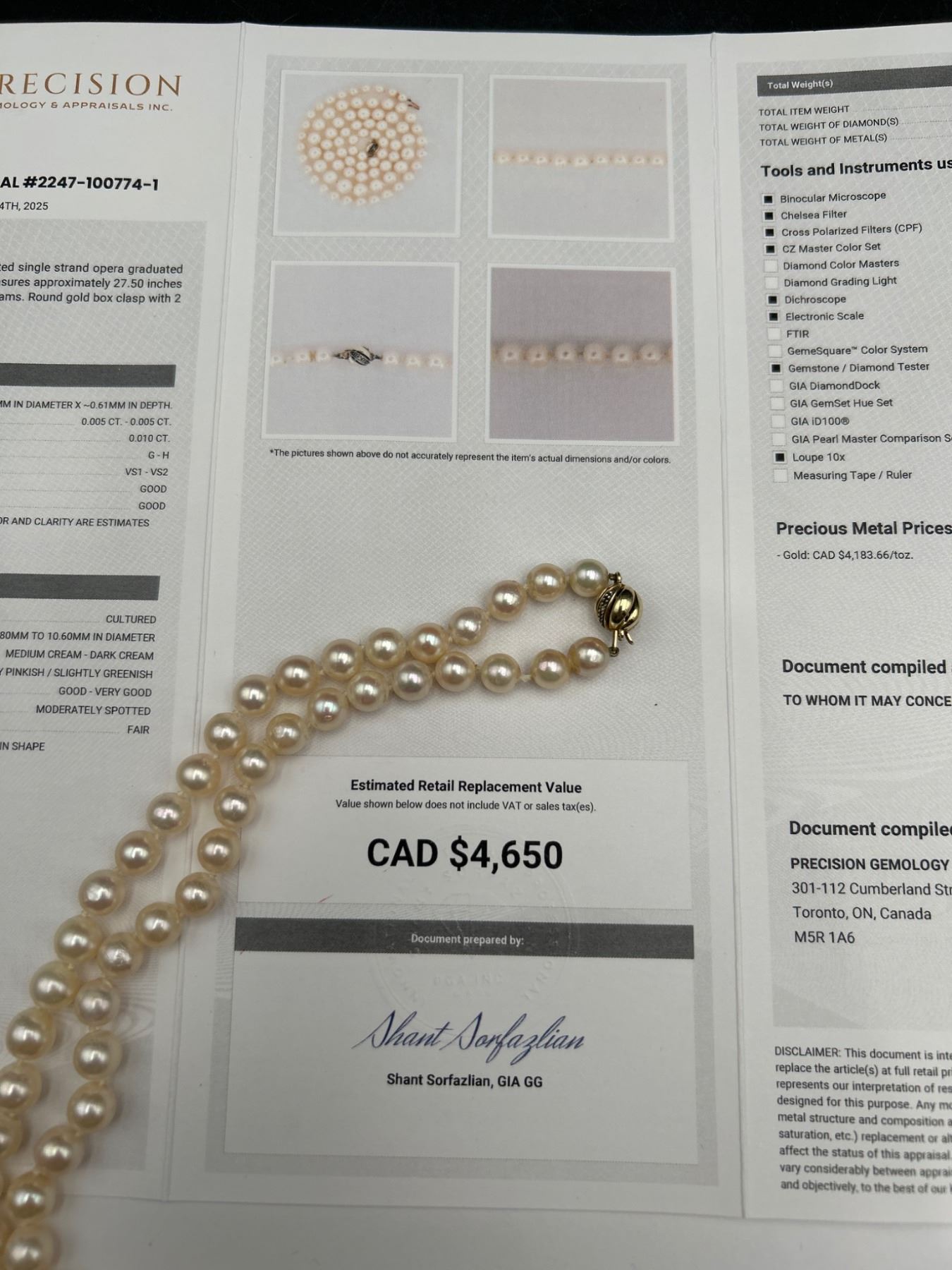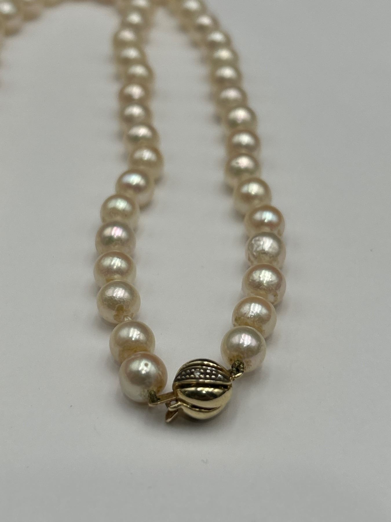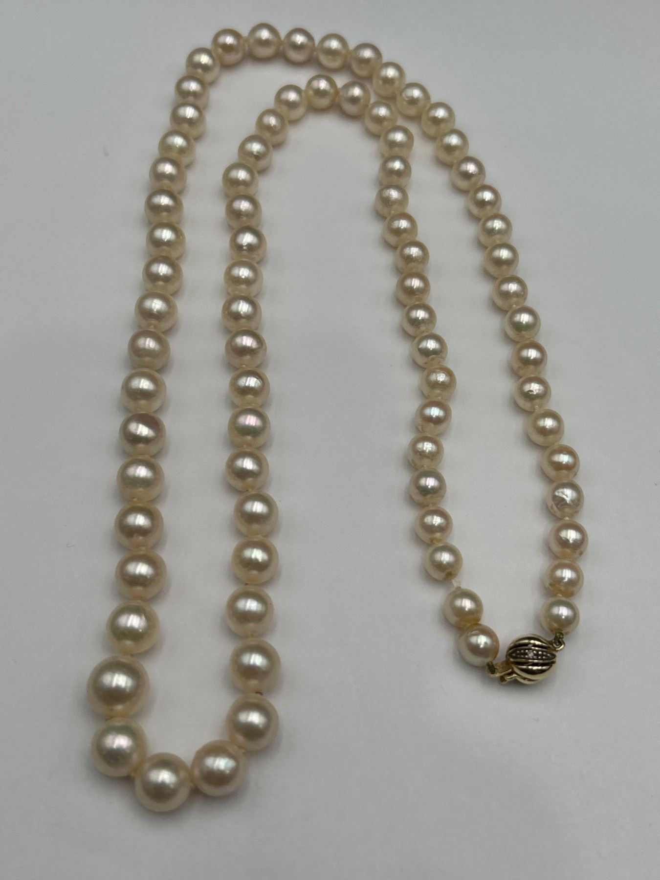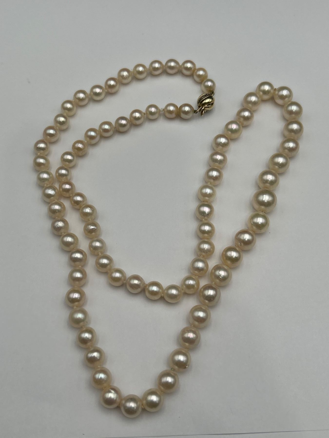 This is a ladies pearl necklace featuring a strand of individually knotted cultured oyster pearls. The necklace is secured with a 14K yellow gold clasp. Reportedly measuring 18 inches in length, the estimated retail replacement value noted is CAD $4,650. Pearl quality and integrity look consistent with a moderately spotted surface grading.