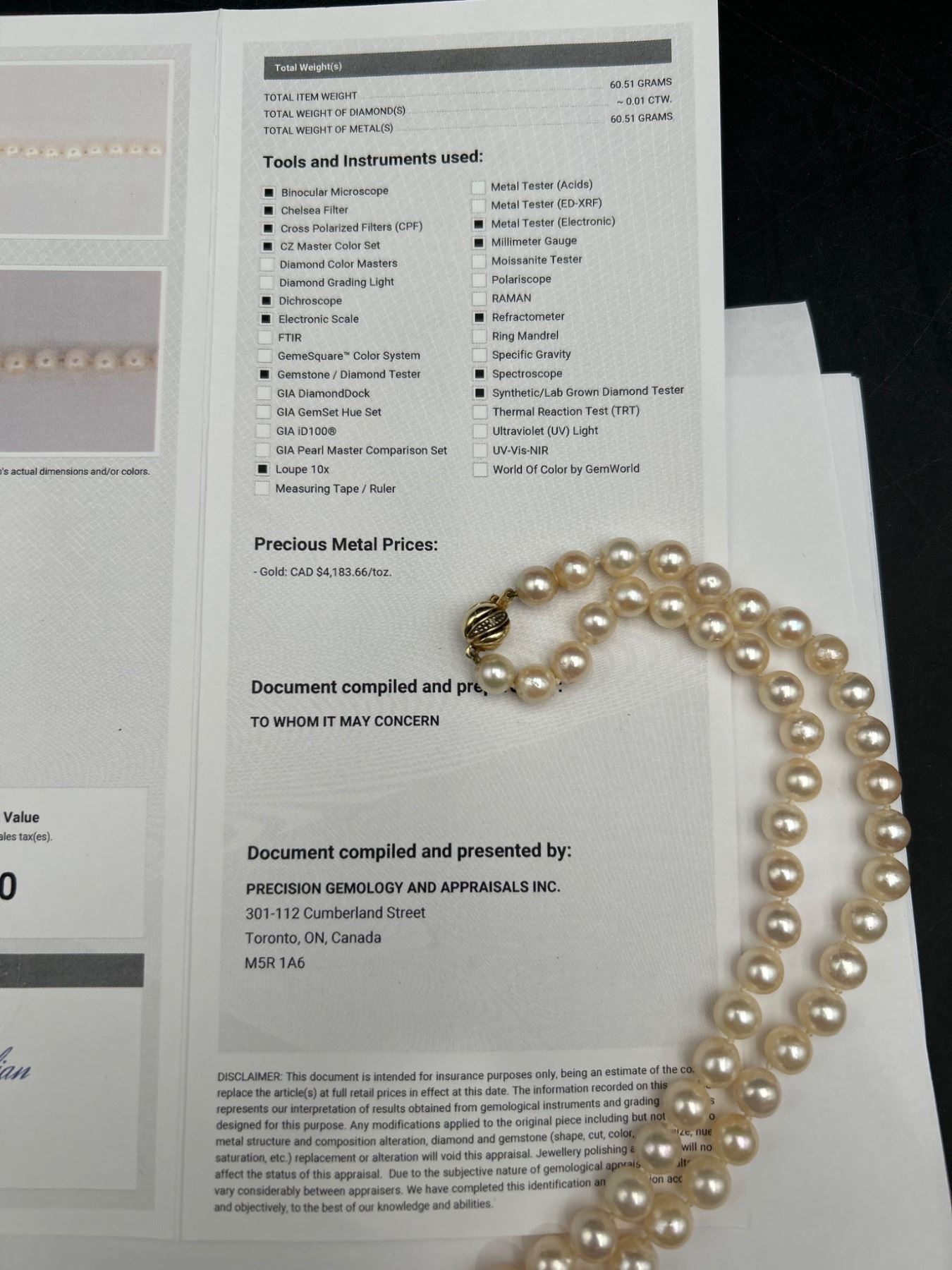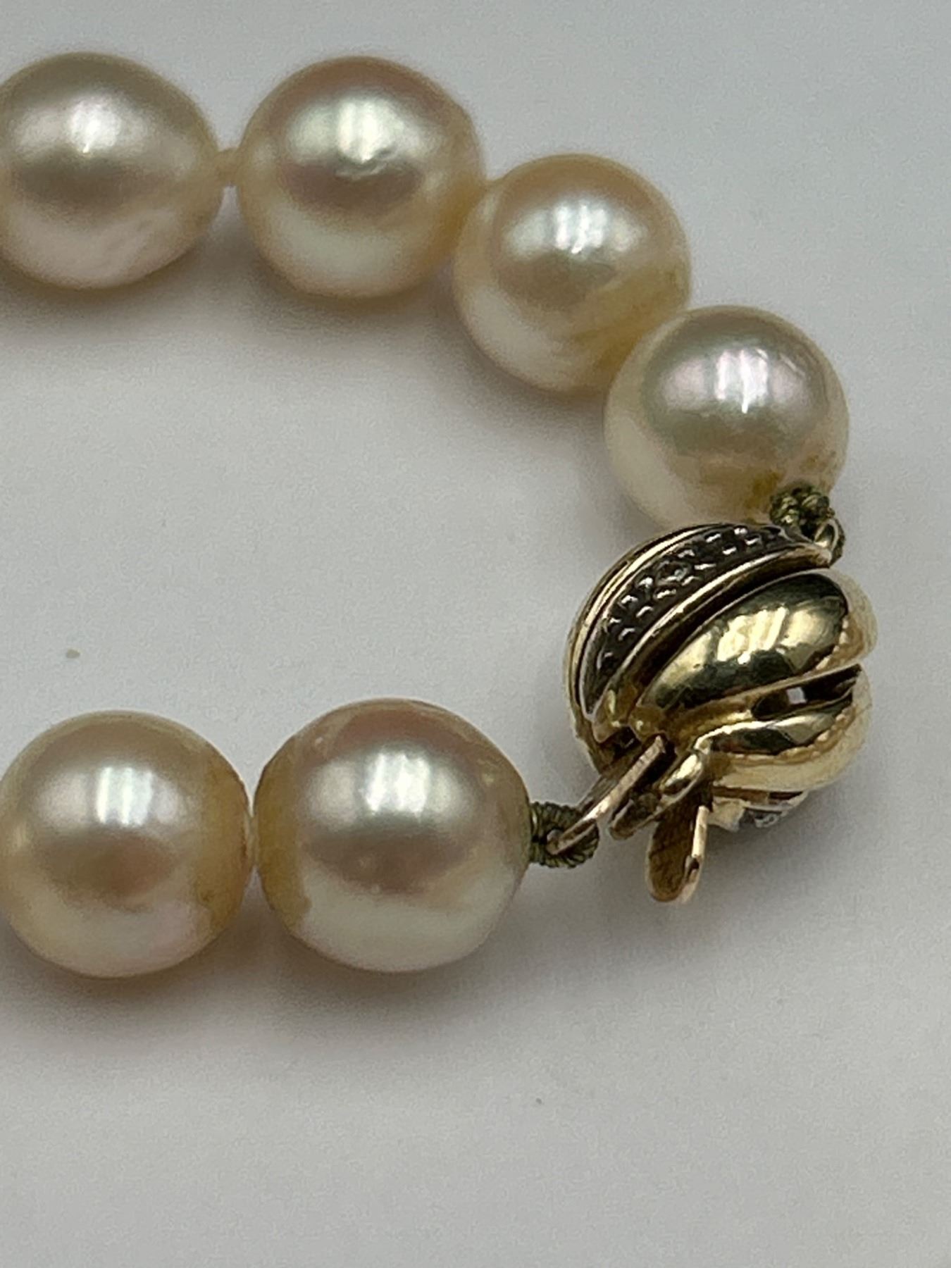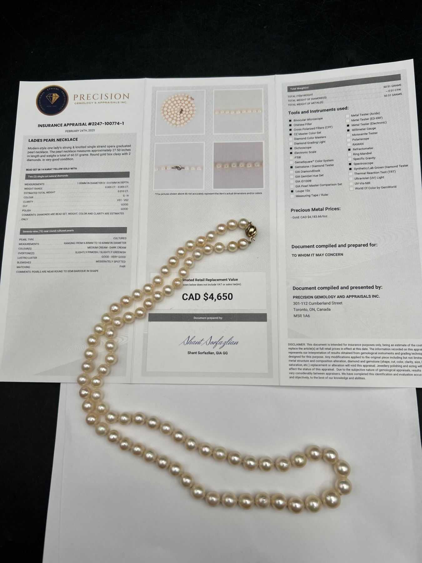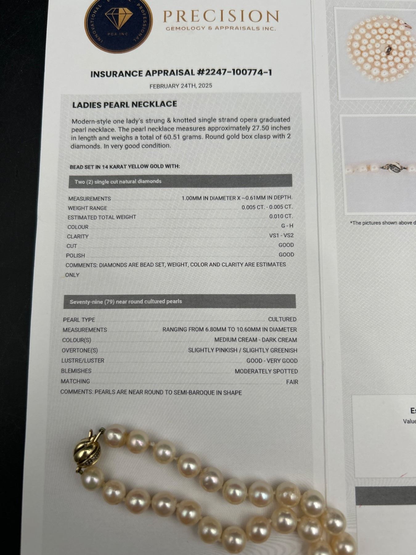 This is a ladies pearl necklace featuring a strand of individually knotted cultured oyster pearls. The necklace is secured with a 14K yellow gold clasp. Reportedly measuring 18 inches in length, the estimated retail replacement value noted is CAD $4,650. Pearl quality and integrity look consistent with a moderately spotted surface grading.